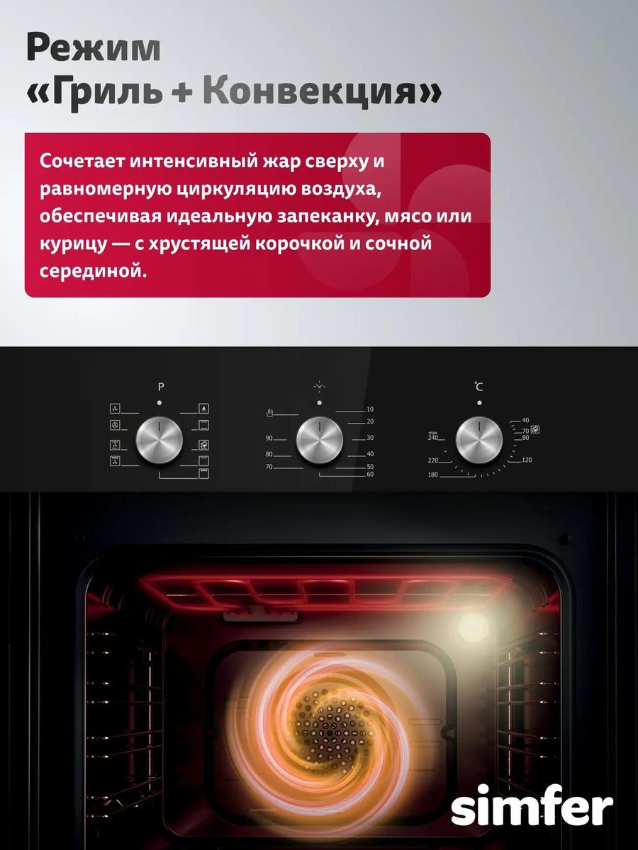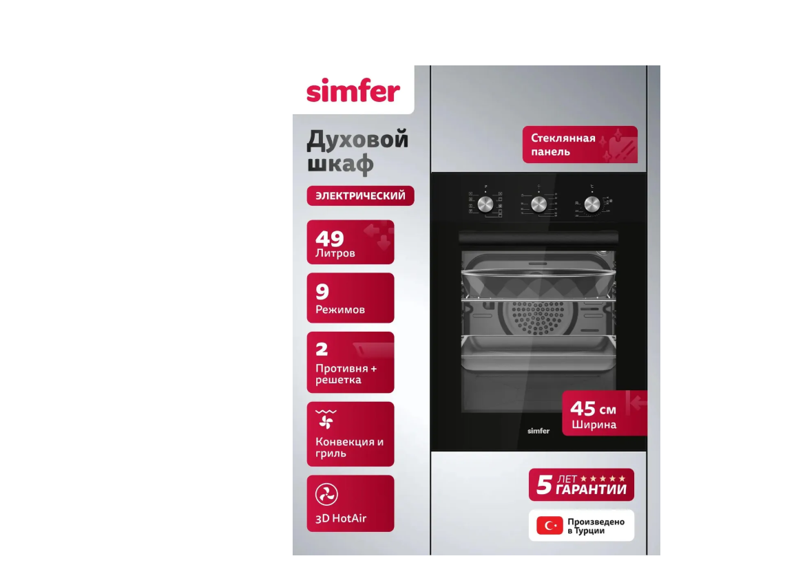 Описание Духовой шкаф Simfer B4ES19125 Особенности: 9 режимов работы: Верхний + нижний нагрев, Верхний нагрев, Нижний нагрев, Гриль, Гриль + конвекция, Конвекция, Турбо режим, Верхний + нижний нагрев + конвекция. 3D конвекция и гриль: Для идеальной приготовки пищи с равномерной подачей тепла. Таймер на отключение и звуковой сигнал: Удобство использования и безопасность приготовления. Подсветка духовки: Галогеновая подсветка обеспечивает четкость видимости внутреннего пространства. Стеклянная панель управления- эстетичный внешний вид и легкость очистки. Очистка паром: Простота и удобство в уходе за духовкой.
