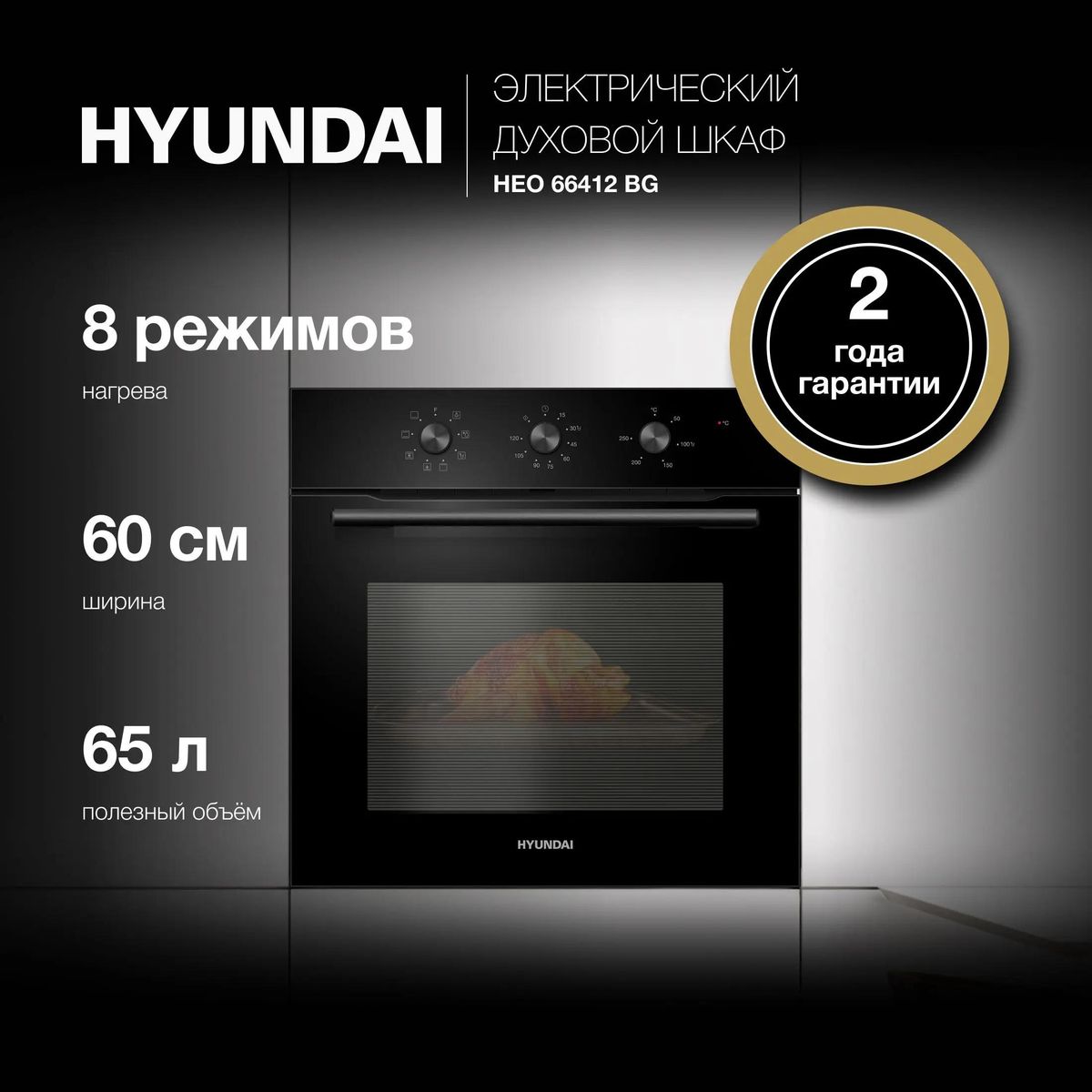 Описание Духовой шкаф Hyundai HEO 66412 BG Для современного человека важно, чтобы кухня была функциональной, практичной и органично сочеталась с интерьером помещения. Духовой электрический шкаф Hyundai HEO 66412 BG благодаря своему черному цветовому исполнению выгодно подчеркнет дизайн и придаст кухне выразительность. Духовой электрический шкаф Hyundai HEO 66412 BG независимый – можно установить его на кухне там, где Вам это будет удобно, без привязки к варочной поверхности. В духовом шкафу предусмотрено 8 программ для приготовления любых блюд, а также много практичных решений, которые сделают процесс приготовления легче и удобнее: Подсветка внутри духового шкафа позволяет наблюдать и контролировать процесс приготовления блюд; Конвекция и другие режимы сэкономят Ваше время на приготовление; Объем духового шкафа 65 л. позволяет готовить даже очень большие блюда; Дверца с 2 стеклами внутри защищает от вероятности получения ожогов;