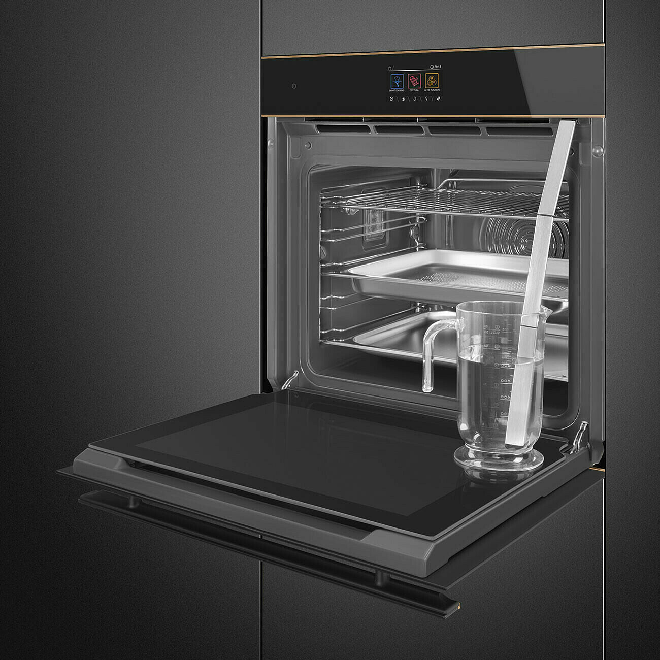 Описание Духовой шкаф Smeg SO6604S4PNR Электрический духовой шкаф Smeg SO6604S4PNR – это современное и функциональное устройство, которое станет незаменимым помощником на вашей кухне. Дизайн и управление: духовой шкаф выполнен в классическом черном цвете, который легко впишется в любой интерьер. Отличительной особенностью является медный профиль, который придает устройству особый шарм и стиль. Управление осуществляется с помощью сенсорного TFT-дисплея, что делает процесс выбора режимов и настроек быстрым и удобным. Режимы и функции: духовой шкаф Smeg SO6604S4PNR предлагает 20 различных режимов приготовления, включая конвекцию, что позволяет готовить разнообразные блюда с равномерным прогревом. 150 автоматических программ облегчат процесс приготовления, а звуковой таймер и отложенный старт помогут контролировать процесс приготовления. Уход и очистка: эмаль Ever Clean и паровая очистка делают уход за камерой устройства простым и быстрым. Благодаря этому, духовой шкаф будет служить вам долгие годы, сохраняя свою первоначальную привлекательность. Безопасность и энергоэффективность: тангенциальное охлаждение и блокировка управления от детей обеспечивают безопасность использования. Класс энергопотребления A++ говорит о высокой энергоэффективности устройства, что позволит вам экономить на счетах за электроэнергию. Комплектация и габариты: в комплект духового шкафа входят глубокий эмалированный противень, решетка для противня и два противня из нержавеющей стали. Выбирая духовой шкаф Smeg SO6604S4PNR, вы получаете современное, функциональное и безопасное устройство, которое станет незаменимым помощником на вашей кухне.
