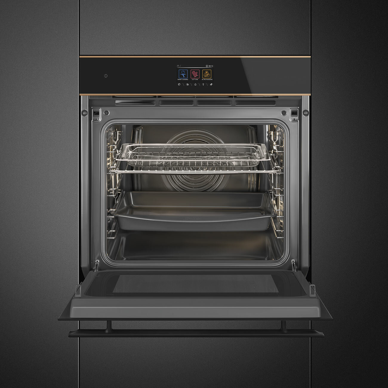 Описание Духовой шкаф Smeg SO6604M2PNR Духовой шкаф SMEG SO6604M2PNR — это высококачественное и функциональное оборудование, которое воплотило в себе передовые технологии и элегантный дизайн. Изготовленный в Италии, он представляет собой сочетание черного цвета и медной фурнитуры, что придает ему стильный и современный вид. Сенсорные переключатели и цифровой дисплей делают управление удобным и интуитивно понятным. Электронный контроль температуры позволяет точно установить нужный режим, а звуковой сигнал и функция отложенного старта делают процесс приготовления еще более комфортным. С шириной 60 см и полезным объемом 68 литров, техника предлагает достаточно пространства для приготовления различных блюд. Внутренняя камера, покрытая эмалью Ever Clean, обеспечивает легкую очистку и долговечность. Прибор оснащен 20 функциями приготовления, включая верхний и нижний нагрев, конвекцию, турборежим и многие другие. Функция «Пицца» и автоматические программы облегчают приготовление этого популярного блюда, а функция размораживания позволяет быстро и эффективно разморозить продукты. Особенностью является использование микроволн, что позволяет сократить время приготовления и сохранить полезные свойства продуктов. Кроме того, он оснащен функцией поднятия теста и дополнительными опциями, такими как аэрогриль, барбекю и поддержание тепла. Система плавного закрытия дверцы SoftClose предотвращает случайные удары и шум при закрытии, а внутреннее стекло, выполненное в черном цвете, придает элегантный вид. Благодаря телескопическим направляющим и наличию термощупа, приготовление становится еще более удобным и простым. В общем, данная модель — это идеальное решение для тех, кто ценит качество, функциональность и стиль в бытовой технике. Ключевые преимущества Высококачественное итальянское производство. Множество функций приготовления и автоматических программ. Элегантный дизайн и простота в использовании.