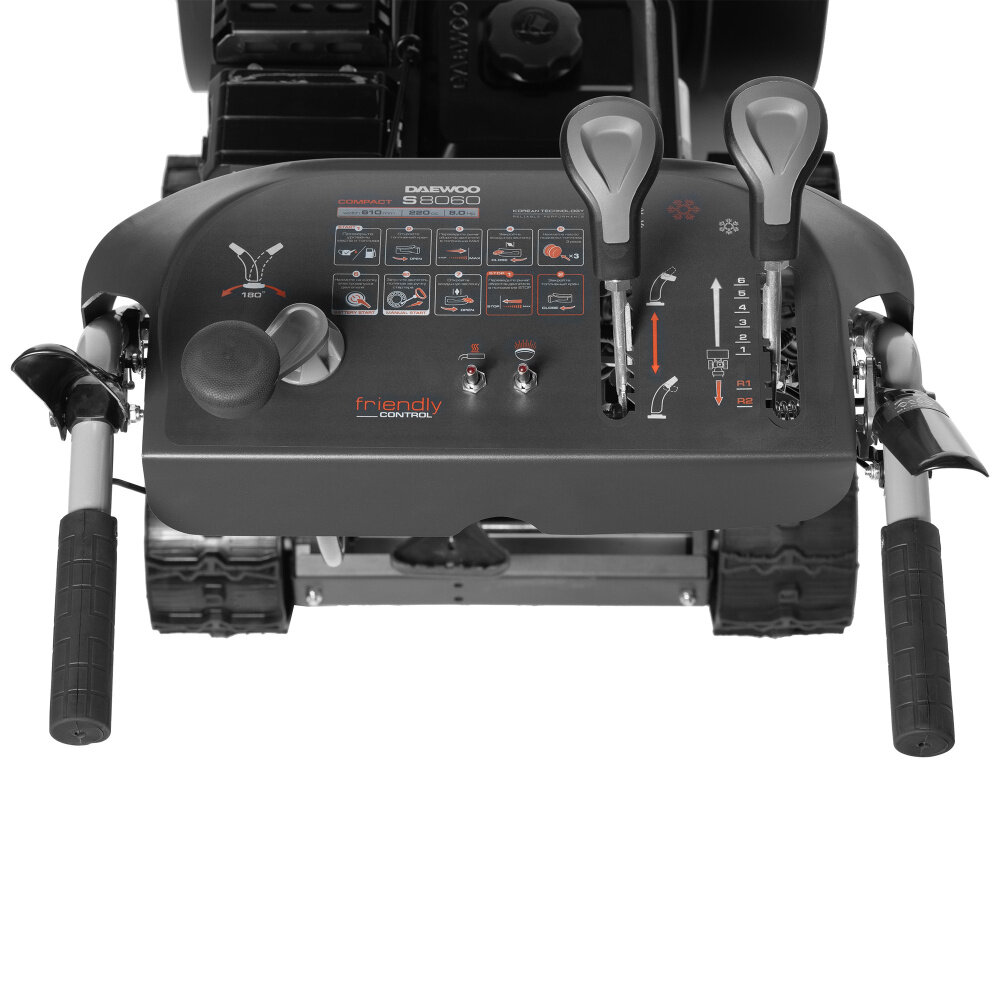 Уникальные гусеницы EX‑TRACK Гусеничный привод с автоматической системой блокировки дифференциала обеспечивает высокую маневренность и проходимость при работе на склонах и обледенелых поверхностях. Трансмиссия DISC-O-MATIC 6+2 Система обеспечивает выбор скоростей: 6 скоростей вперед и 2 скорости назад, в зависимости от высоты снежного покрова. Простая и одновременно надежная система перемещения фрикционного диска для изменения скорости. Электрозапуск от аккумулятора 21В Запуск двигателя путем нажатия кнопки Start. Питание от аккумулятора DAEWOO 21 В. Легкий запуск в любые морозы и возможность использования аккумулятора с инструментом линейки DAEWOO 21В. Два режима работы снегоуборщика Транспортировочный режим - для перемещения снегоуборщика во внерабочем положении, и универсальный режим - основной вес снегоуборщика приходится на гусеницы. Агрессивные шнеки-ледорубы Агрессивные шнеки-ледорубы предназначены для работы с различным типом снега, вплоть до слежавшегося и обледенелого. Измельчая снег, шнеки подают его на крыльчатку выброса. 2-х сторонние направляющие лыжи 2-х сторонние направляющие лыжи позволяют регулировать высоту ковша над поверхностью в зависимости от высоты снежного покрова и типа убираемой поверхности, тем самым, избегая ее повреждения. Система изменения направления выброса Изменение угла выброса на 180 градусов дает возможность мгновенно изменять направление и дальность выброса снега непосредственно с панели оператора. Взаимная блокировка рукояток При зажатии обеих рукояток происходит их взаимная блокировка. Это позволяет управлять снегоуборщиком даже одной рукой, в том числе изменять направление выброса снега без остановки работы. Усиленный редуктор Усиленный редуктор передает до 95% крутящего момента двигателя. Срезные болты на шнеках защищают редуктор от перегрузок. Выходной вал редуктора крепится на подшипниках большого диаметра, что обеспечивает высокую устойчивость механизмов к вибрации и ударам. LED фара Яркая LED фара обеспечивает освещение рабочей зоны перед машиной, помогая работать в темное время суток. Держатель троса Обеспечивает надежное крепление троса поворота желоба и исключает его повреждения о горячие части двигателя.