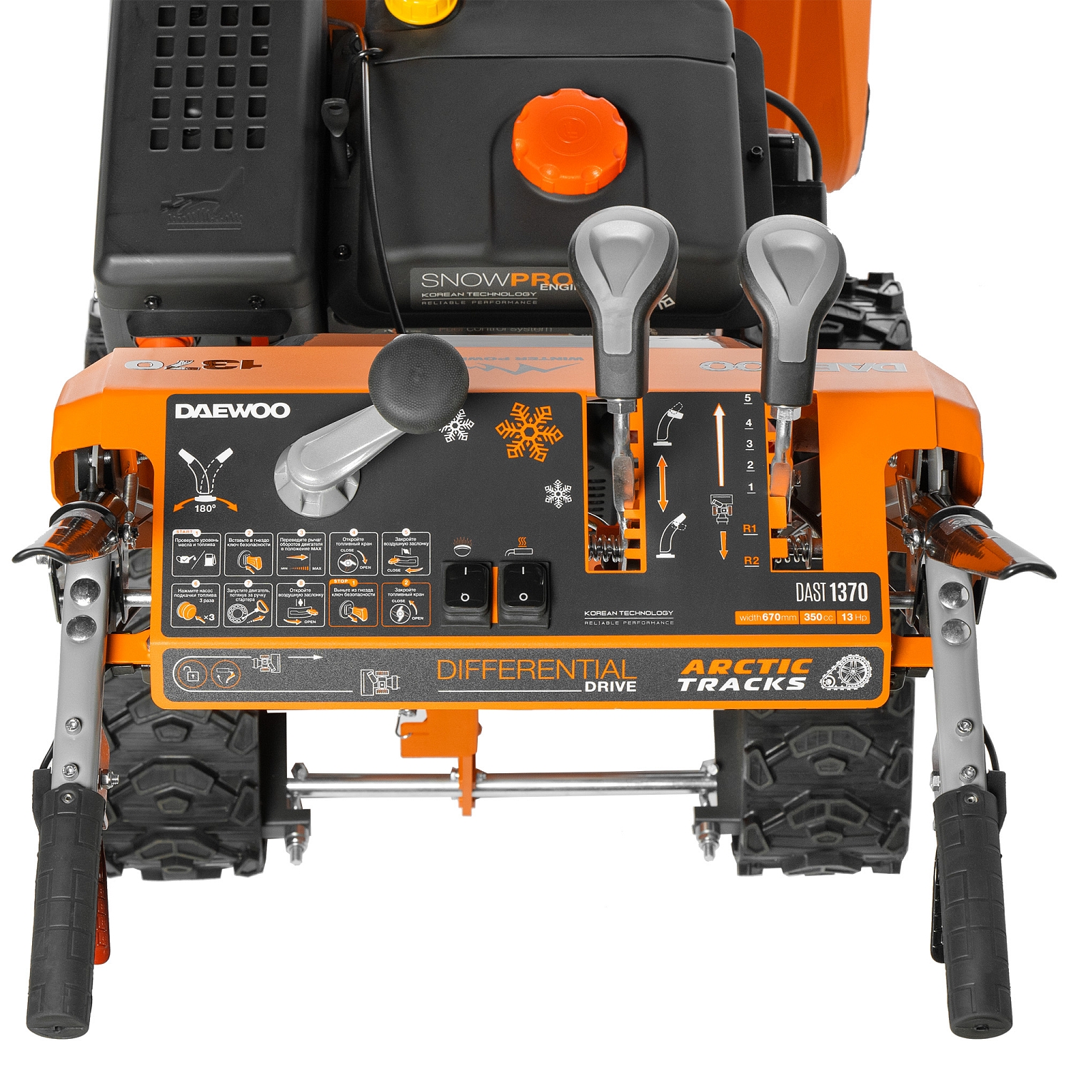 Описание Снегоуборщик Daewoo DAST 1370 Двигатель DAEWOO зимней серии 350 winter Уверенный запуск при отрицательных температурах. Повышенный моторный ресурс. Увеличенный глушитель и сниженный уровень шума. Вместительный топливный бак на 3.5 литра.