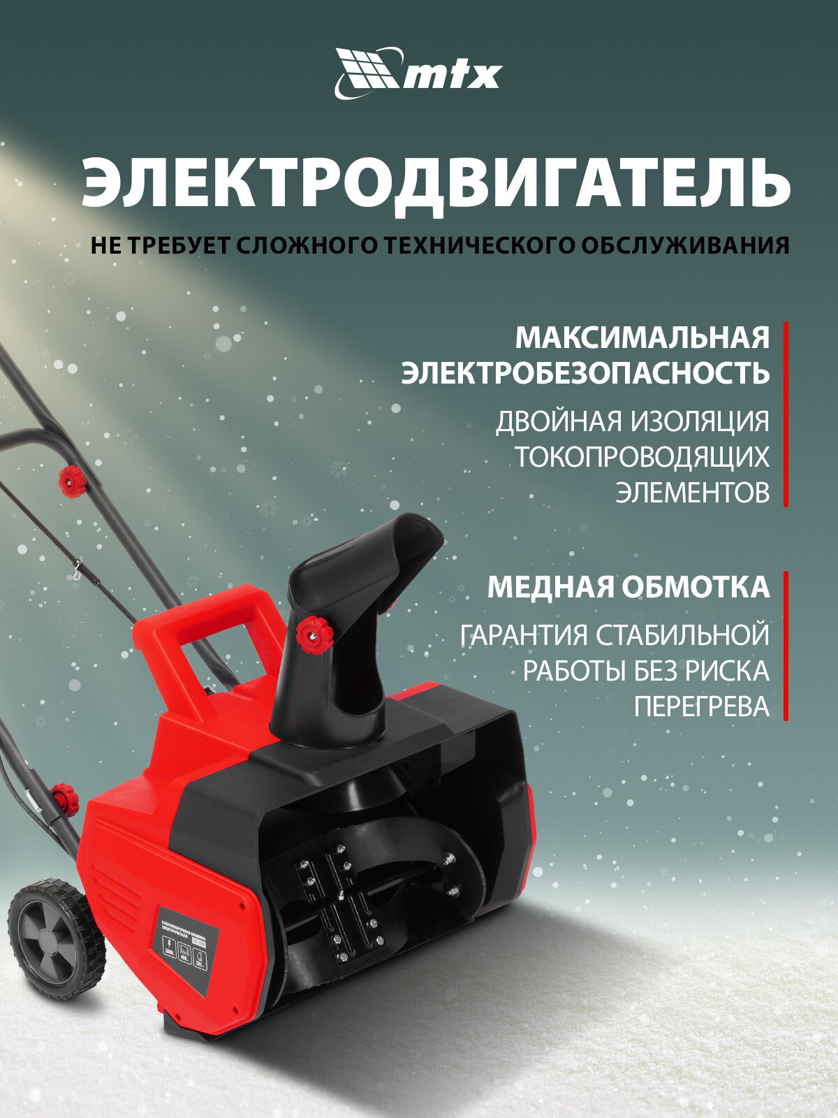 Описание Снегоуборщик MTX EST-2000 [97622] Электрическая снегоуборочная машина MTX EST-2000 мощностью 2 кВт облегчит уборку территории после легкого снегопада. Работает от электрической сети, поэтому не производит шума и опасных выхлопов. Электродвигатель не требует сложного технического обслуживания. Преимущества: Надежный двигатель — медная обмотка гарантирует стабильную работу машины без риска перегрева. Максимальная электробезопасность — предусмотрена двойная изоляция токопроводящих элементов. Эффективная работа — в зависимости от размера территории можно установить дальность выброса снега до 9 м, а также отрегулировать угол поворота выпускного желоба в пределах 180°. Высокопрочный шнек из армированной резины — машина прослужит долгое время без риска поломок и повреждения декоративного покрытия на участке. Комфортное использование — термоизолирующее вспененное покрытие рукоятки поглощает вибрации и позволяет работать без перчаток. Маневренность — машина весит 13 кг и имеет небольшие размеры 48,5 х 100 х 102 см. Удобное хранение и транспортировка — благодаря складной рукоятке снегоуборщик не занимает много места.