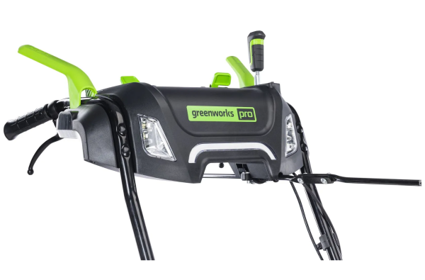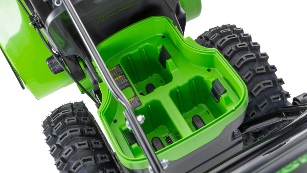 Преимущества Greenworks GD82ST56 Аккумуляторный снегоуборщик Greenworks движется самостоятельно вперед и назад. При включении заднего хода звучит предупредительный сигнал. На панели оператора расположены все необходимые элементы управления — переключатели скорости движения и вращения шнека, рычаги настройки дальности выброса снега и кнопки включения фар. Разгрузочный желоб можно поворачивать на 200° при помощи удобной рукоятки. Функция разблокировки колес позволяет без усилий разворачивать машину на месте. Прикрепленный к ковшу инструмент «3 в 1» — лопатка, щетка и скребок — помогает удалить засоры, смахнуть снег, очистить снегоуборщик от наледи. Высокая производительность На ковш можно установить регулируемые по высоте боковые резаки. Они обрушивают сугробы и прорезают ледовую корку, облегчая захват снега. Высота скребка над землей регулируется в зависимости от неровности очищаемой поверхности посредством перестановки опорных лыж. Пять скоростей вращения шнека позволяют выбрать необходимый темп уборки с учетом плотности снежной массы. Продолжительная работа Батарейный отсек с водонепроницаемой крышкой рассчитан на установку трех аккумуляторов. Когда в одном из них заканчивается энергия, подключается следующий. Индикатор батареи показывает уровень оставшегося заряда. Бесщеточный двигатель снегоуборщика Greenworks GD82ST56 отличается экономным расходованием заряда и долговечностью.