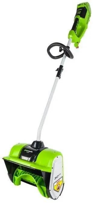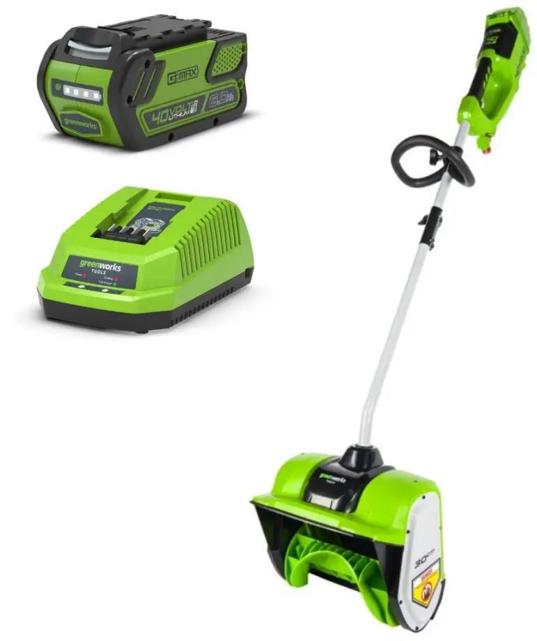 Описание Снегоуборщик GreenWorks GD40SSK5 [2600807ug] Аккумуляторный снегоуборщик GREENWORKS GD40SSK5 - беспроводной инструмент для очистки снега, который станет вашим надежным помощником в зимний сезон. Прибор с бесщеточным двигателем прослужит намного дольше моделей с щеточным приводом, а его мощности будет достаточно для качественной уборки а при самых неблагоприятных условиях. Характеристики прибора Аккумуляторный снегоуборщик – это современное и эффективное устройство, разработанное для быстрого удаления снега без особых усилий. Функционирует от аккумулятора 40V, заряда которого будет достаточно для 50 минут эксплуатации. Шнек инструмента изготовлен из пластика, который не только надежен в эксплуатации, но и безопаснее для тротуарной плитки или другого покрытия. Ширина захвата снежного покрова – 30 см, глубина – 15 см. Эти параметры оптимальные для эффективной очистки придомовой или садовой территории. Для безопасной работы оператора производителем была предусмотрена защита от ошибочного включения прибора. Преимущества GREENWORKS GD40SSK5 Малый вес – 6.8 кг. Легкость в управлении даже для подростков и людей с физическими ограничениями. Размеры, не требующие большой площади для хранения. Оснащение надежным двигателем DigiPro с большим ресурсом работы. Простое включение одним нажатием кнопки. Бережная, но эффективная очистка от снега. Электроприбор не требует сложного техобслуживания. Отсутствие выброса вредных веществ в процессе работы двигателя. Минимальный шум и вибрации при эксплуатации. Не требует дополнительных расходов на топливо. Работа от аккумулятора дает возможность передвигаться по территории без ограничения.