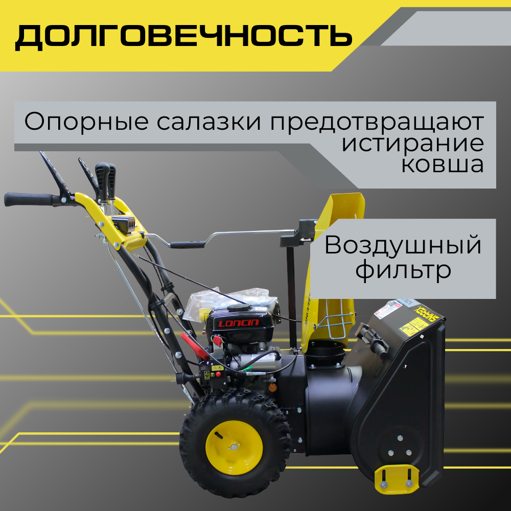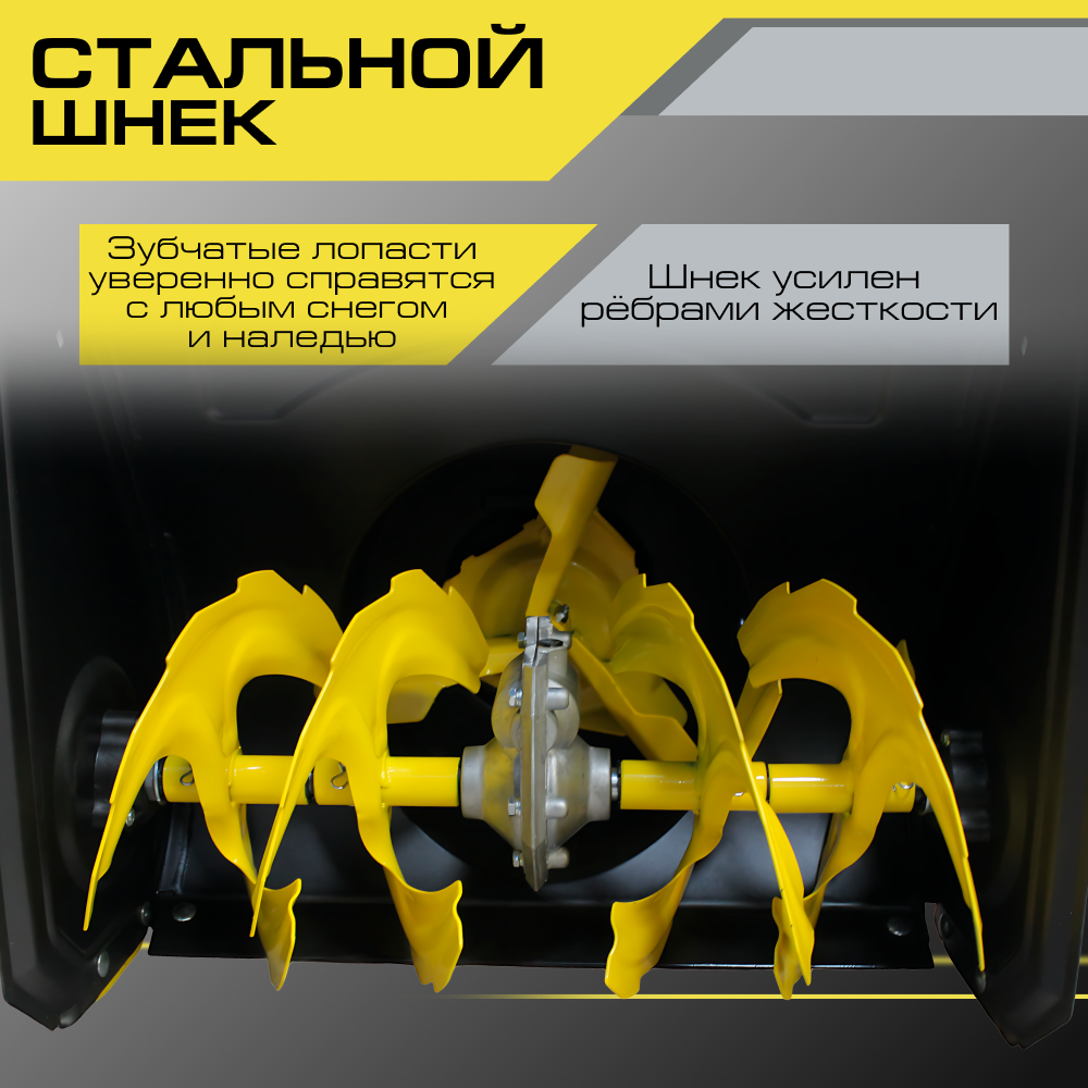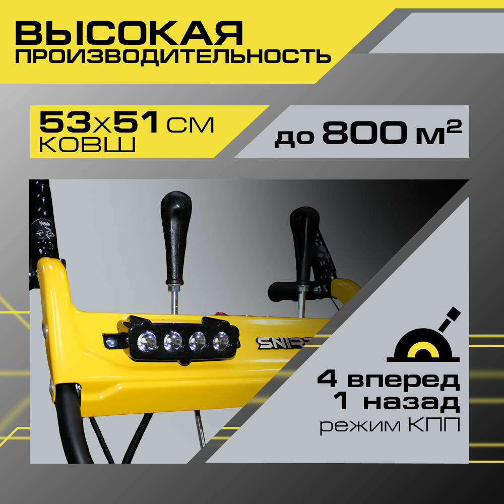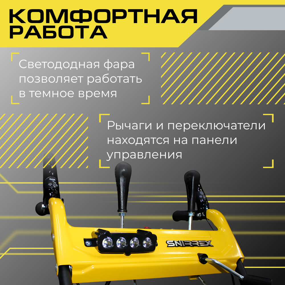 Описание Снегоуборщик Snirrex SLC 6556 FM Снегоуборщик Snirrex SLC 6556FM - самоходная техника для уборки снега. Бензиновая снегоуборочная машина оснащена 4-х тактным бензиновым двигателем мощностью 6,5 л. с. и объёмом 196 куб. см. Мотор рассчитан на работу при низких температурах до -25 градусов. Запуск производится при помощи ручного стартера. Зимний воздушный фильтр - внутри корпуса отсутствует поролоновый или бумажный элемент. Датчик контроля масла предупредит о необходимости пополнить бак. Топливный насос праймер для подкачки топлива оснащён большой кнопкой для использования в варежках. Особая форма протектора колёс облегчает управление техникой на льду, обеспечивает высокую проходимость и маневренность. Ручное управление поворотом и дефлектором желоба. Максимальная дальность управления выбросом не более 11 м. Для уборки снежного покрова в тёмное время суток снегоуборочная техника оснащёна светодиодной LED фарой. Органы управления находятся под рукой. Установить необходимый темп движения поможет ручка переключения скоростей 4 вперед / 1 назад. Перед началом работы отрегулируйте положение опорных салазок по обеим сторонам ковша. Настройка производится при помощи ключа. Стальные лопасти шнека усилены рёбрами жесткости, поэтому при попадании крупного льда или камня в рабочую зону не произойдёт деформации лопастей. Модель SLC 6556FM весом 52 килограмма самая компактная в линейке Snirrex. Рекомендована для работ: уборка снега на территории площадью до 800 квадратных метров.
