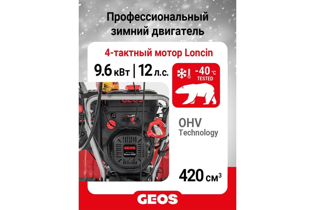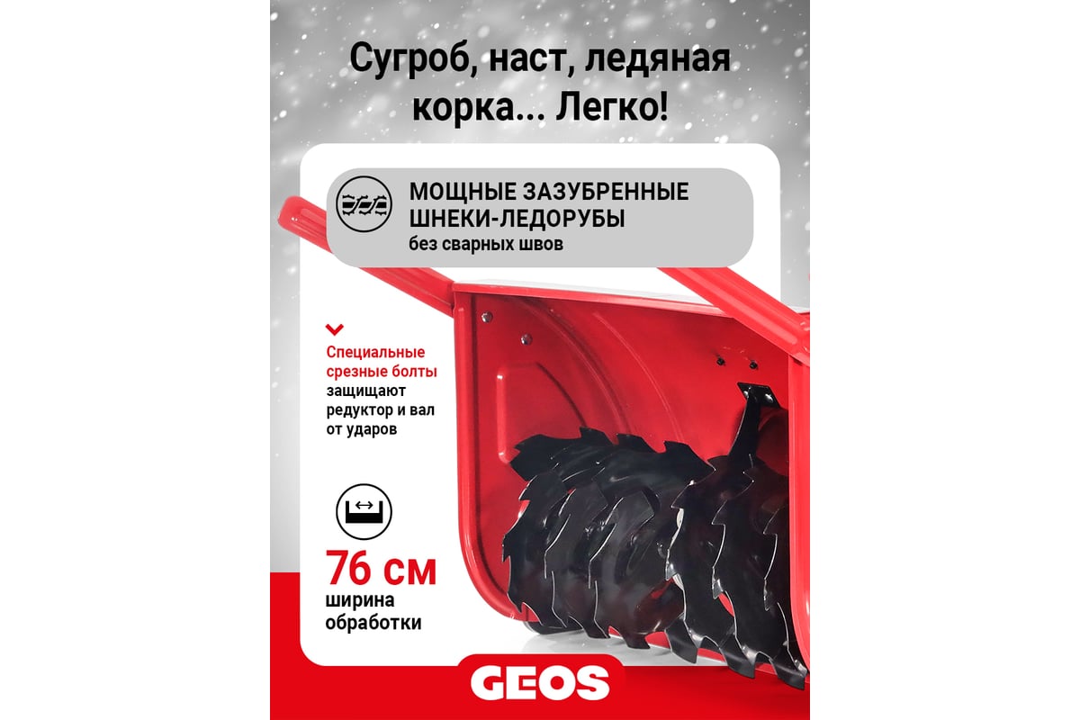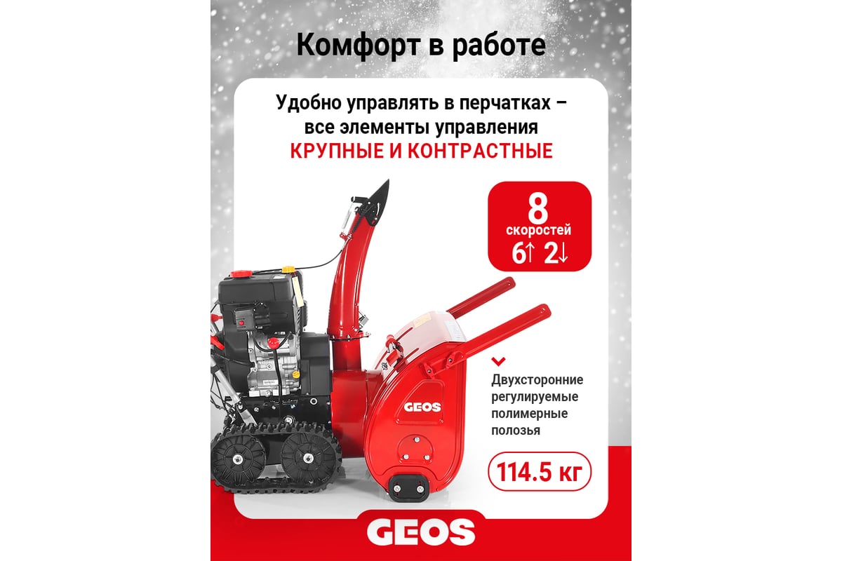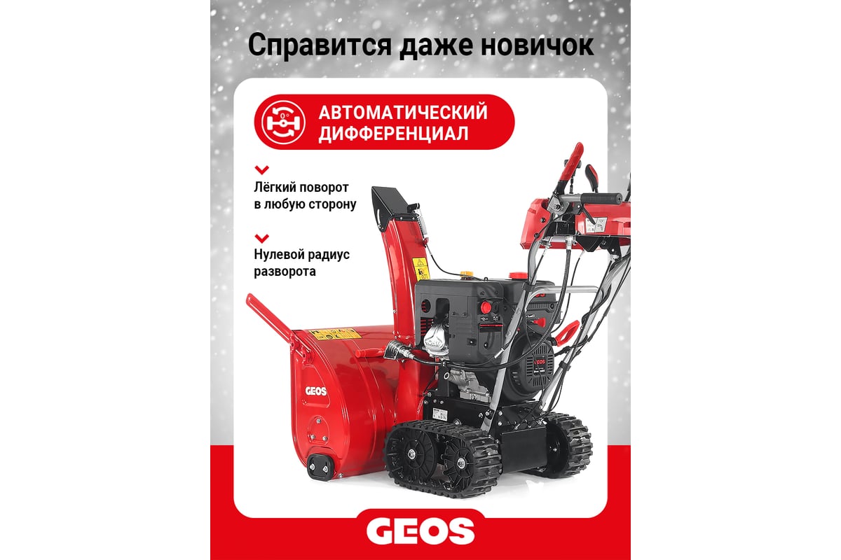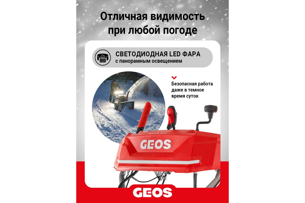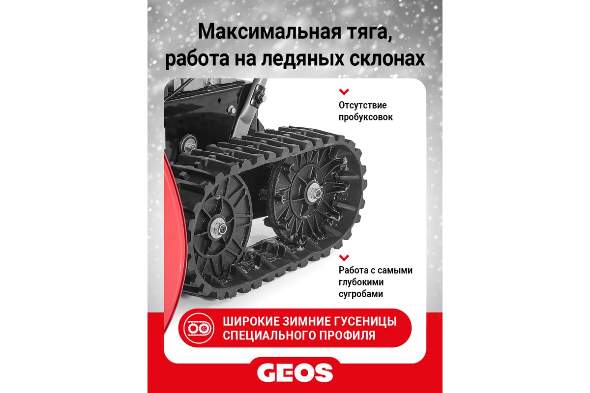 Описание Снегоуборщик GEOS Arctic Line 760TE [212985] GEOS Premium SnowLine 760TE — флагманская модель для профессиональной зимней уборки. Самый мощный в линейке гусеничный снегоуборщик с шириной захвата 76 см и производительностью 92 тонны в час. Создан для работы с самыми сложными снежными заносами и ледяными настами на больших территориях и в экстремальных условиях. Ключевые преимущества: Единый блок системы выхлопа и карбюратора. Подогревает карбюратор и поступающее в него топливо. Препятствует обледенению каналов и жиклеров карбюратора. В конструкции моноблока предусмотрен тепловой конвектор для аккумулирования тепла и испарения влаги. Зимний модуль зажигания. Усиленная толстая обмотка на катушке зажигания - увеличенное напряжение на свече. Изменен угол опережения зажигания - запуск двигателя с меньшими оборотами. Специальный карбюратор снегоуборщиков серии Arctic Line предназначены для работы при низких отрицательных температурах. Дозирующая игла квадратного сечения для минимизации пятна контакта. Корпус двигателя спроектирован так, что бы снег и талая вода не попадала на важные узлы. Специальные желобки и козырьки обеспечивают беспрепятственное стекание воды. GEOS Premium SnowLine 760TE — выбор для тех, кто работает в самых сложных зимних условиях. Сочетание гусеничной платформы, профессионального двигателя и продуманной эргономики делает эту модель оптимальным решением для муниципальных служб и владельцев крупных территорий.