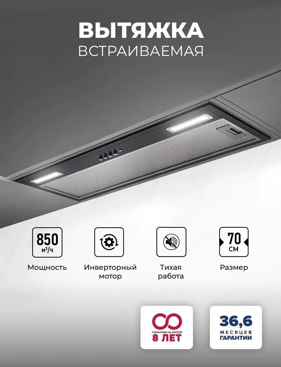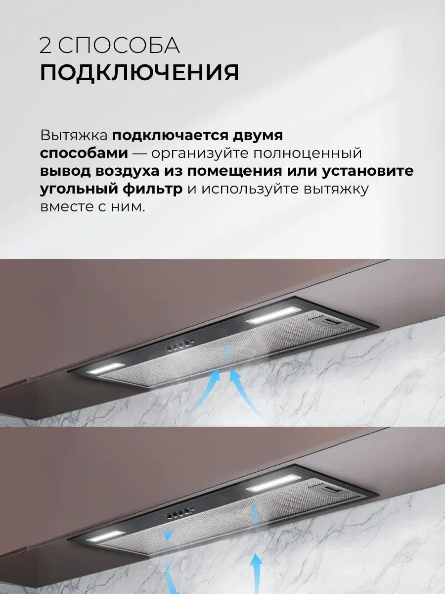 Описание Вытяжка LEX Hyper 900 Inverter BL Технологичное решение для свежего воздуха на вашей кухне! LEX Hyper Inverter — это вытяжка с инверторным мотором, которая отличается высокой производительностью и энергоэффективностью. Компактный дизайн и современные технологии делают её идеальным выбором для любого интерьера. Мощность и комфорт Инверторный двигатель обеспечивает стабильную и тихую работу устройства, сохраняя производительность на уровне от 250 до 850 м³/ч, при минимальном расходе электроэнергии. Даже при максимальной мощности уровень шума остаётся комфортным — от 32 до 44 дБ. Удобство эксплуатации и экономия энергии Три скорости работы легко переключаются с помощью кнопочного управления. LED-освещение (две лампы по 2 Вт) обеспечивает равномерное освещение рабочей зоны, потребляя минимум электроэнергии. Гибкость установки Вытяжка поддерживает два режима работы: вентиляцию и рециркуляцию. В комплект входит алюминиевый фильтр, а угольные фильтры доступны как дополнительная опция для работы в режиме рециркуляции. Стиль и долговечность Корпус выполнен из окрашенной или нержавеющей стали, что делает вытяжку устойчивой к повреждениям и долговечной. Диаметр воздуховода составляет 150 мм, что обеспечивает эффективный отвод воздуха. Основные преимущества: Инверторный мотор для экономичной и тихой работы. Производительность: от 250 до 850 м³/ч. Низкий уровень шума: 32–44 дБ. Режимы вентиляции и рециркуляции. Три скорости работы для гибкой настройки. LED-освещение: две лампы по 2 Вт. Комплектация: алюминиевый фильтр, угольные фильтры доступны дополнительно. Диаметр воздуховода: 150 мм. Потребляемая мощность — всего 33 Вт. Прочный корпус из окрашенной или нержавеющей стали. LEX Hyper Inverter — это инновационное сочетание мощности, стиля и энергоэффективности для вашего дома!