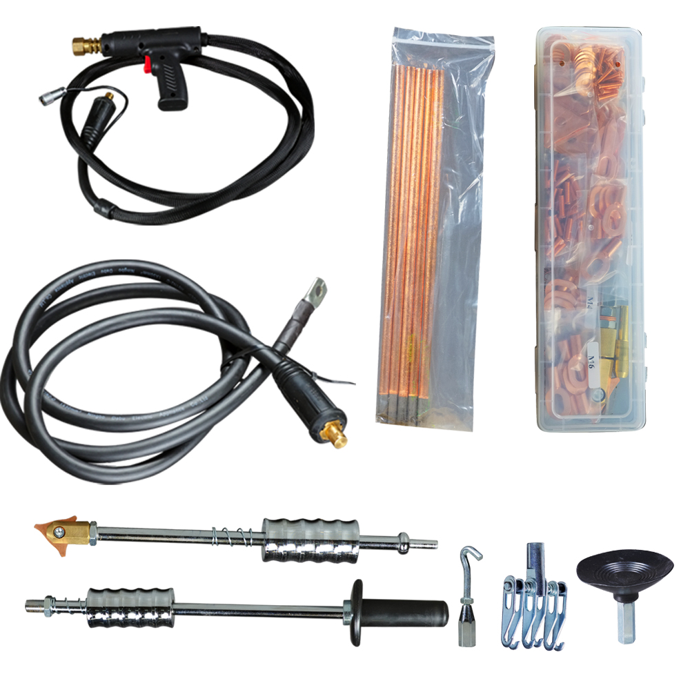 Провод масса для точечной сварки (1 шт.), Провод с пистолетом для сварки (1 шт.), Обратный молоток для точечной сварки (1 шт.), Ручной многофункциональный молоток для точечной сварки с треугольником (1 шт.), Присоска ручная (1 шт.), Шестигранный ключ (1 шт.), Гребенка с 6-тью зацепами (1 шт.), Крючок для обратного молотка (2 шт.), Электрод угольный 350мм (5 шт.), Электрод "треугольник" (10 шт.), Кольца для вытягивания вмятин (10 шт.), Шайба для вытягивания вмятин M4 (5 шт.), Шайба для вытягивания вмятин M5 (5 шт.), Шайба для вытягивания вмятин M6 (5 шт.), Шпилька М4*20 (30 шт.), Шпилька M5*20 (30 шт.), Шпилька M6*20 (30 шт.), Кольцо 12мм (15 шт.), Кольцо 10мм (15 шт.), Держатель электрода "треугольник" (1 шт.), Точечный контактор – устройство крепления обратного кабеля (1 шт.), Держатель угольного электрода (1 шт.), Держатель круглых шайб (1 шт.), Цанга для шпильки M4 (1 шт.), Цанга для шпильки M5 (1 шт.), Цанга для шпильки M6 (1 шт.), Электрод точка для контактной сварки (1 шт.), Электрод плоский для волнистой проволоки (1 шт.), Волнистая проволока 32 мм (15 шт.) |
