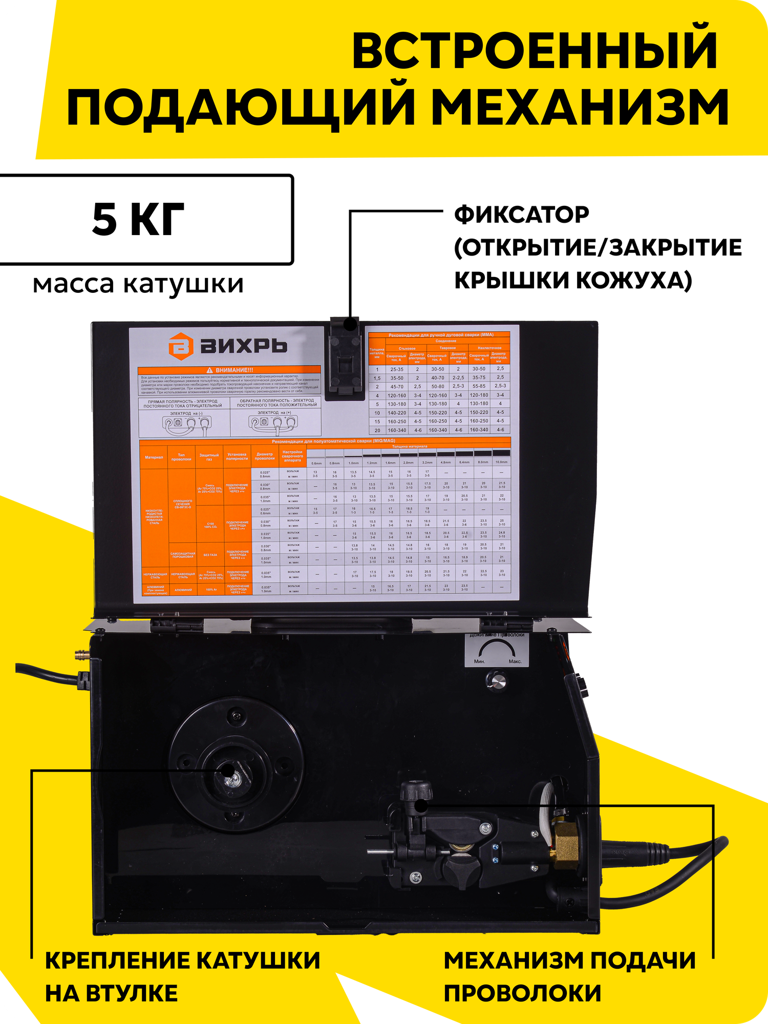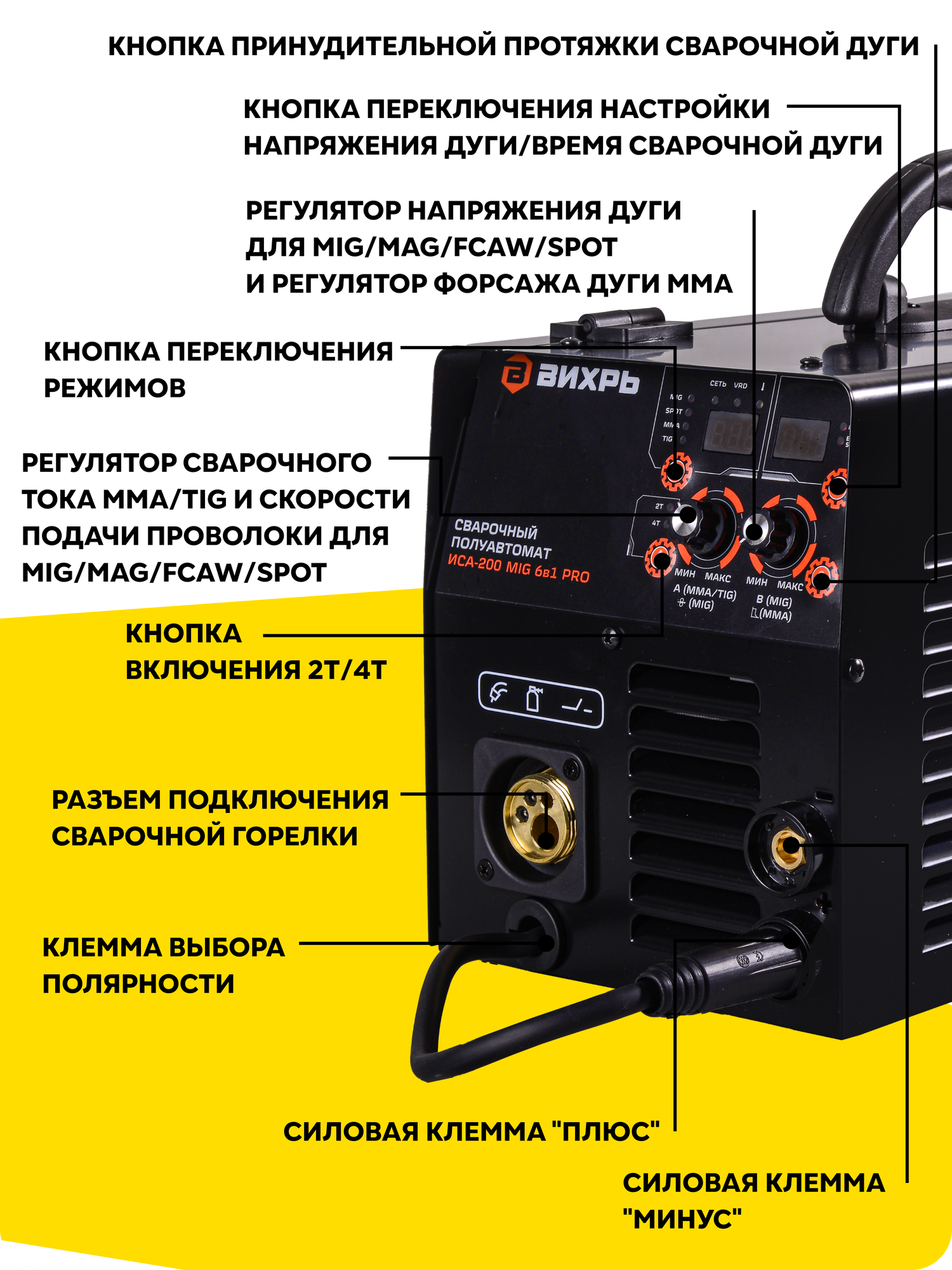 Описание Сварочный аппарат Вихрь ИСА-200 MIG 6в1 PRO [65/185] Сварочный полуавтомат ИСА-200 MIG 6в1 PRO Вихрь – это современный профессиональный инструмент, созданный для удовлетворения потребностей опытных специалистов и любителей, стремящихся достичь идеальных результатов в сварочных работах. Модель ИСА-200 MIG 6в1 PRO оснащена основными режимами сварки, каждый из которых оптимально настроен для работы с определенными материалами и задачами: Полуавтоматическую сварку в среде защитных газов (MIG/MAG), Полуавтоматическую сварку самозащитной порошковой проволокой (FCAW), Аргонодуговую сварку (TIG Lift), Ручную дуговую сварку (MMA), Точечную сварку (Spot).