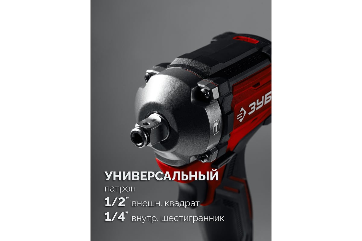 Описание Гайковерт Зубр ГБУ-350-41 LSM Бесщеточный ударный гайковерт ЗУБР системы LMS с максимальным крутящим моментом 350 Нм предназначен для фиксации резьбовых соединений размером до М18. Ударная функция с тангенциальным направлением удара обеспечивает эффективное заворачивание без реактивного момента на кисть оператора. Комплектация с аккумулятором большой емкости позволяет работать дольше на одном заряде. Применяется для закручивания/откручивания крепежных элементов при сборке/разборке металлических конструкций, снятии/установке колес автомобиля и т.д. при установке соответствующего расходного инструмента. Универсальный патрон с квадратным хвостовиком 1/2'' и внутренним HEX 1/4'' позволяет устанавливать стандартный сменный инструмент без переходников - Единая аккумуляторная система LMS для 500+ инструментов