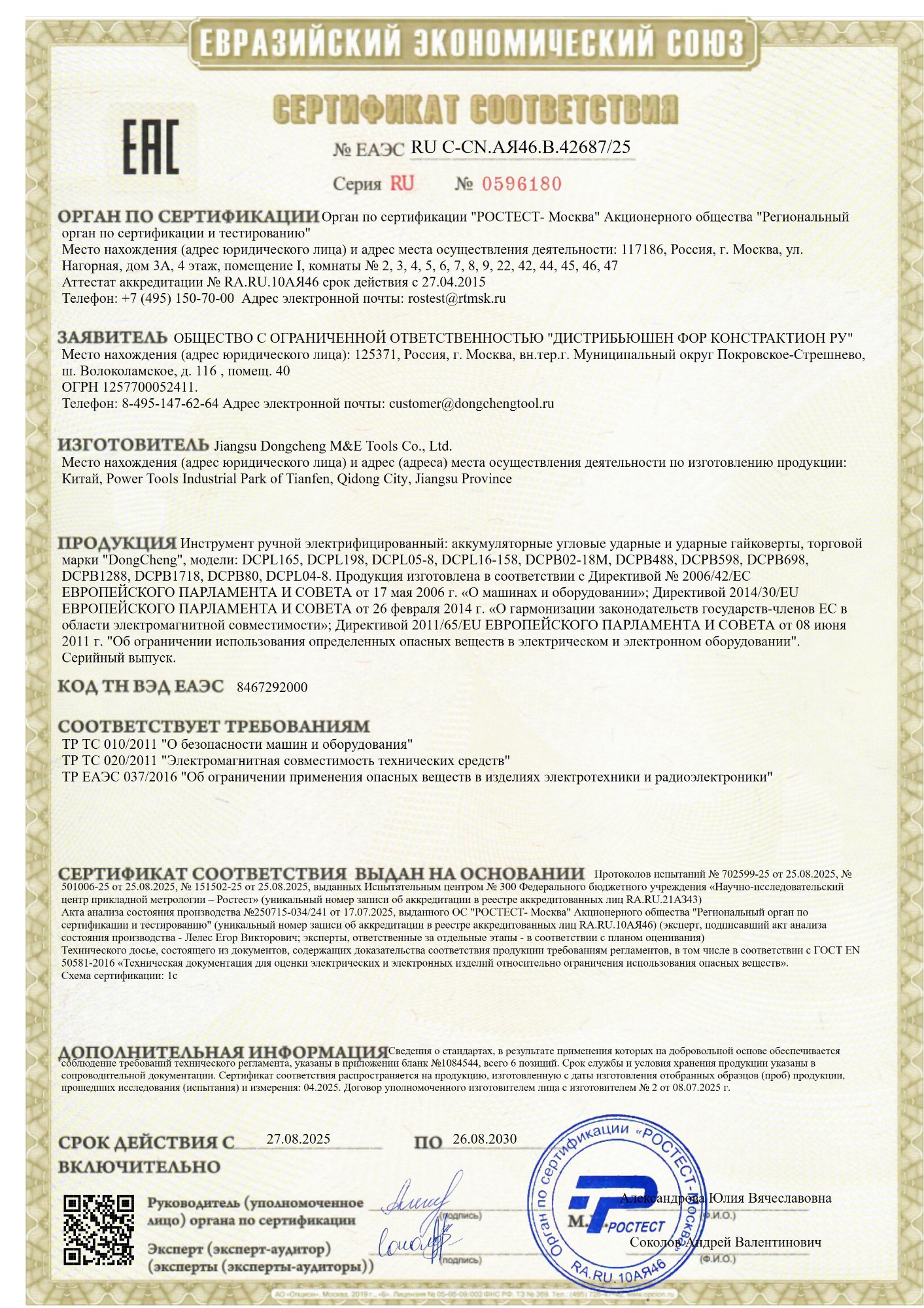 Описание Гайковерт DongCheng DCPL165 (TYPE ADM) Аккумуляторный ударный гайковерт DCPL165 — это мощный и надежный инструмент, предназначенный для профессионального и бытового использования. С его помощью можно легко закручивать и выкручивать крепежные элементы (винты, гайки) размером от M5 до M16. В комплектацию входят зарядное устройство FFCL20-02, аккумуляторная батарея FFBL2020 2,0 А*ч (1 шт), бита, зажим для ремня, пластиковый кейс. Бесщеточный двигатель Повышает надежность, снижает износ и увеличивает срок службы инструмента. Крутящий момент 165 Нм Позволяет закручивать крепеж даже в твердые материалы без лишних усилий. Универсальный размер крепежа (M5-M16) Подходит для широкого спектра задач. Регулируемая скорость (0–3300 об/мин). Обеспечивает точный контроль в зависимости от задачи. 4 режима работы Оптимальная настройка скорости и крутящего момента под разные материалы и типы крепежа. Светодиодная подсветка Освещает рабочую зону в условиях плохой видимости. Защита от перегрева и глубокой разрядки Встроенная электронная защита отключает двигатель при чрезмерной нагрузке или перегреве аккумулятора. При достижении уровня практически полной разрядки инструмент выключается. Эти функции продлевают срок службы инструмента. В комплектацию входят аккумулятор и зарядное Время полной зарядки аккумулятора FFBL2020 с помощью зарядного FFCL20-02 – 60 минут. Индикатор заряда аккумулятора Позволяет контролировать уровень заряда и избежать неожиданной разрядки. Эргономичный дизайн и малый вес (1,1 кг с акб 2 Ач) Удобен при длительной работе и в труднодоступных местах.