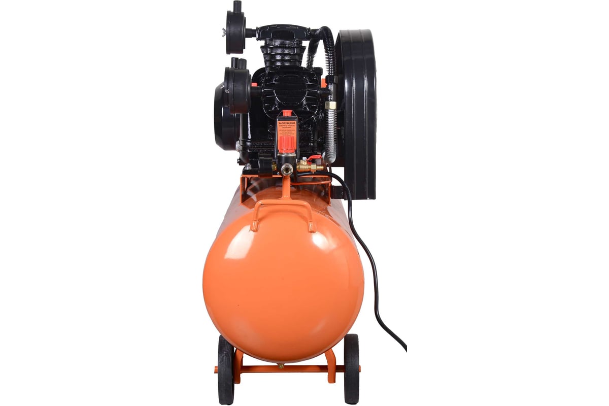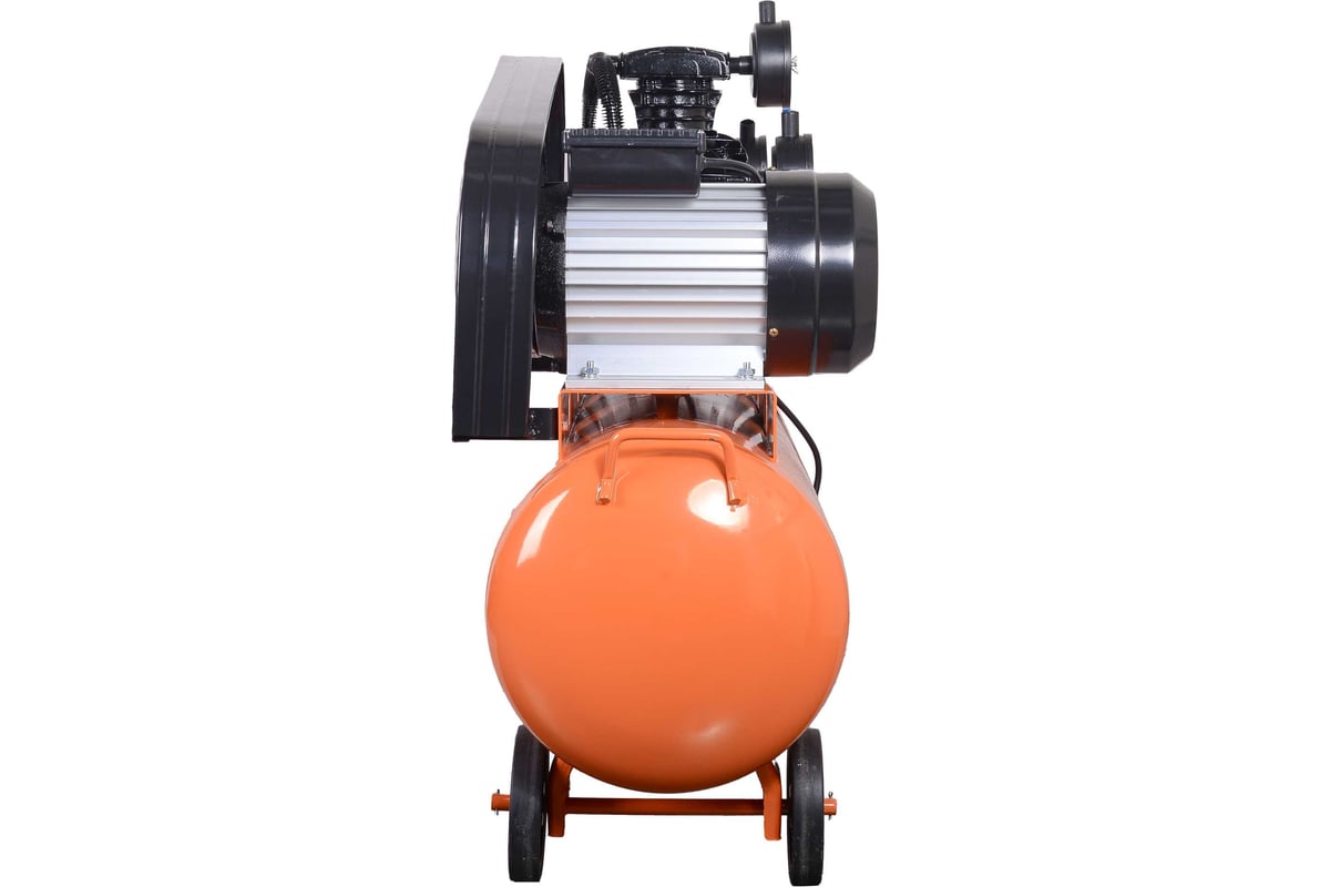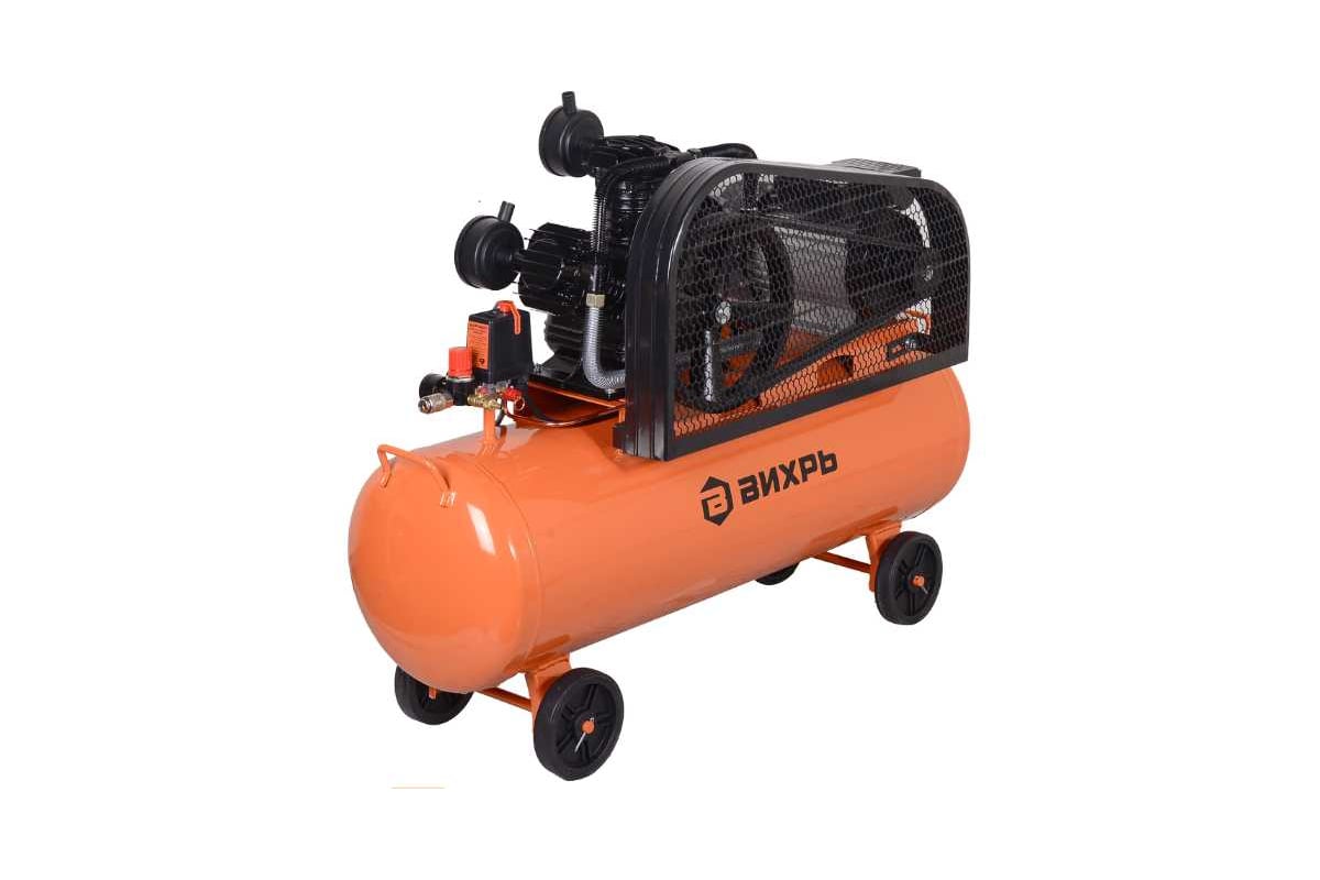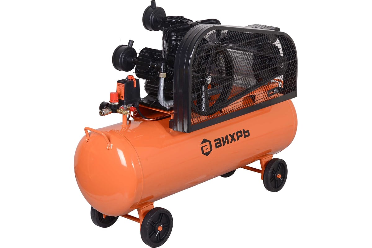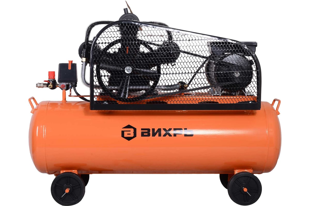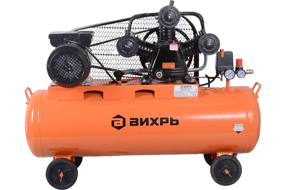 Описание Компрессор Вихрь КМП-680/100Р [74/3/89] Компрессор поршневой Вихрь КМП-680/100Р — это стационарная установка профессионального класса, предназначенная для бесперебойного снабжения сжатым воздухом широкого спектра пневмоинструмента и технологического оборудования. Его ключевые характеристики — высокая производительность, солидный запас сжатого воздуха в ресивере и надежная конструкция — делают его идеальным решением для интенсивной эксплуатации в автосервисах, производственных мастерских, на строительных площадках и промышленных объектах. Мощный электродвигатель 3500 Вт в паре с трехцилиндровой компрессорной головкой обеспечивают стабильную подачу сжатого воздуха с производительностью до 680 л/мин и рабочим давлением до 10 бар. Этого достаточно для одновременной работы нескольких единиц энергоемкого пневмоинструмента: краскопультов, гайковертов, шлифмашин, пескоструев, подкатных домкратов. Ресивер объемом 100 л выполняет роль воздушного аккумулятора. Он сглаживает пульсации давления, обеспечивает долгую автономную работу инструментов без частых включений двигателя, снижает износ компрессорного блока и позволяет выполнять кратковременные пиковые нагрузки. Ременная передача эффективно снижает нагрузку и вибрации на двигатель и цилиндры, способствуя их охлаждению и продлевая общий ресурс установки. Такая конструкция отличается ремонтопригодностью и более низким уровнем шума по сравнению с прямым приводом.