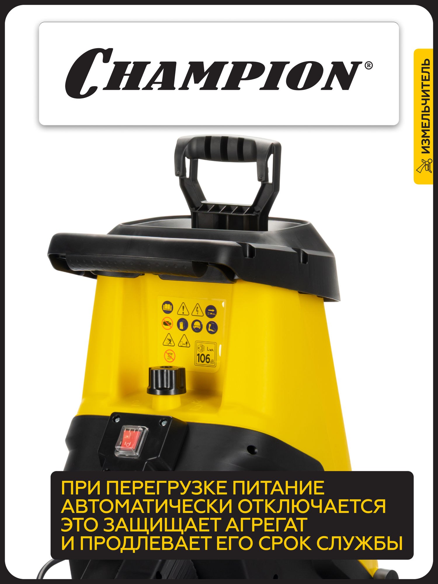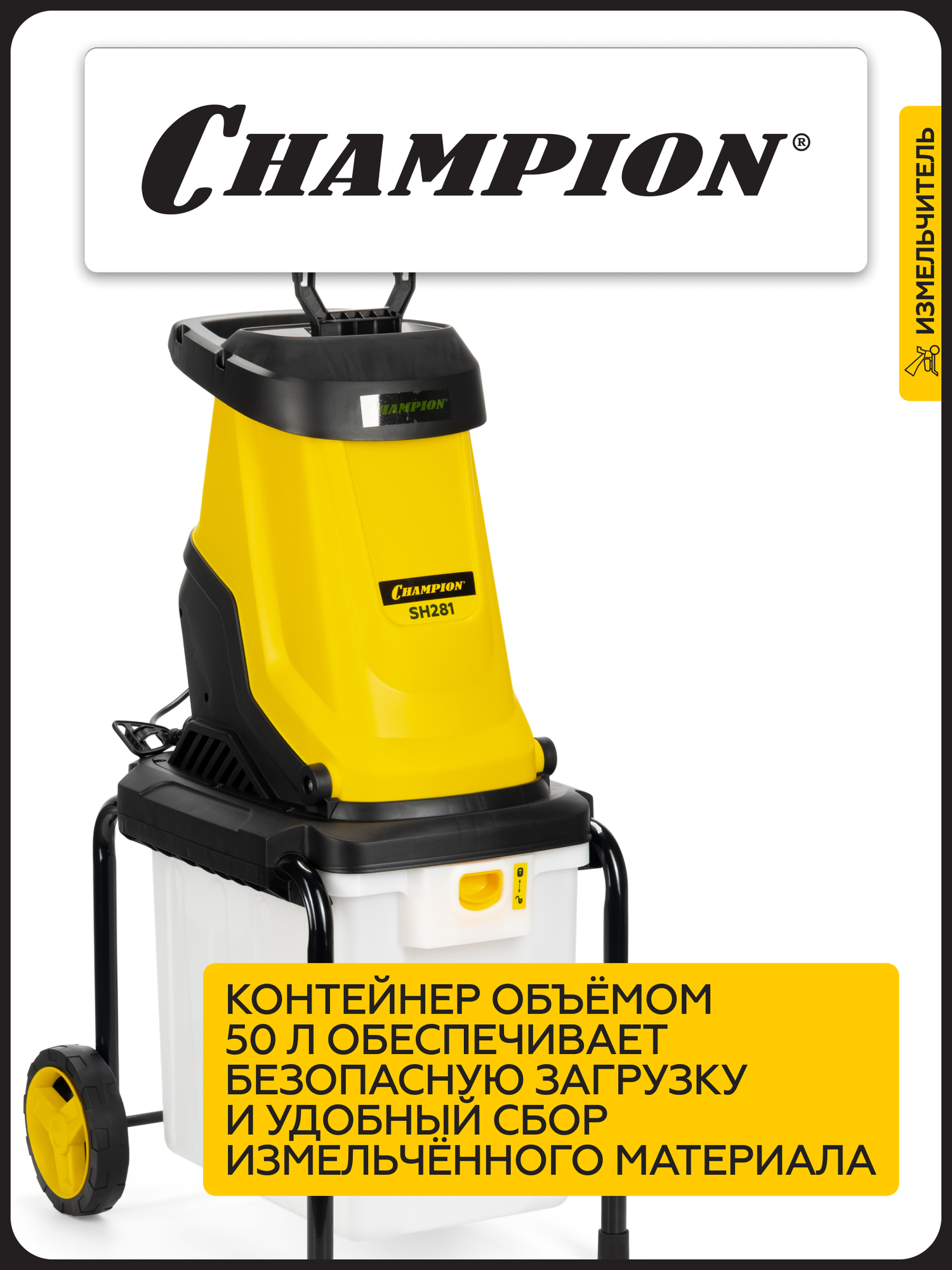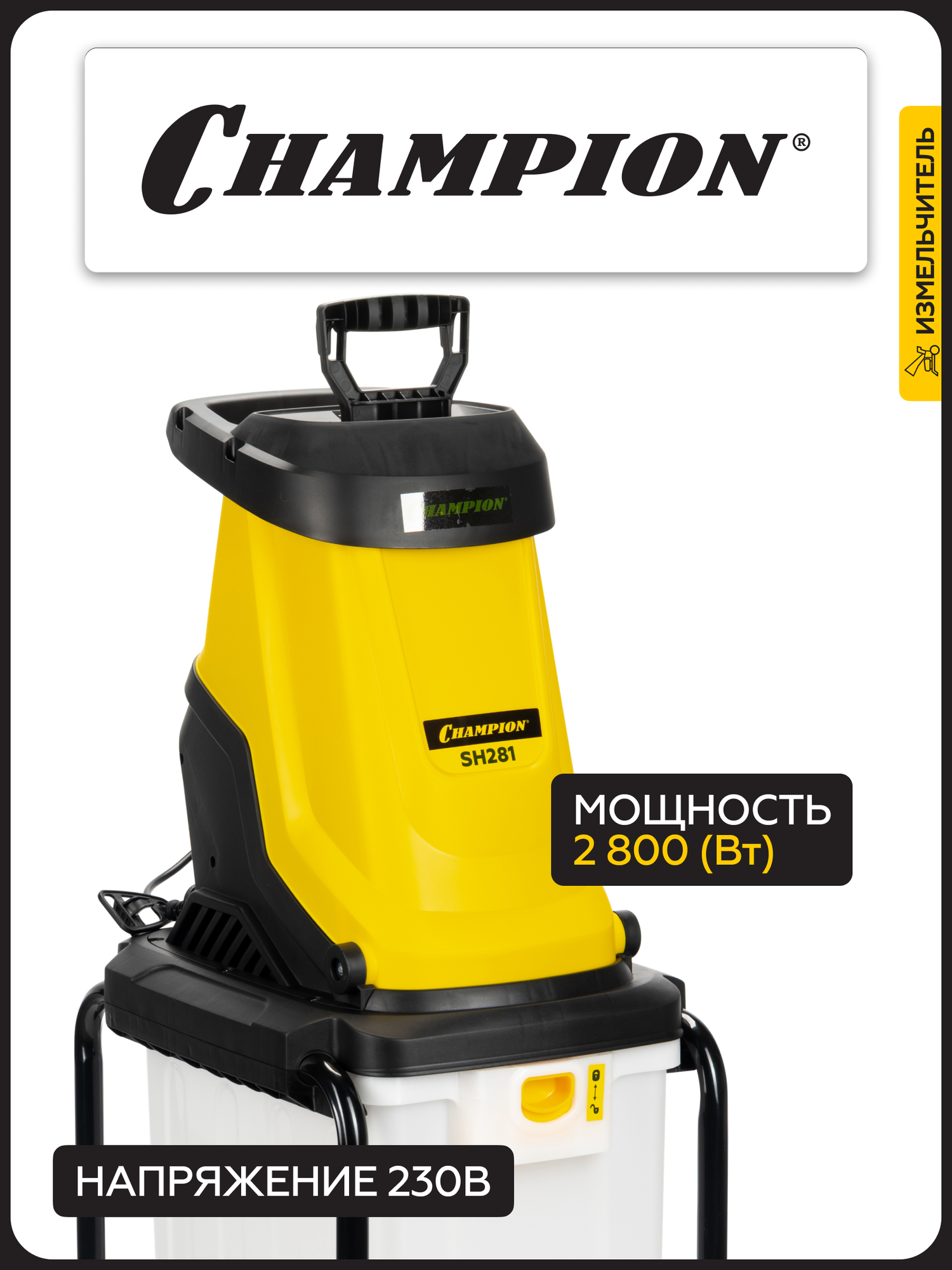 Описание Измельчитель садовый Champion SH281 Измельчитель электрический Champion SH281 – мощный и надежный помощник для ухода за садом. Champion SH281 – это электрический измельчитель, созданный для быстрой и эффективной переработки веток, кустарников и садового мусора. С его помощью вы легко избавитесь от растительных отходов, превратив их в мелкую щепу для компоста или мульчирования. Особенности: Мощность и производительность – двигатель 2800 Вт справляется с ветками до 45 мм в диаметре, обеспечивая высокую скорость работы; Низкий уровень шума – работает значительно тише бензиновых аналогов; Мобильность – компактные размеры, колеса и небольшой вес позволяют легко перемещать измельчитель по участку; Долговечность – стальные ножи с двойной заточкой гарантируют долгий срок службы и качественное измельчение; Безопасность – защита от перегрузок и случайного включения, а также прочный толкатель предотвращают травмы; Простота использования – удобная загрузочная воронка, вместительный контейнер для сбора щепы и интуитивное управление делают процесс измельчения комфортным.