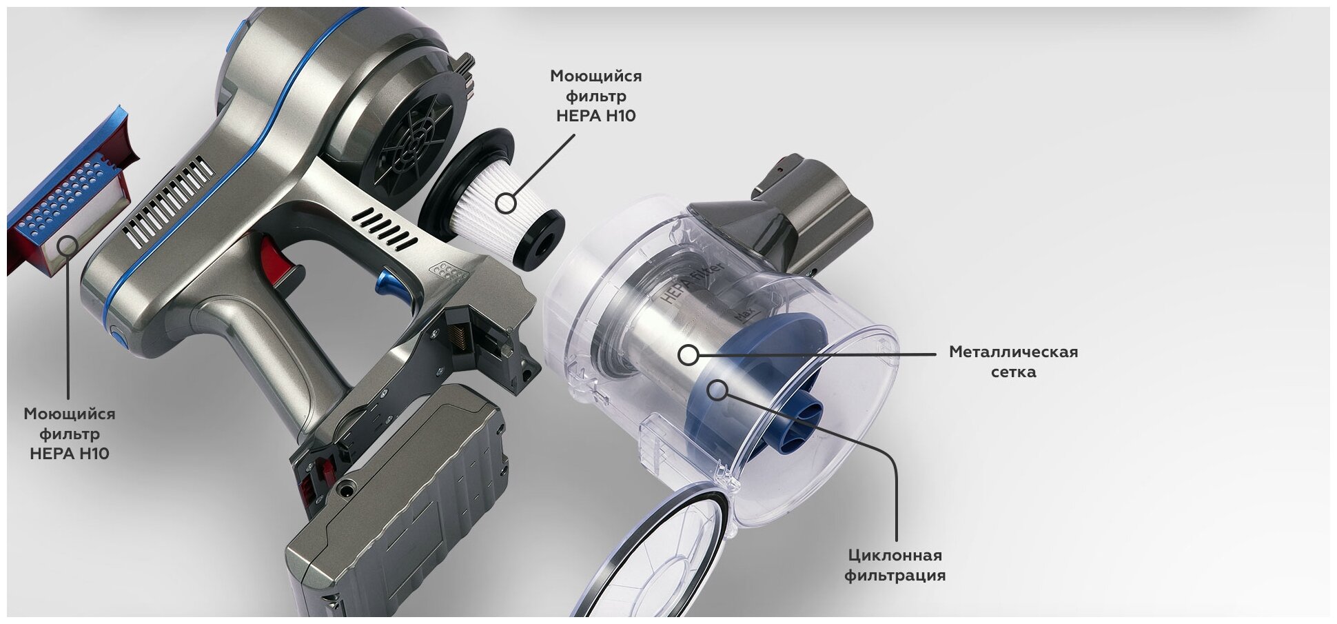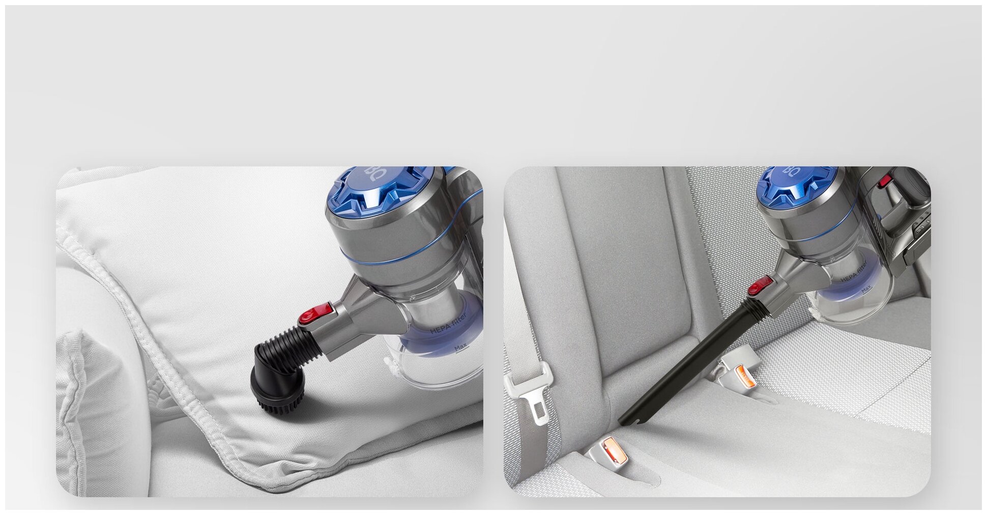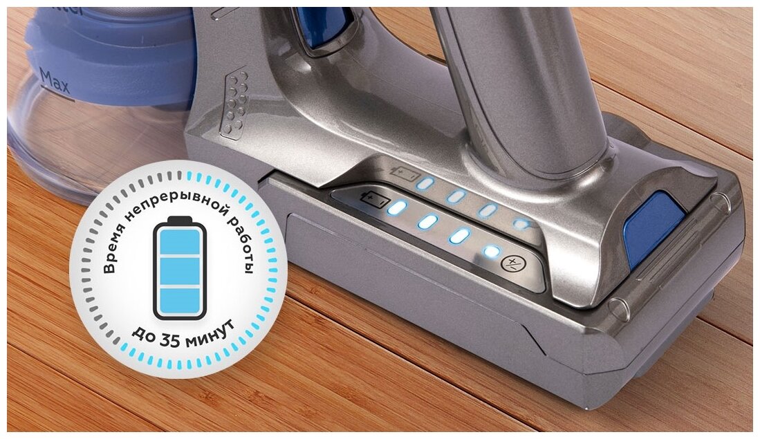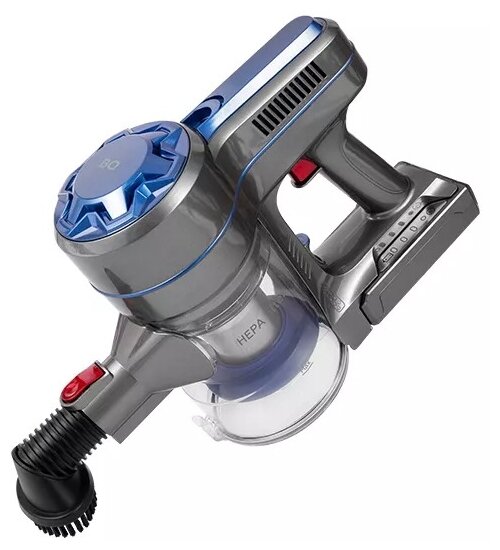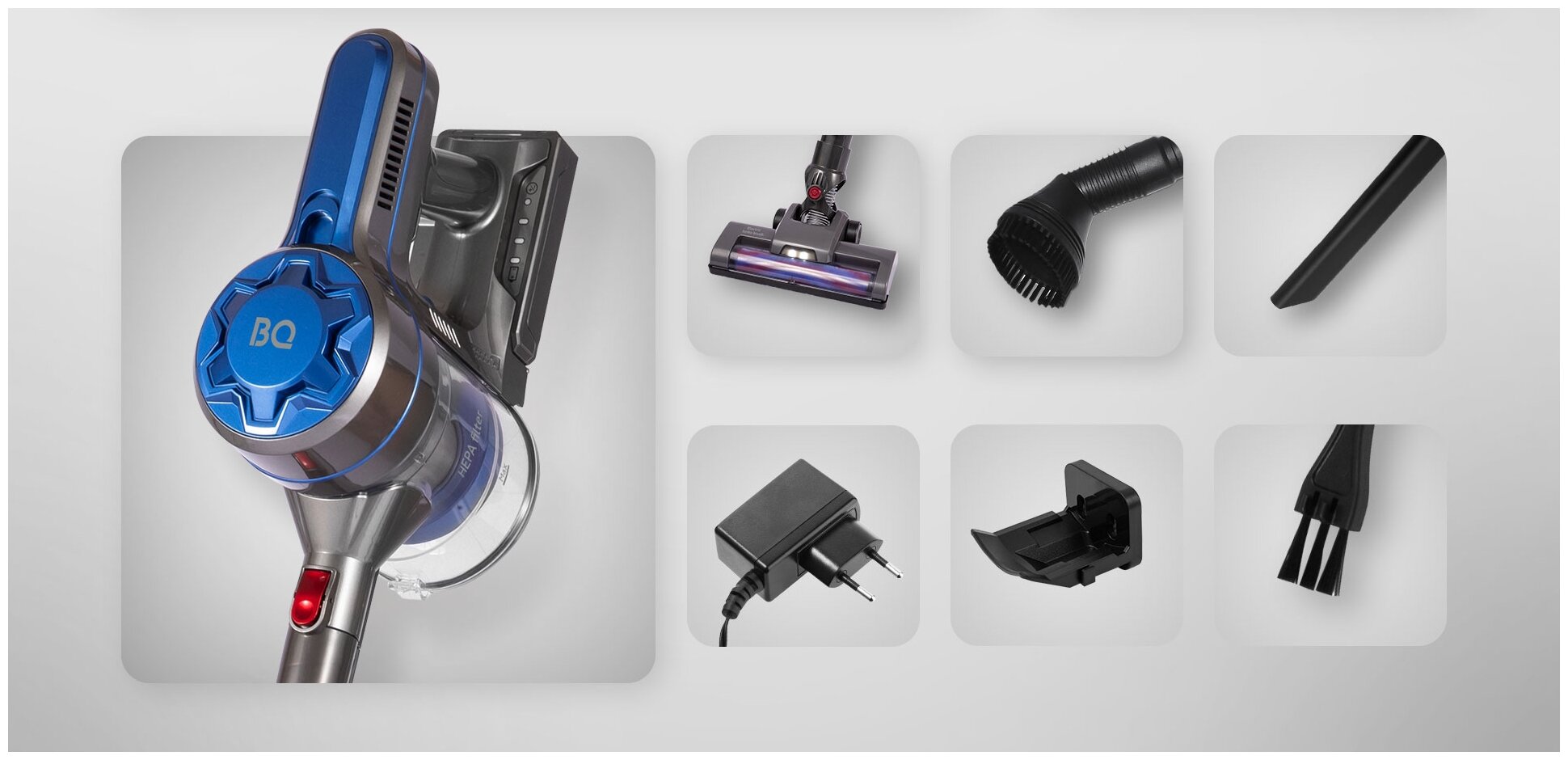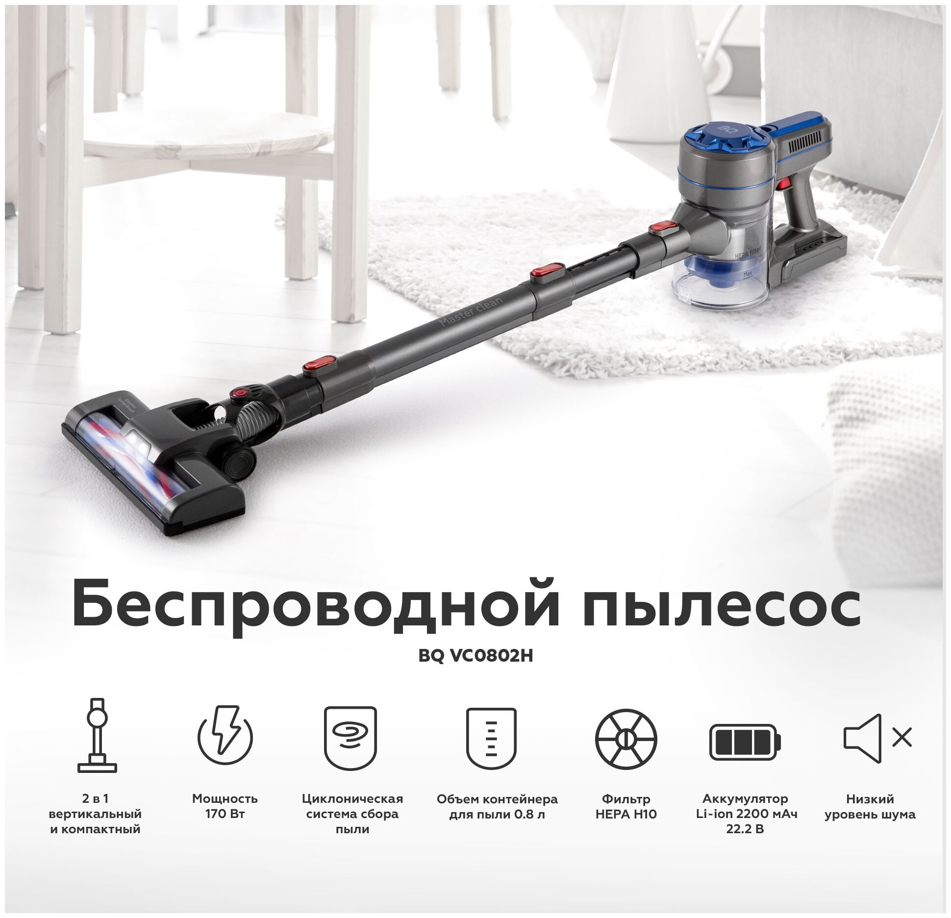 Описание Пылесос беспроводной BQ VC0802H Беспроводной пылесос BQ VC0802H работает по циклонической технологии. Он предназначен для сухой уборки и оснащен литий-ионным аккумулятором, емкость которого составляет 2200 мАч. Этого хватит примерно на 35 минут. Мощность всасывания — 50 Вт. Скорость регулируется, доступно два режима. В этой модели установлен 0,8-литровый пылесборник. Воздух, выходящий из корпуса, очищается с помощью четырехступенчатой системы, в которой есть фильтр HEPA 13. LED-подсветка пригодится, чтобы контролировать рабочую область. В комплекте есть узкая насадка и три щетки: электрическая, для ухода за мебелью и для чистки аксессуаров.