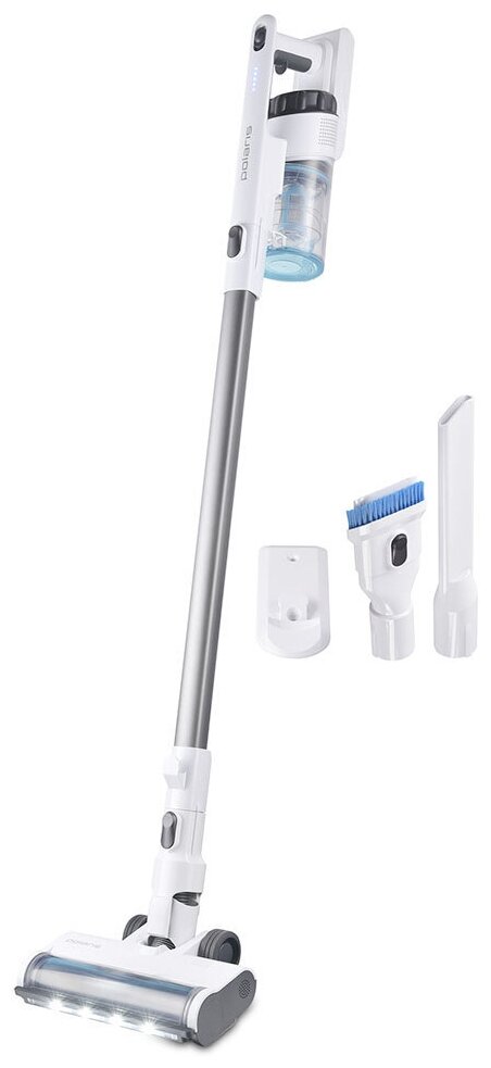 Описание Пылесос беспроводной Polaris PVCS 0725 Пылесос Polaris PVCS 0725 с раскладной вертикальной конструкцией и циклонической системой способен обеспечить высокое качество уборки. Он характеризуется мощностью всасывания 45 Вт и контейнером на 0.5 л для сбора мусора, который легко снимается с корпуса при необходимости очистки. Для освещения рабочей зоны реализована светодиодная подсветка. Данная модель имеет 2 уровня мощности. Polaris PVCS 0725 оснащен 3 сменными насадками – турбощетка с электроприводом, щетка для мебели и щелевая насадка. На одном заряде аккумулятор способен работать автономно около 40 минут. Устройство для восстановления заряда входит в комплект. Особенности Циклоническая система сбора пыли. Сменные насадки - 3 шт. Технология WALK by ITSELF - чисто без усилий. Благодаря особому электроприводу на щетке пылесос сам устремляется вперед, его вес практически не ощущается при использовании на горизонтальных поверхностях. Крепление на стену. 2 режима работы.