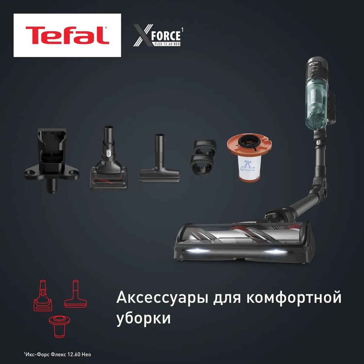 Описание Пылесос беспроводной Tefal X-Force Flex TY9L42WO Беспроводной пылесос Tefal X-Force Flex 12.60 Neo TY9L42WO — это высокоэффективный универсальный прибор, предназначенный для тщательной уборки различных типов напольных покрытий. С максимальной мощностью всасывания 150 аВт и временем автономной работы до 60 минут, бытовая техника для дома обеспечивает тщательную очистку без необходимости частой подзарядки. Кроме того, вертикальный пылесос с контейнером оснащен гибким корпусом Flex, который позволяет легко убирать под низкой мебелью без необходимости наклоняться. Устройство оснащено LED-подсветкой рабочей зоны, которая помогает выявить даже самые мелкие частицы пыли в темных углах, под диванами и кроватями. Автоматическая регулировка мощности аккумуляторного пылесоса Тефаль адаптируется под тип поверхности, обеспечивая оптимальное сочетание эффективности и автономности. В комплект входят различные насадки, включая турбощетку, мини-щетку, щелевую насадку и моющую насадку с вращающимися дисками из микрофибры для влажной уборки. Циклонная система фильтрации и моющийся HEPA-фильтр задерживают до 99,9% пыли и аллергенов, что особенно важно для людей, страдающих от аллергии. Съемный литий-ионный аккумулятор обеспечивает до 60 минут работы, а время зарядки ручного пылесоса составляет до 4 часов. Ручка портативного пылесоса с дисплеем отображает уровень заряда и выбранный режим работы, а также позволяет регулировать мощность всасывания. А телескопическая алюминиевая трубка облегчает маневрирование и обеспечивает комфортную уборку. Беспроводной пылесос Tefal X-Force Flex 12.60 Neo — это надежный и мощный помощник в поддержании чистоты вашего дома!