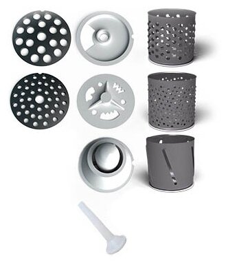 материал лотка: пластик; количество насадок для приготовления колбас: 1; количество насадок-терок: 2; количество насадок для шинковки: 1 |