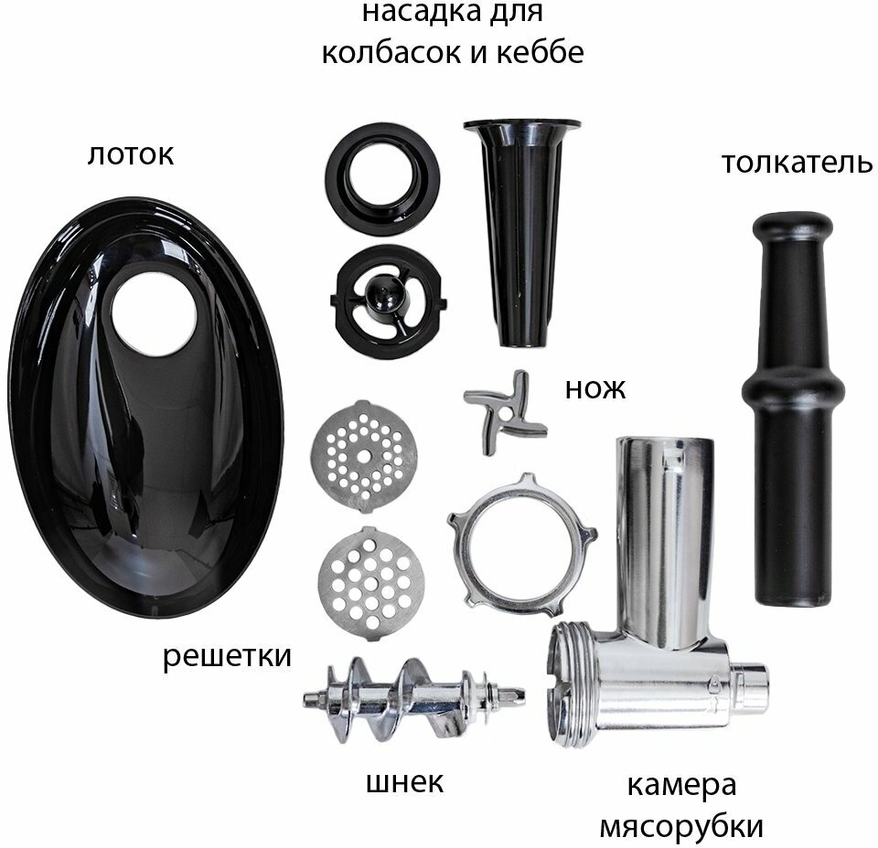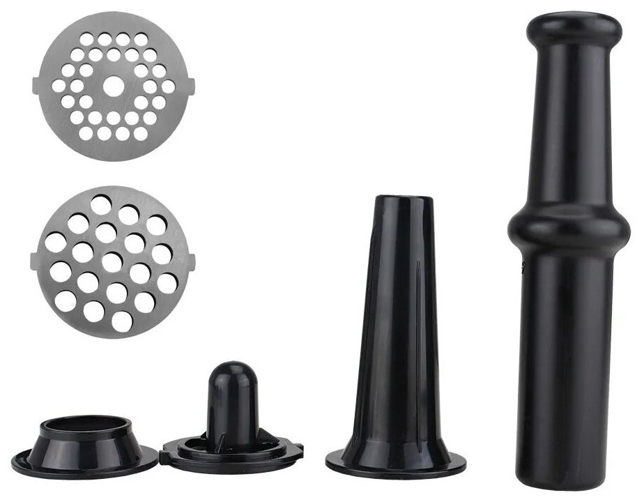 Устройство имеет функцию реверса, с помощью которой удобно извлекать из шнека застрявшие кусочки. В комплекте есть две решетки с отверстиями разного диаметра. Для приготовления колбасы и сосисок в наборе есть специальные насадки для наполнения натуральной оболочки. Чтобы безопасно загрузить кусочки продуктов в отверстие, можно применять толкатель из пластика и лоток.