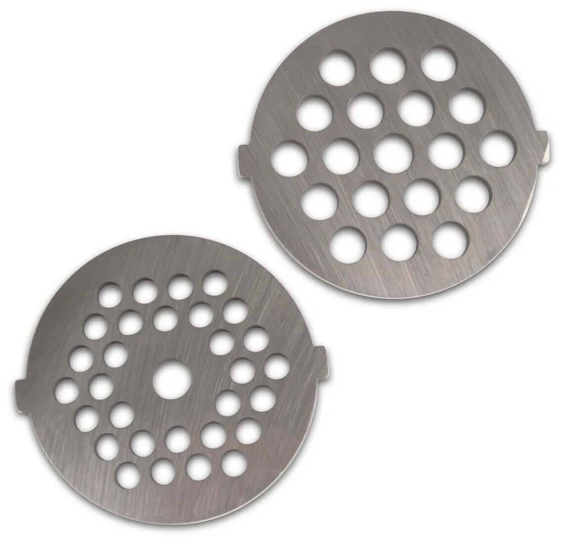 В комплект прилагаются руководство по эксплуатации, две решётки для мясорубки с пропускными отверстиями 5 и 7 мм., пластиковый толкатель, насадка для сосисок и насадка «КЕББЕ».