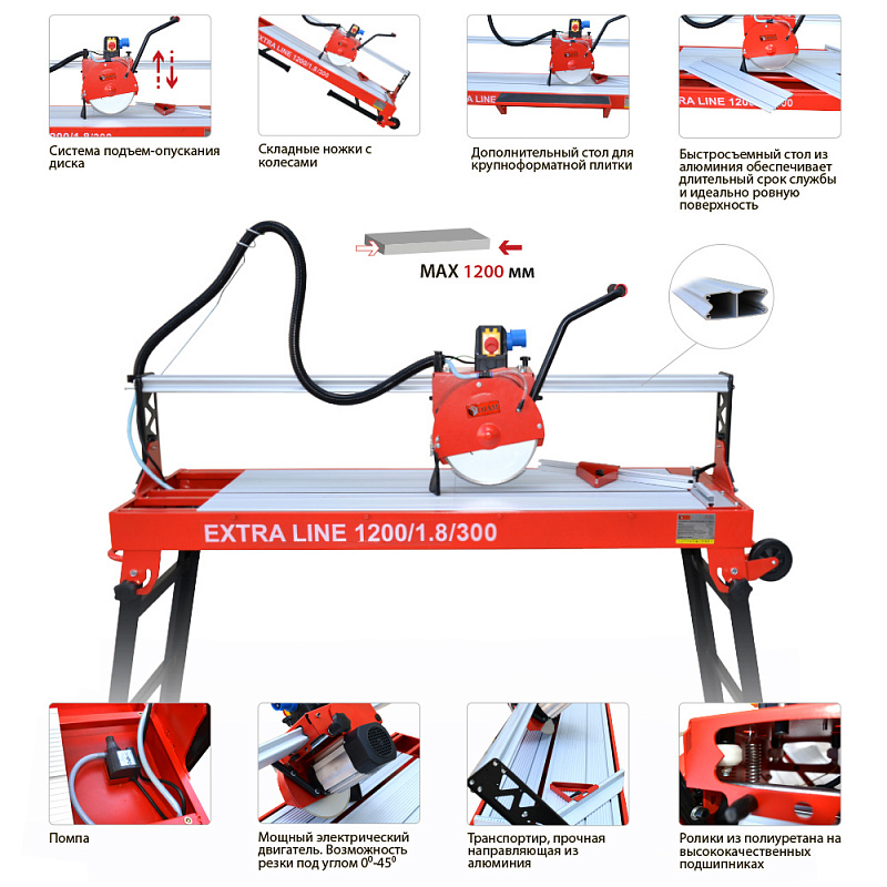 Описание Плиткорез Diam EX-1200/1.8/300'' [600104] Плиткорез подходит для резки под углом от 0 до 45° всех видов натуральной и искусственной керамической облицовочной, напольной плитки. Новая конструкция направляющей и каретки на роликах из полиуретана снабженных высококачественными подшипниками обеспечивает мягкое перемещение режущей части и точный рез материала. Благодаря возможности установки алмазного диска диаметром 300 мм глубина реза увеличена до 70 мм, что дает возможность также резать более толстые, но не твердые материалы, например кирпич. При резке на большую глубину надо учитывать ограничения по мощности электродвигателя, чем больше глубина реза и чем тверже материал тем меньше скорость резки. Особенности Плиткорез оборудован циркулирующей системой подачи воды в зону резания для охлаждения алмазного круга Cистема подъема-опускания диска Складные ножки, что удобно для транспортировки и хранения На станок возможно устанавливать диски диаметром 300 мм со сплошной режущей кромкой тип "Корона" и тип "Turbo"