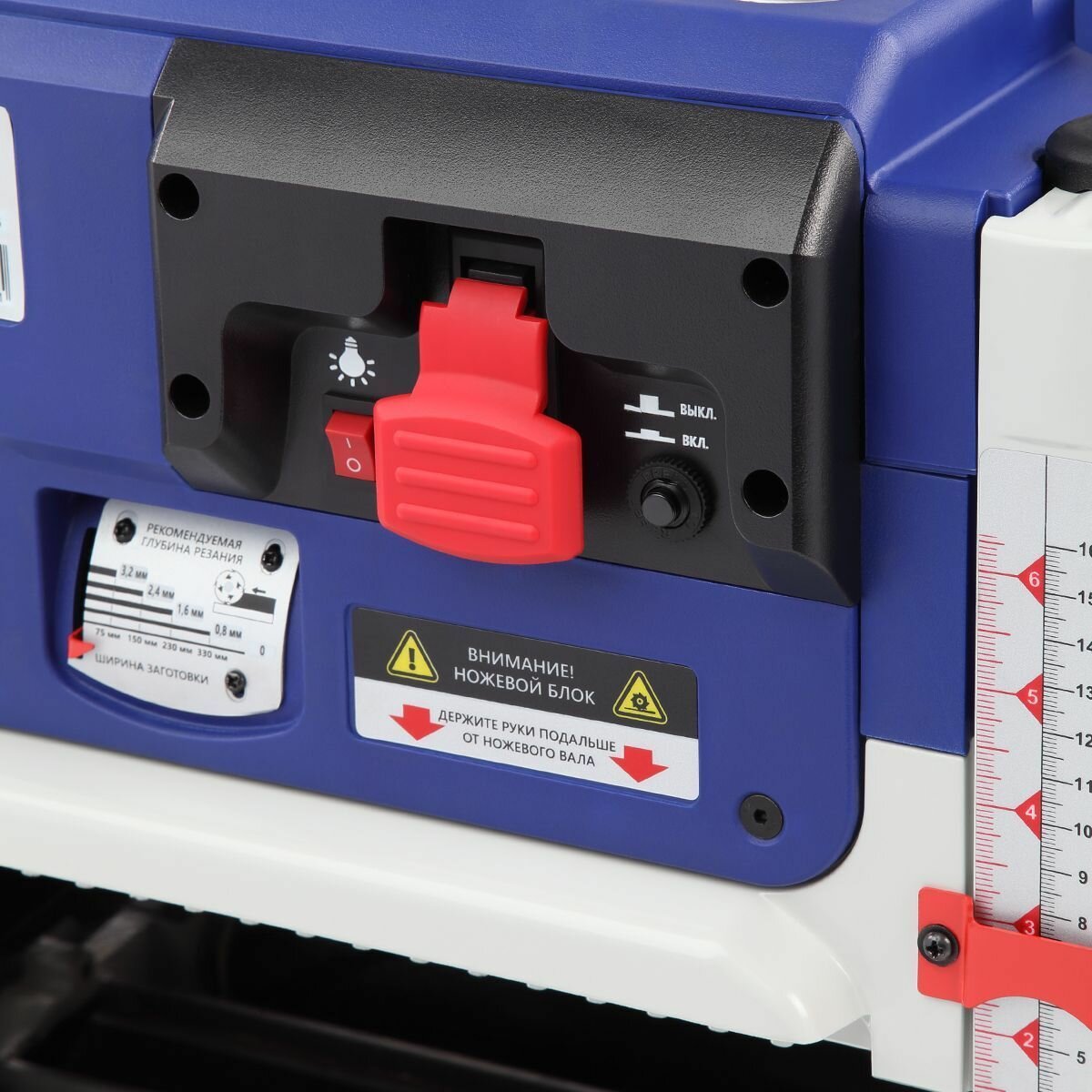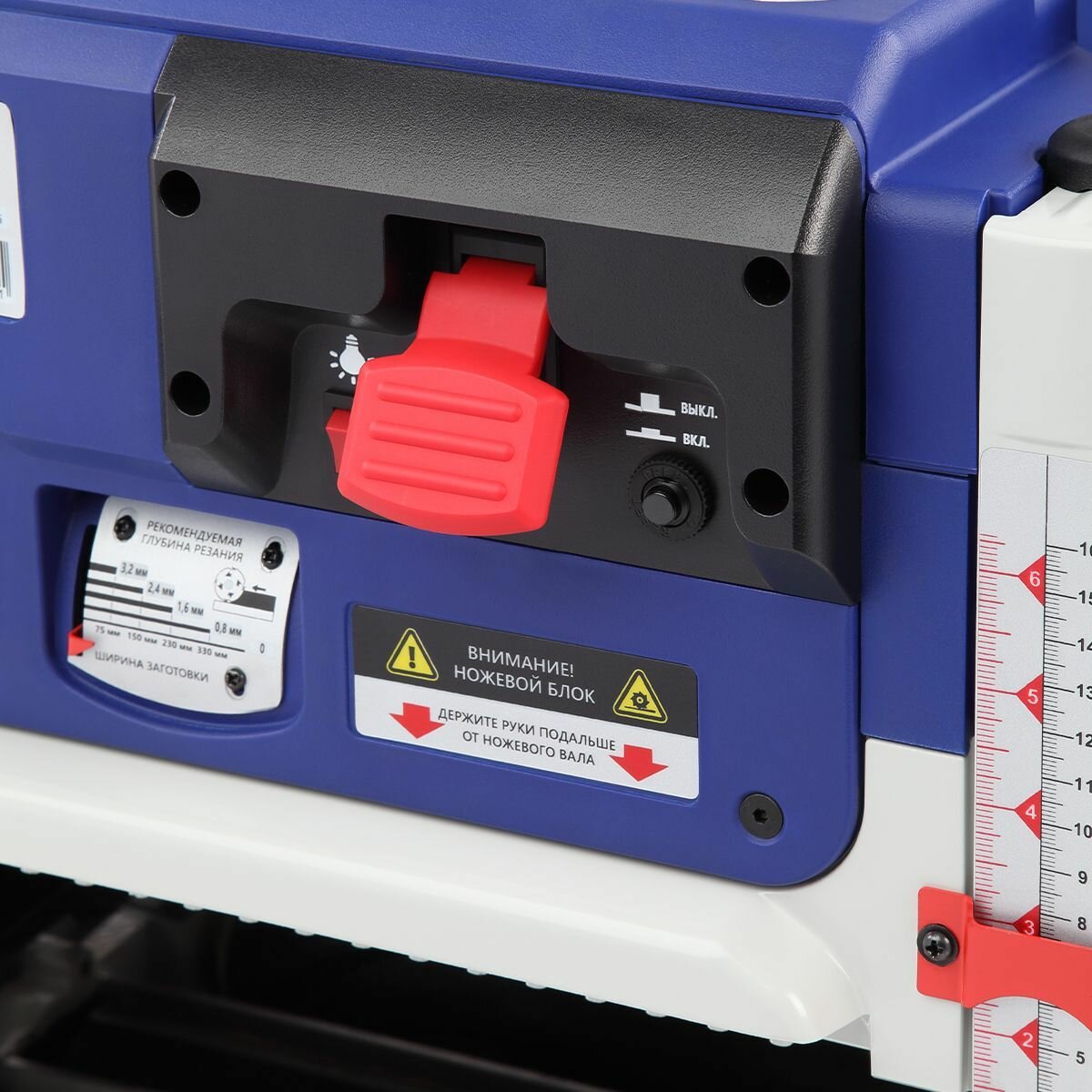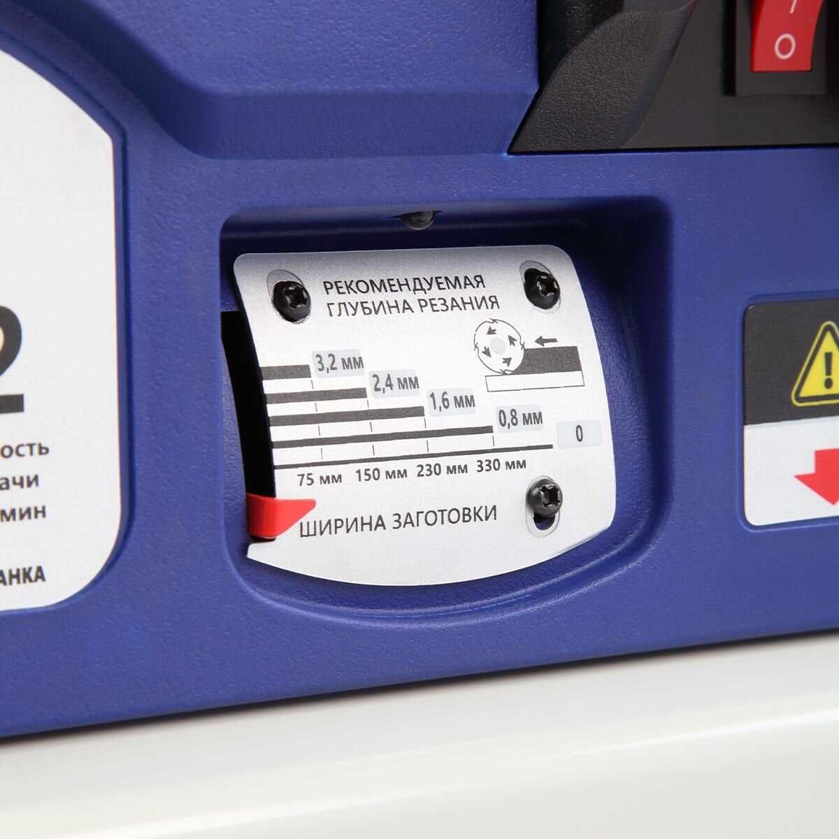 Конструкция Основная конкурентная особенность станка - четыре направляющие стойки, которые обеспечивают высокую жесткость конструкции режущего узла, параллельность ножевого вала и минимизируют вибраций при работе. Станок понравится столярам, которые работают с мебельными щитами и ценят точную геометрию заготовок. Регулировка высоты рабочей платформы осуществляется поворотом маховика с диапазоном от 5 до 152 мм. Для точной настройки предусмотрена шкала глубины строгания и ограничитель высоты с фиксацией на 5, 10, 18, 20, 25 и 30 мм. Это позволяет быстро устанавливать нужную толщину обработки и повторять параметры для серийных деталей. Станок оснащен коллекторным двигателем мощностью 2 кВт, помогает достичь частоту вращения ножевого вала 9400 об/мин. Режим работы двигателя S1, он работает продолжительное время с постоянной нагрузкой. Работает от сети 230 В, вилка стандартная российская. Автоматический выключатель защищает оборудование от перегрузок, что продлевает срок службы станка и делает работу безопаснее. Строгальный вал диаметром 45,4 мм имеет три ножа размером 334×22×1,5 мм. Они обеспечивают качественную обработку поверхности заготовки. Двусторонние ножи экономят бюджет, при затуплении одной стороны, нож можно перевернуть и продолжить работу. Максимальная ширина заготовки составляет 330 мм. Глубина рейсмусования за один проход от 0,8 до 3,2 мм, чем шире заготовка, тем меньше глубина съёма. Автоматическая подача материала осуществляется двумя стальными валами с резиновым покрытием на скорости 4 или 7 м/мин. Резиновое покрытие обеспечивает надежный захват заготовки без повреждения поверхности. Для удобства работы с длинными заготовками предусмотрены выдвижные ролики размером 335×330 мм, которые поддерживают материал и облегчают работу. Рабочий стол размером 506×316 мм выполнен из стальной накладки на алюминиевом основании. Такая конструкция выдерживает значительные нагрузки и служит долго. Дополнительная стабилизация достигается за счет крепления станка к верстаку и общего веса станка 49,5 кг. Для удобства эксплуатации станок оборудован: Собственной системой пылеудаления с мощной турбиной для отвода стружки в фильтр-мешок Когтевой защитой для предотвращения выброса заготовки Светодиодными лампами, которые обеспечивает дополнительную подсветку указателя глубины строгания Эргономичными ручками для переноски, которые помогают перемещать станок