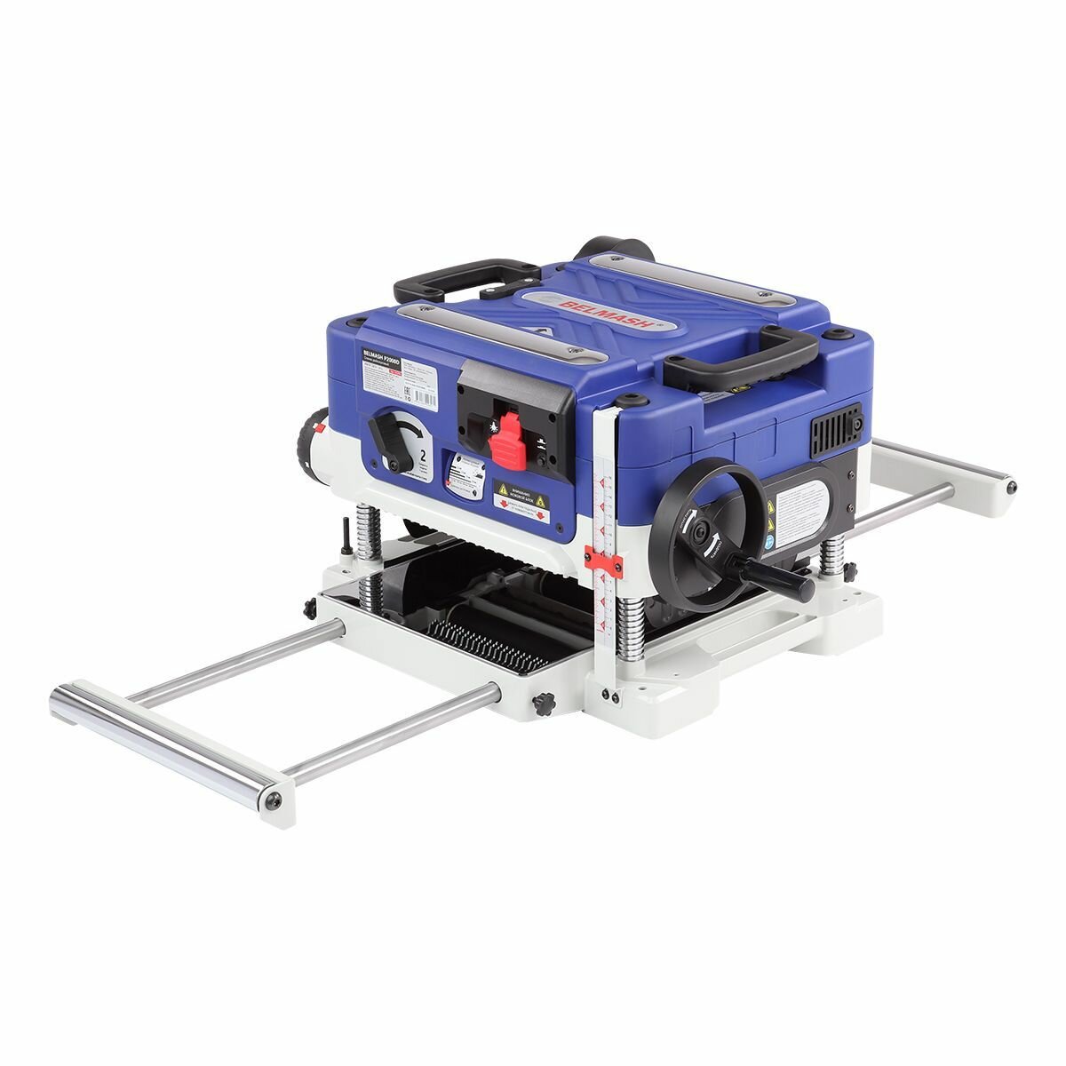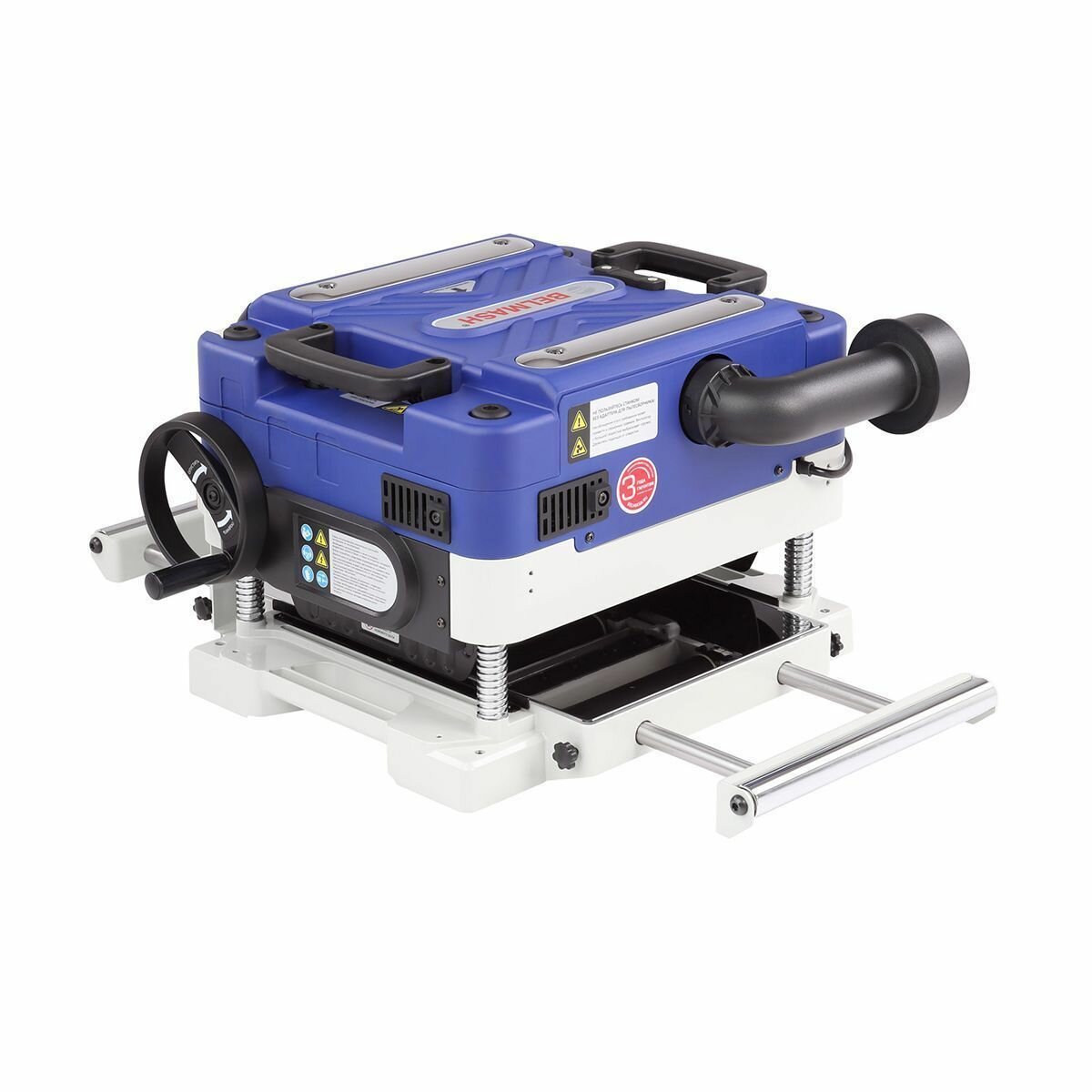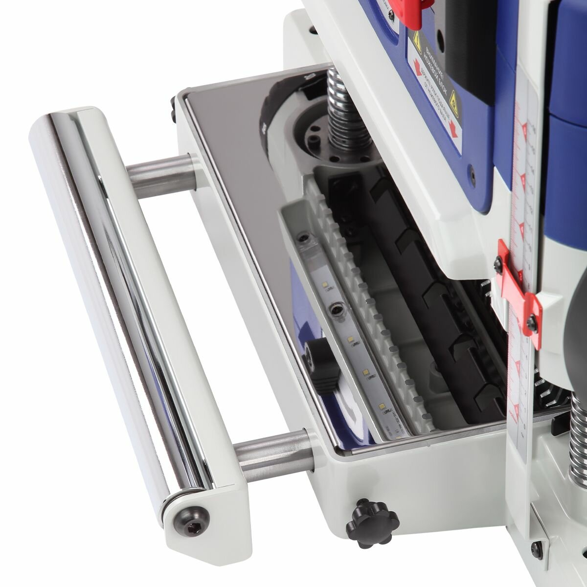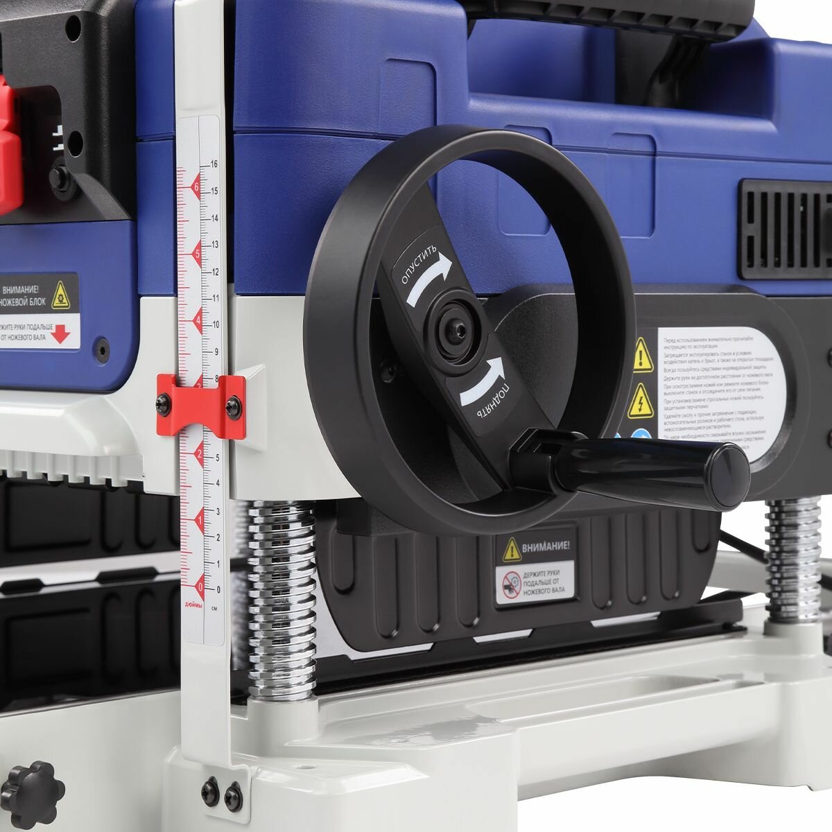 Конструкция Основная конкурентная особенность станка - четыре направляющие стойки, которые обеспечивают высокую жесткость конструкции режущего узла, параллельность ножевого вала и минимизируют вибраций при работе. Станок понравится столярам, которые работают с мебельными щитами и ценят точную геометрию заготовок. Регулировка высоты рабочей платформы осуществляется поворотом маховика с диапазоном от 5 до 152 мм. Для точной настройки предусмотрена шкала глубины строгания и ограничитель высоты с фиксацией на 5, 10, 18, 20, 25 и 30 мм. Это позволяет быстро устанавливать нужную толщину обработки и повторять параметры для серийных деталей. Станок оснащен коллекторным двигателем мощностью 2 кВт, помогает достичь частоту вращения ножевого вала 9400 об/мин. Режим работы двигателя S1, он работает продолжительное время с постоянной нагрузкой. Работает от сети 230 В, вилка стандартная российская. Автоматический выключатель защищает оборудование от перегрузок, что продлевает срок службы станка и делает работу безопаснее. Строгальный вал диаметром 45,4 мм имеет три ножа размером 334×22×1,5 мм. Они обеспечивают качественную обработку поверхности заготовки. Двусторонние ножи экономят бюджет, при затуплении одной стороны, нож можно перевернуть и продолжить работу. Максимальная ширина заготовки составляет 330 мм. Глубина рейсмусования за один проход от 0,8 до 3,2 мм, чем шире заготовка, тем меньше глубина съёма. Автоматическая подача материала осуществляется двумя стальными валами с резиновым покрытием на скорости 4 или 7 м/мин. Резиновое покрытие обеспечивает надежный захват заготовки без повреждения поверхности. Для удобства работы с длинными заготовками предусмотрены выдвижные ролики размером 335×330 мм, которые поддерживают материал и облегчают работу. Рабочий стол размером 506×316 мм выполнен из стальной накладки на алюминиевом основании. Такая конструкция выдерживает значительные нагрузки и служит долго. Дополнительная стабилизация достигается за счет крепления станка к верстаку и общего веса станка 49,5 кг. Для удобства эксплуатации станок оборудован: Собственной системой пылеудаления с мощной турбиной для отвода стружки в фильтр-мешок Когтевой защитой для предотвращения выброса заготовки Светодиодными лампами, которые обеспечивает дополнительную подсветку указателя глубины строгания Эргономичными ручками для переноски, которые помогают перемещать станок
