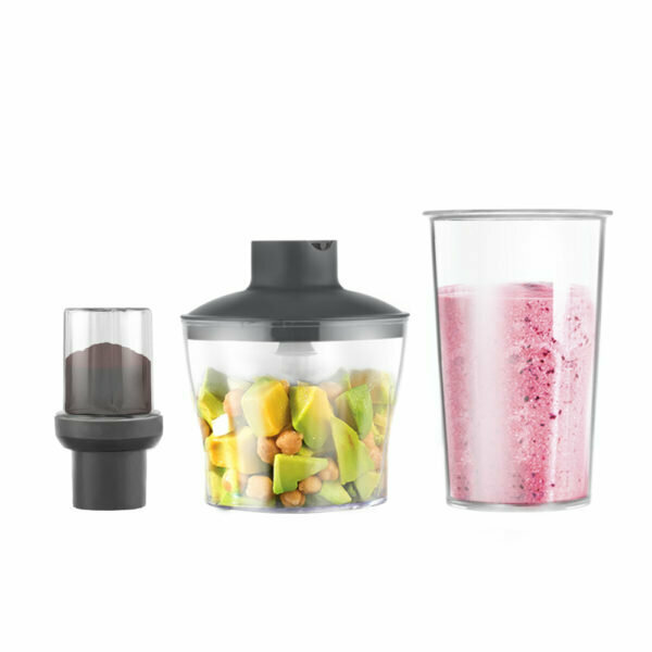В комплекте с блендером Centek CT-1313 поставляются измельчитель с чашей емкостью 650 мл, компактная мельничка для кофе, специй и орехов, насадка для приготовления пюре, венчики для взбивания, крюки для приготовления теста, погружная часть, вспениватель молока и мерный стакан объемом 800 мл.