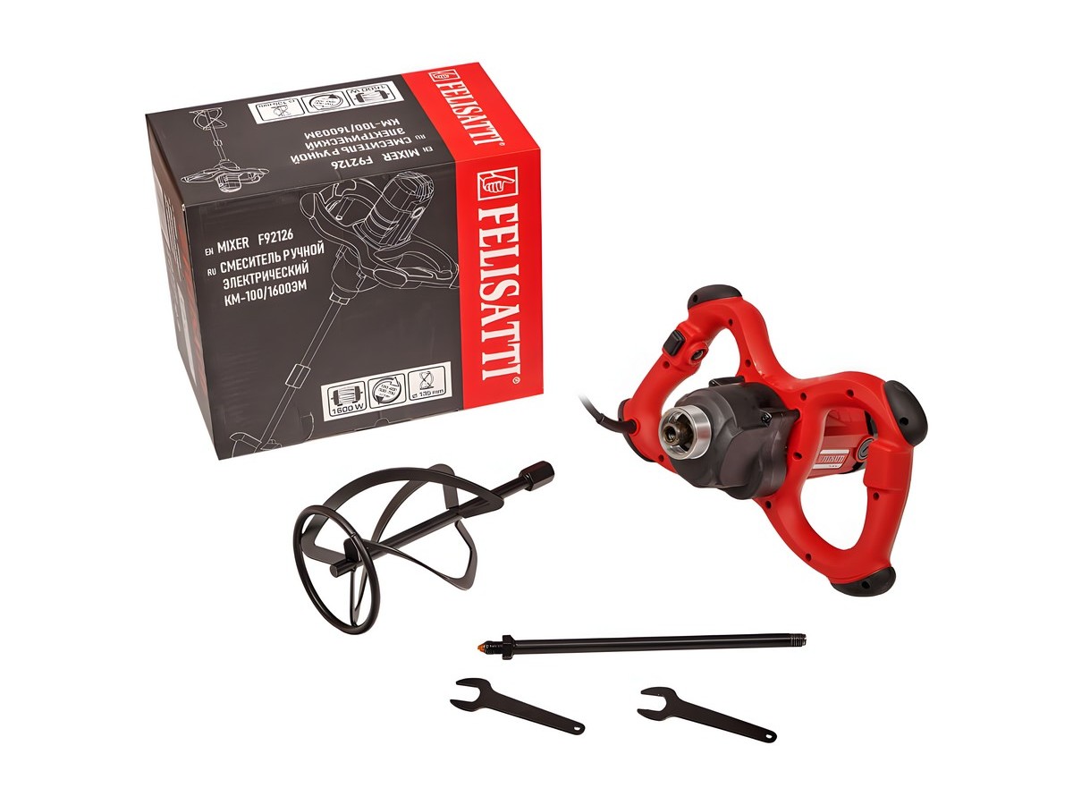 Описание Строительный миксер Felisatti FT9701 Профессиональный двухскоростной строительный миксер Felisatti FT9701 — специальный ручной электроинструмент для приготовления различных составов и растворов при выполнении ремонтно-строительных работ, начиная от кладочных растворов и заканчивая перемешиванием краски. Миксер имеет 2-х скоростной редуктор, что позволяет использовать его как для размешивания легких воднодисперсионных красок, так для замешивания растворов и строительных смесей. У миксера имеется две рукоятки, что делает работу удобной. Кнопка включения удобно расположена под рукой. Миксер имеет электронную регулировку скорости оборотов, которая также поддерживает постоянство оборотов под нагрузкой. Миксер оснащен защитой от перегрузки.