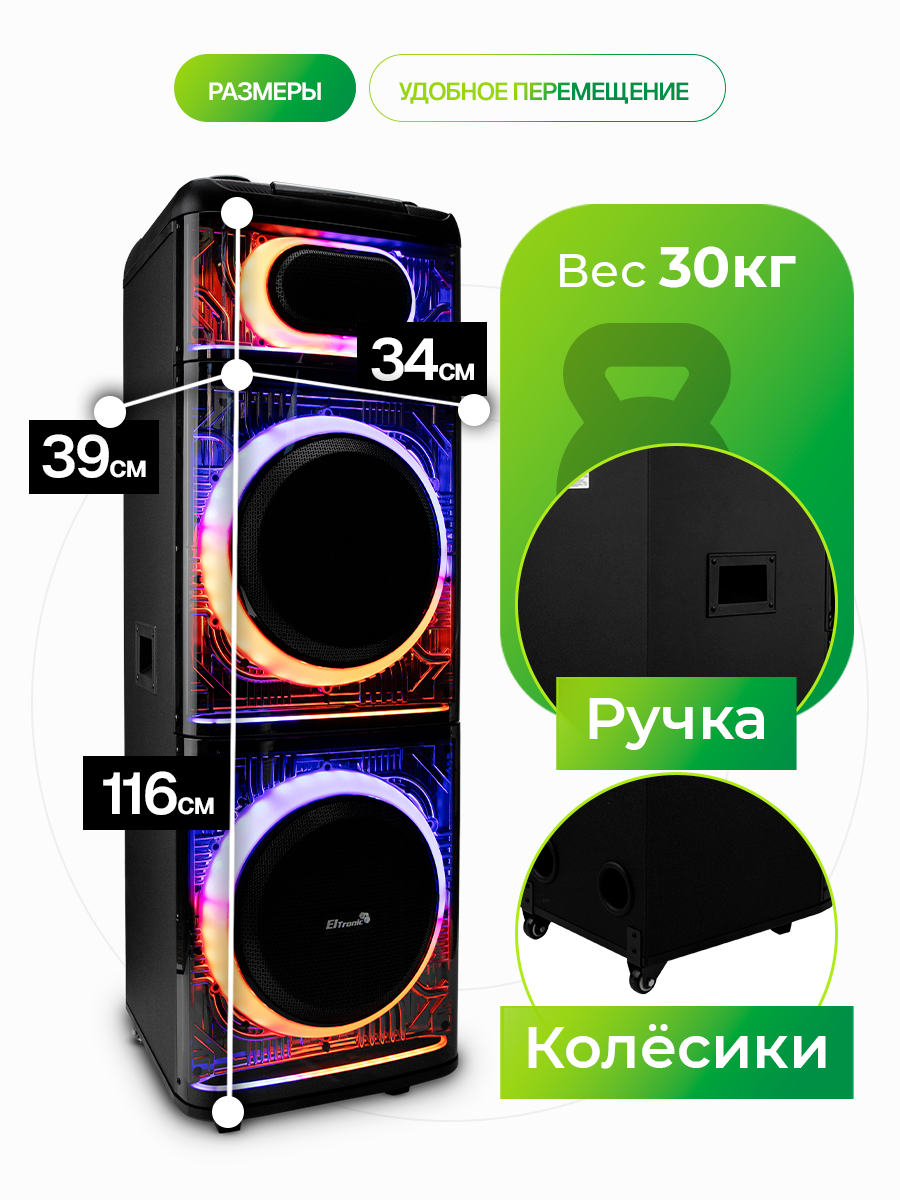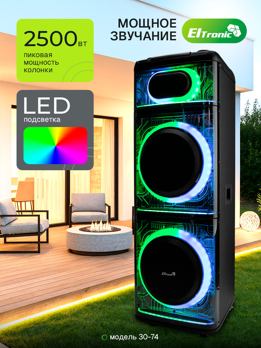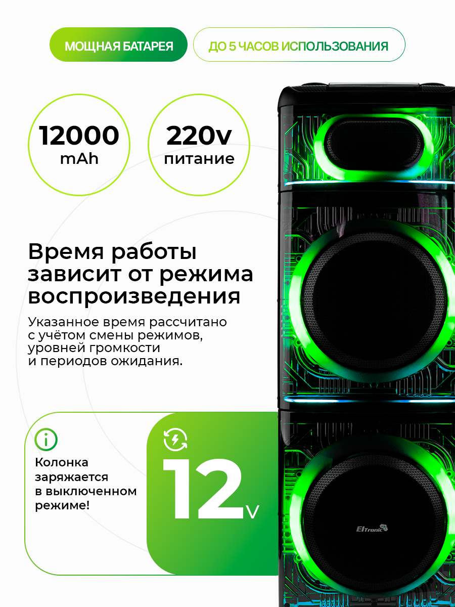 Описание Портативная акустика Eltronic 30-74 Skillets Box 2500 Беспроводная Bluetooth колонка ElTRONIC 30-74 SKILLETS BOX 2500 - это мощное и универсальное аудио-устройство, которое позволит вам наслаждаться любимой музыкой в любом месте. С этой колонкой вы можете воспроизводить музыку через Bluetooth, FM-радио, внешний накопитель или AUX-вход. Мощность впечатляет: RMS 250 Ватт и PMPO 2500 Ватт, обеспечивая качественный звук на любой громкости. Колонка питается от встроенного аккумулятора на 12В 12А, обеспечивающего до 5 часов непрерывной работы. Разнообразие разъемов (USB, SD, AUX, Jack 6.3 мм) делает его универсальным для любых устройств. Комплектация включает в себя саму колонку, кабель питания, кабель AUX, 2 беспроводных микрофона, пульт ДУ и инструкцию. Размеры упаковки: 46*47*124 см, вес - 34,5 кг. Дополнительные функции включают: регулировку звучания микрофонов, LED подсветку динамиков), шести полосный эквалайзер, колесики для удобства транспортировки. Эта колонка станет отличным спутником на любом мероприятии, обеспечивая качественный звук и удобство использования. Комплектация