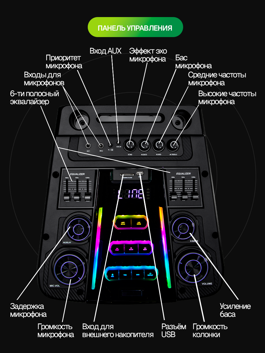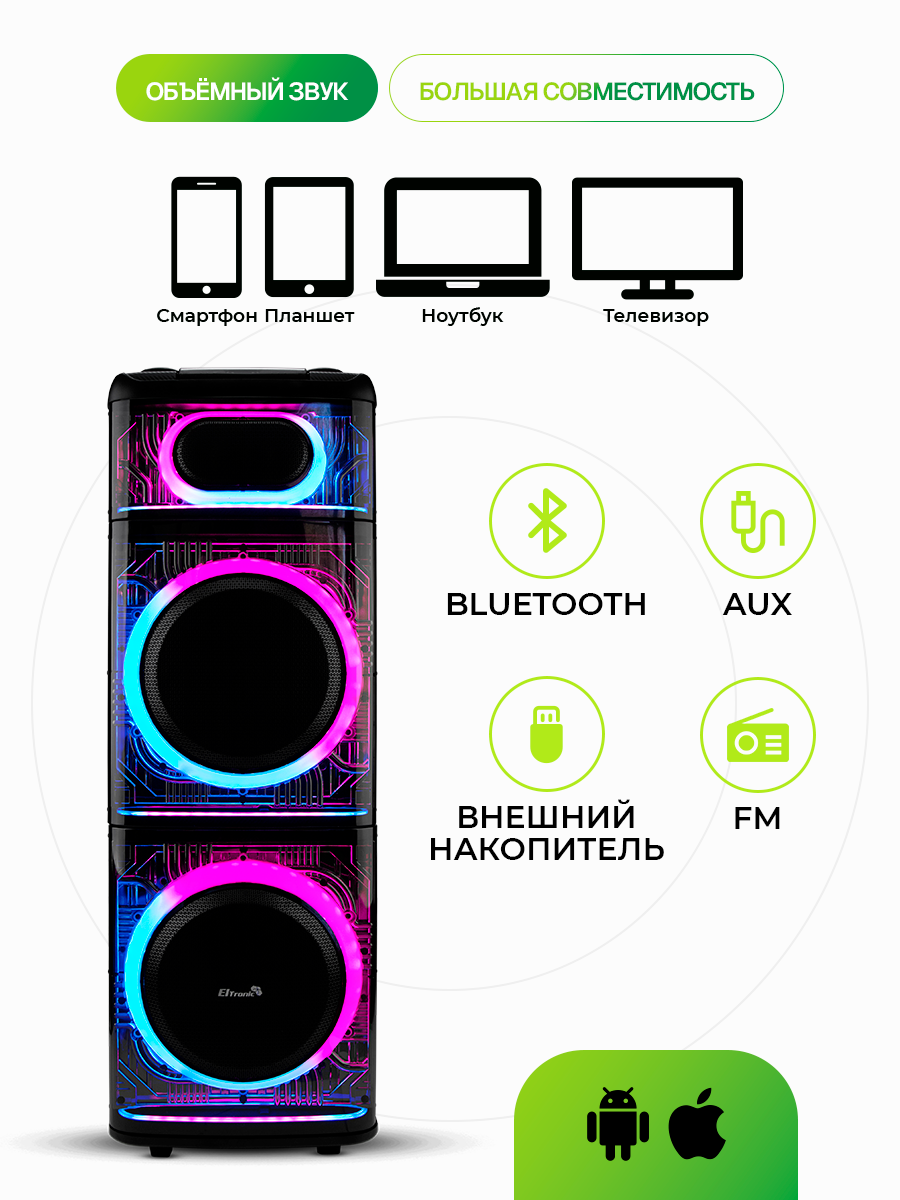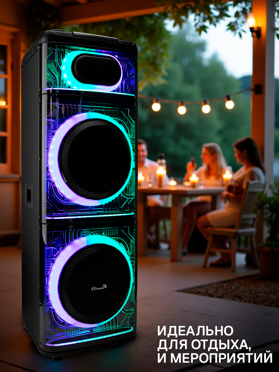 Описание Портативная акустика Eltronic 30-74 Skillets Box 2500 Беспроводная Bluetooth колонка ElTRONIC 30-74 SKILLETS BOX 2500 - это мощное и универсальное аудио-устройство, которое позволит вам наслаждаться любимой музыкой в любом месте. С этой колонкой вы можете воспроизводить музыку через Bluetooth, FM-радио, внешний накопитель или AUX-вход. Мощность впечатляет: RMS 250 Ватт и PMPO 2500 Ватт, обеспечивая качественный звук на любой громкости. Колонка питается от встроенного аккумулятора на 12В 12А, обеспечивающего до 5 часов непрерывной работы. Разнообразие разъемов (USB, SD, AUX, Jack 6.3 мм) делает его универсальным для любых устройств. Комплектация включает в себя саму колонку, кабель питания, кабель AUX, 2 беспроводных микрофона, пульт ДУ и инструкцию. Размеры упаковки: 46*47*124 см, вес - 34,5 кг. Дополнительные функции включают: регулировку звучания микрофонов, LED подсветку динамиков), шести полосный эквалайзер, колесики для удобства транспортировки. Эта колонка станет отличным спутником на любом мероприятии, обеспечивая качественный звук и удобство использования. Комплектация