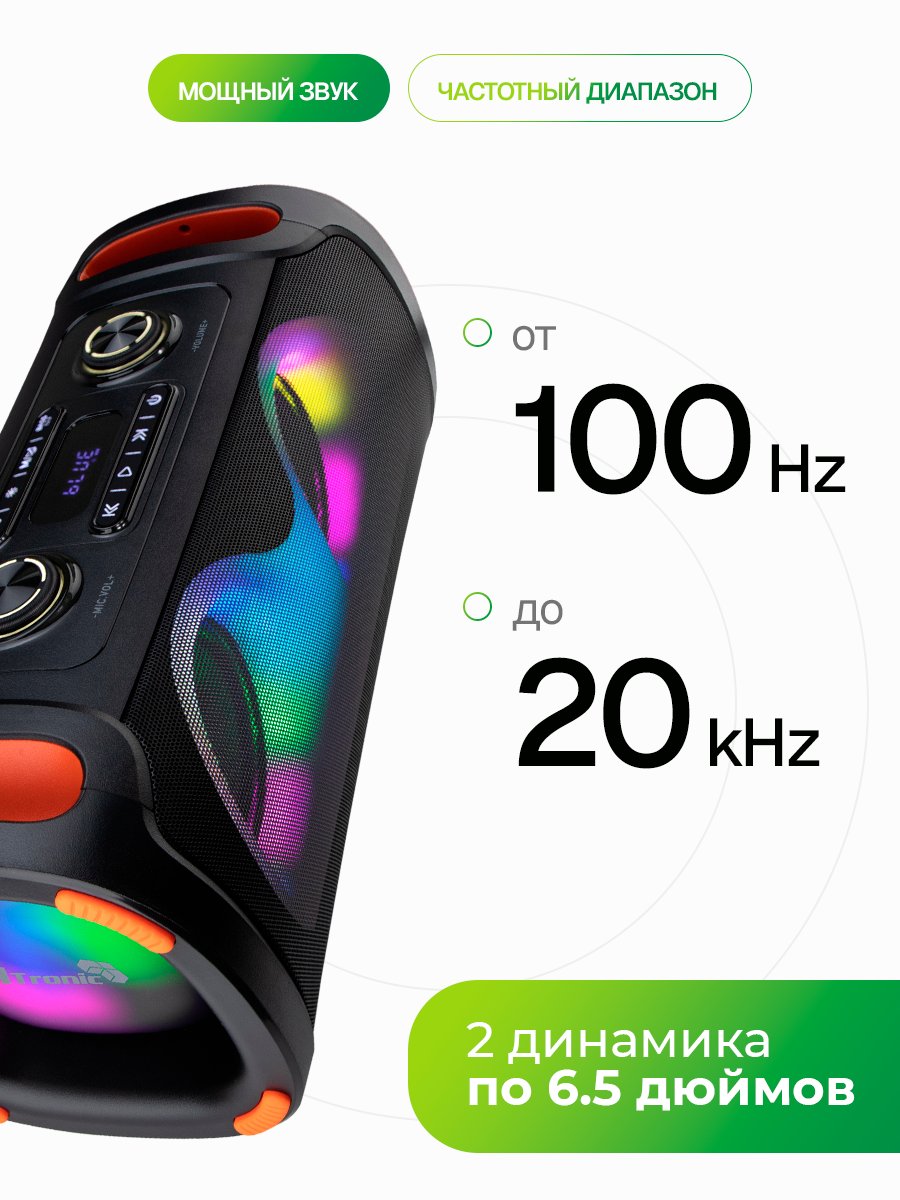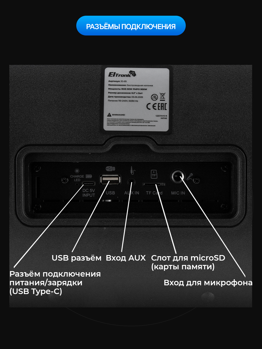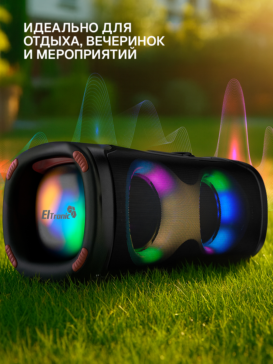Описание Портативная акустика Eltronic 30-85 Dance Box 900 Black Портативная колонка ELTRONIC 30-85 DANCE BOX 900 - это мощное и функциональное устройство, которое станет незаменимым помощником на любом мероприятии. ELTRONIC 30-85 DANCE BOX 900 оснащена двумя динамиками по 6.5 дюймов, что обеспечивает громкий и чистый звук. Мощность колонки составляет RMS 90 Ватт и PMPO 900 Ватт, частотный диапазон от 100 Гц до 20 кГц, а разделение составляет 50 дБ. ELTRONIC 30-85 DANCE BOX 900 поддерживает различные режимы воспроизведения: Bluetooth, внешний накопитель и Aux. Это позволяет подключить колонку к любому устройству, имеющему соответствующий интерфейс, и наслаждаться любимой музыкой. Питание колонки осуществляется от сети 5V или встроенного аккумулятора на 6000mAh. Это позволяет использовать устройство в любом месте, где есть доступ к электричеству. ELTRONIC 30-85 DANCE BOX 900 оснащена различными разъемами: USB, microSD, Jack 6.3 мм для микрофона или гитары, а также Auх. Это позволяет подключать к колонке различные устройства и носители информации. В комплект поставки входит кабель питания, ремень для переноски, пульт дистанционного управления и инструкция. Портативная колонка ELTRONIC 30-85 DANCE BOX 900 имеет стильный черный цвет и дисплей, что делает ее еще более привлекательной. Динамическая подсветка и возможность заряда от Power Bank добавляют колорите и функциональности. Выбирая портативную колонку ELTRONIC 30-85 DANCE BOX 900, вы получаете мощный и функциональный инструмент для воспроизведения музыки в любых условиях. ELTRONIC 30-85 DANCE BOX 900 акустическая колонка