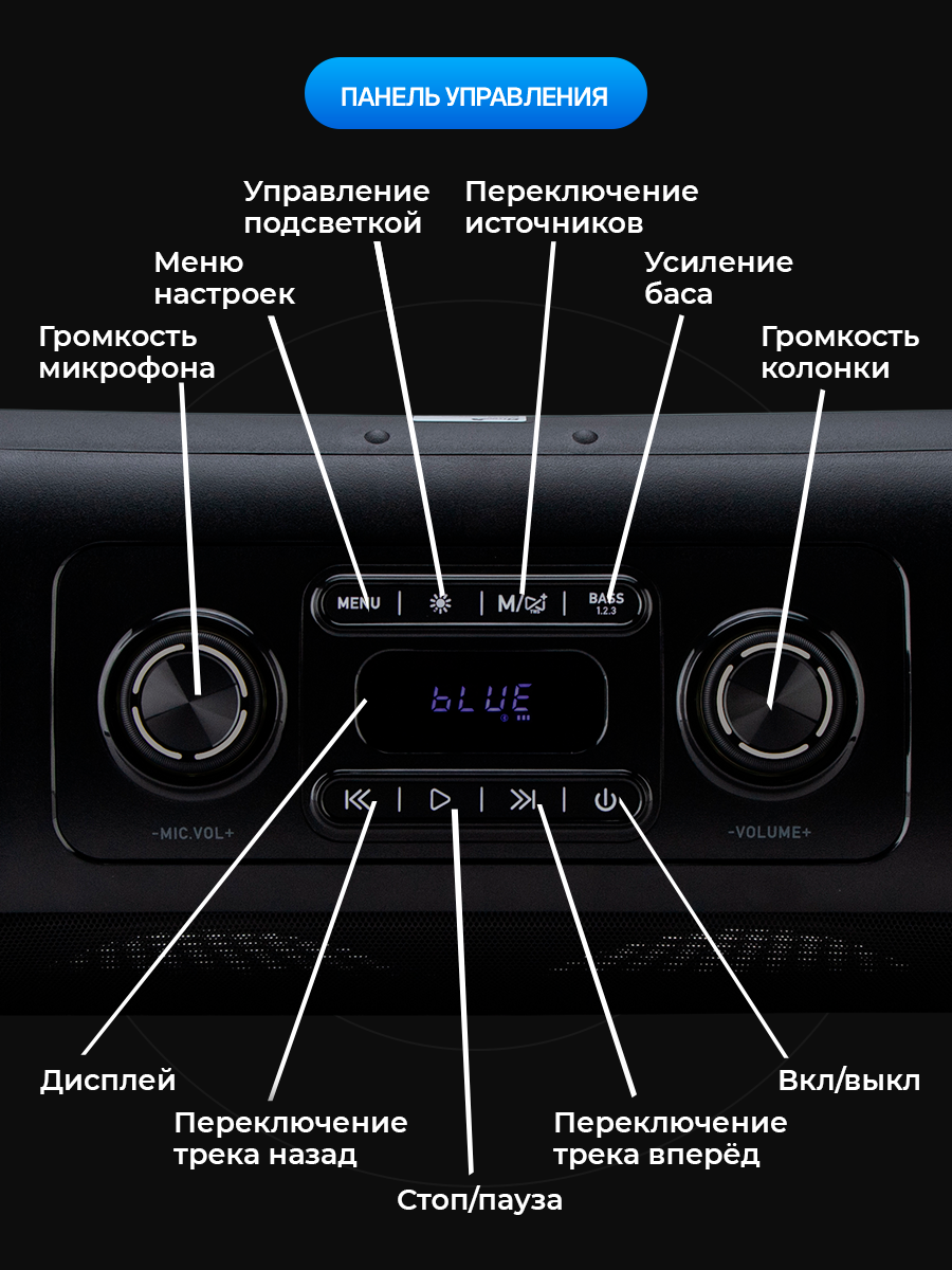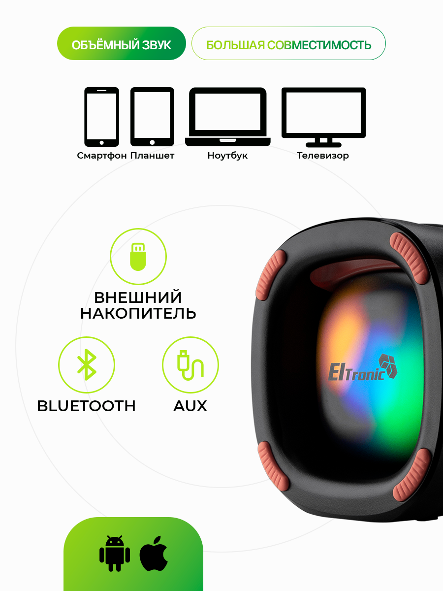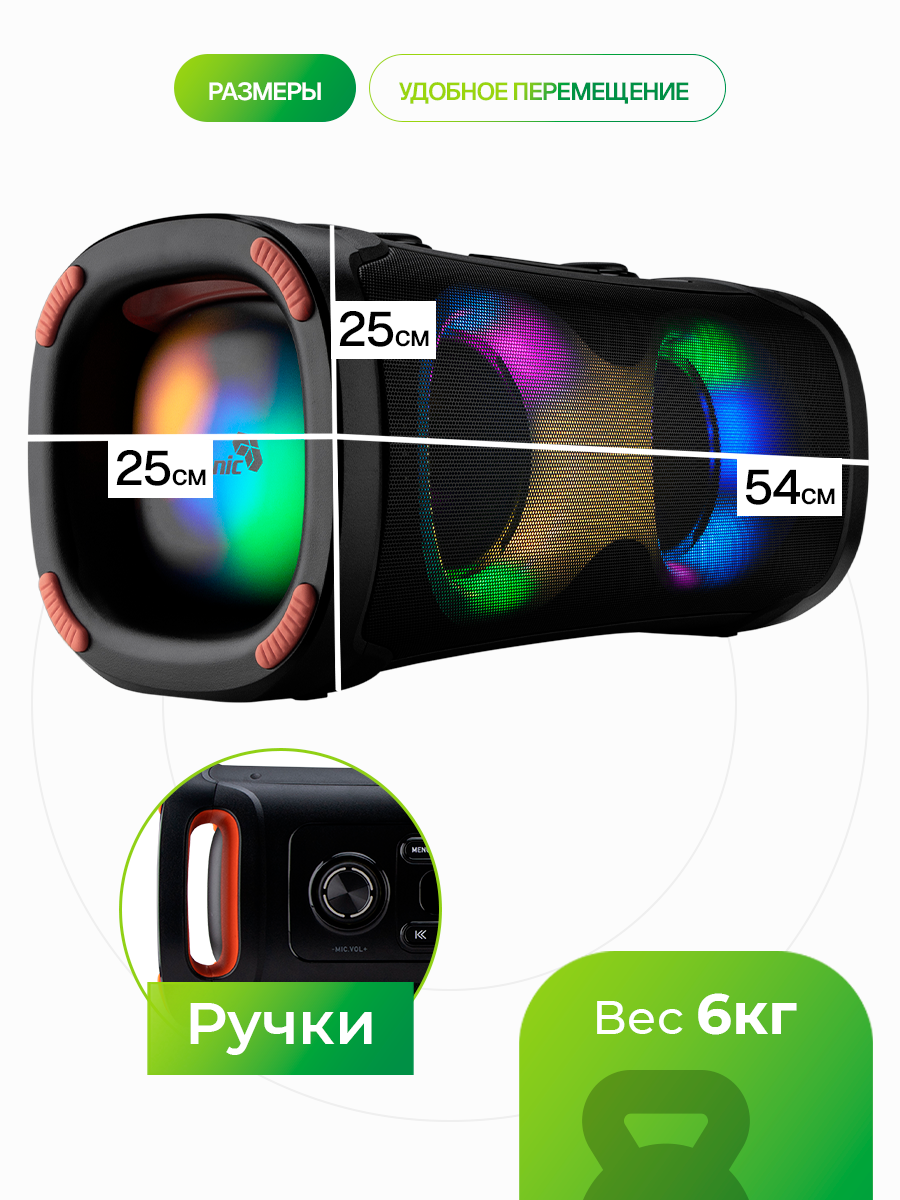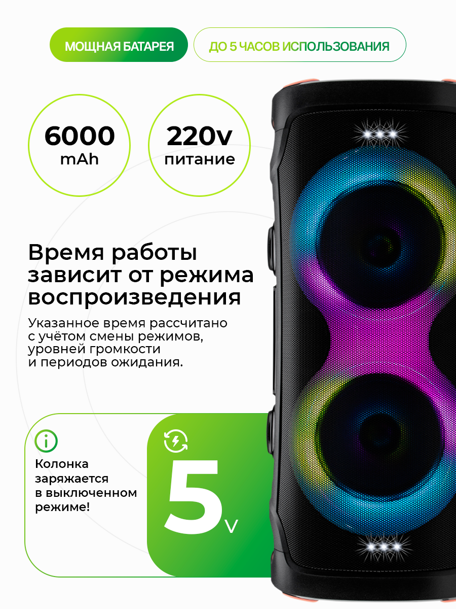 Описание Портативная акустика Eltronic 30-85 Dance Box 900 Black Портативная колонка ELTRONIC 30-85 DANCE BOX 900 - это мощное и функциональное устройство, которое станет незаменимым помощником на любом мероприятии. ELTRONIC 30-85 DANCE BOX 900 оснащена двумя динамиками по 6.5 дюймов, что обеспечивает громкий и чистый звук. Мощность колонки составляет RMS 90 Ватт и PMPO 900 Ватт, частотный диапазон от 100 Гц до 20 кГц, а разделение составляет 50 дБ. ELTRONIC 30-85 DANCE BOX 900 поддерживает различные режимы воспроизведения: Bluetooth, внешний накопитель и Aux. Это позволяет подключить колонку к любому устройству, имеющему соответствующий интерфейс, и наслаждаться любимой музыкой. Питание колонки осуществляется от сети 5V или встроенного аккумулятора на 6000mAh. Это позволяет использовать устройство в любом месте, где есть доступ к электричеству. ELTRONIC 30-85 DANCE BOX 900 оснащена различными разъемами: USB, microSD, Jack 6.3 мм для микрофона или гитары, а также Auх. Это позволяет подключать к колонке различные устройства и носители информации. В комплект поставки входит кабель питания, ремень для переноски, пульт дистанционного управления и инструкция. Портативная колонка ELTRONIC 30-85 DANCE BOX 900 имеет стильный черный цвет и дисплей, что делает ее еще более привлекательной. Динамическая подсветка и возможность заряда от Power Bank добавляют колорите и функциональности. Выбирая портативную колонку ELTRONIC 30-85 DANCE BOX 900, вы получаете мощный и функциональный инструмент для воспроизведения музыки в любых условиях. ELTRONIC 30-85 DANCE BOX 900 акустическая колонка