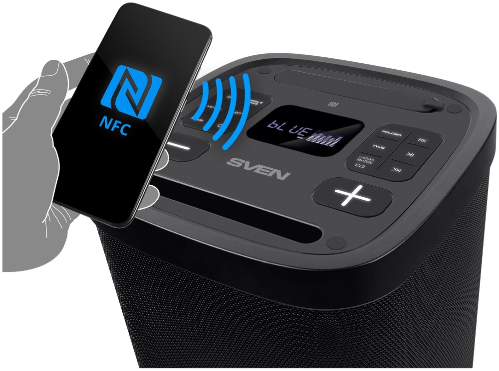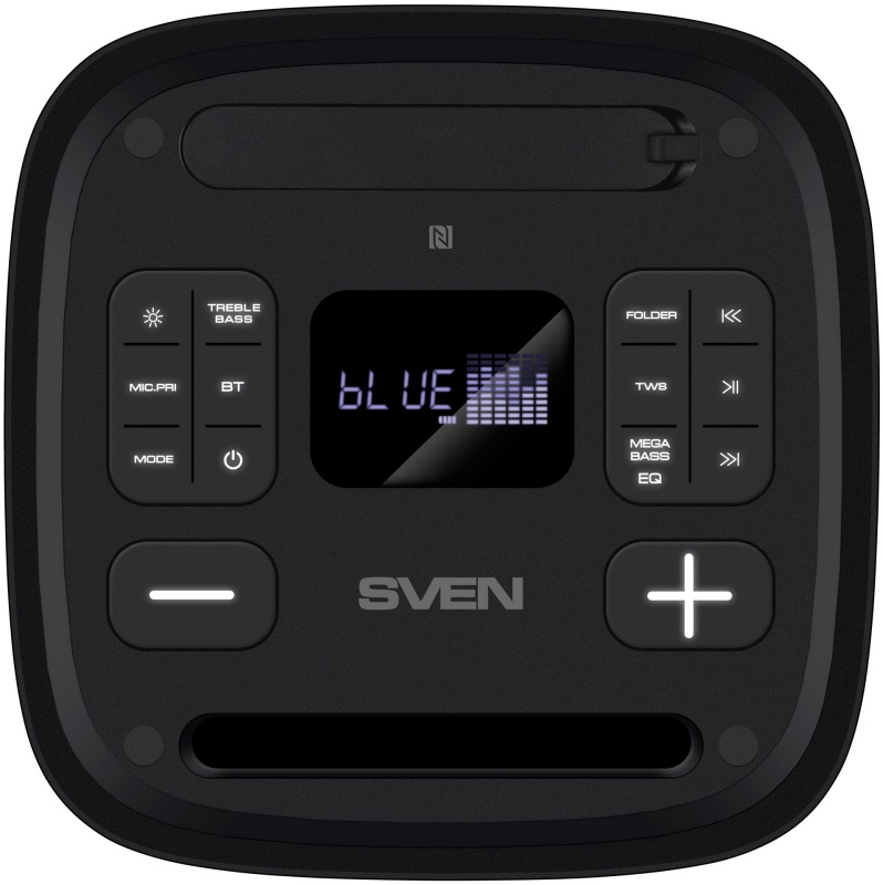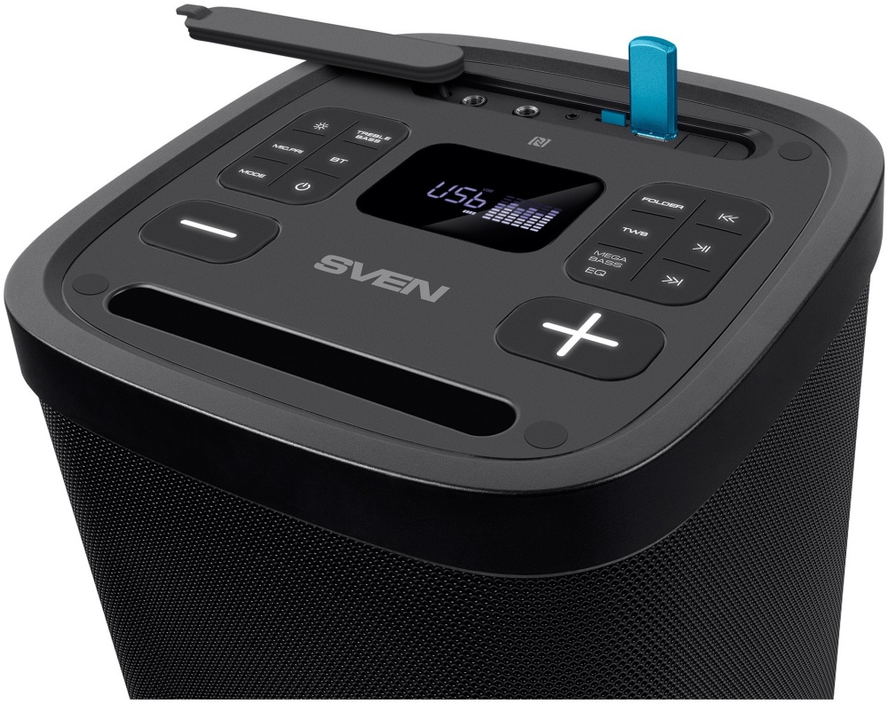 Описание Портативная акустика Sven PS-950 [SV-022396] Системы компании SVEN прочно обосновались в центре самых веселых вечеринок: от небольших дачных посиделок до танцев с караоке на свежем воздухе. Для тех, кто предпочитает максимальную мобильность, есть небольшие Bluetooth-колонки. Ну а любители эффектного звука и яркой подсветки выбирают крупную и мощную акустику, линейка которой получила отличное пополнение в виде SVEN PS-950. При массе 9,2 кг она выдает 160 Вт мощности, что позволяет озвучить даже большую вечеринку на свежем воздухе — благодаря защите от брызг IPX4 колонка пригодна для использования под открытым небом. Основным способом подключения SVEN PS-950 к источникам звука является Bluetooth, поддерживается опция быстрого сопряжения колонки со смартфоном при помощи NFC, которая бывает очень полезна на дружеских вечеринках, когда поделиться своими любимыми треками хотят многие из гостей. Смартфон или планшет можно удобно и надежно разместить в специальной подставке на верхней панели. Для тех, кто хочет получить выраженный стереоэффект и еще больше громкости, предусмотрена возможность установки беспроводного подключения сразу двух колонок к одному источнику. Если от танцев вы решили перейти к пению, аудиосистема для вечеринок PS-950 будет полезна и тут, ведь у нее есть целых два микрофонных входа. Подключаем микрофоны, берем фонограмму — и вперед, начинаем петь караоке. Для более объемного звучания голоса предусмотрен эффект эхо, выраженность которого можно настроить с помощью отдельного регулятора. Перед вами вновь не просто портативная акустика, а мобильная аудиосистема с широчайшим набором функций — все в лучших традициях компании SVEN. Еще одна хорошая традиция производителя — это доступность устройств широкому кругу пользователей.