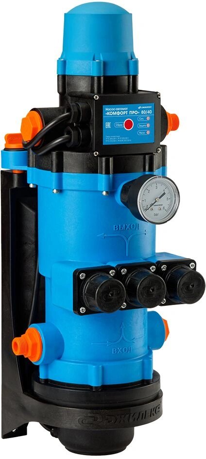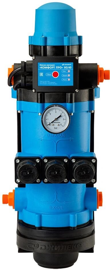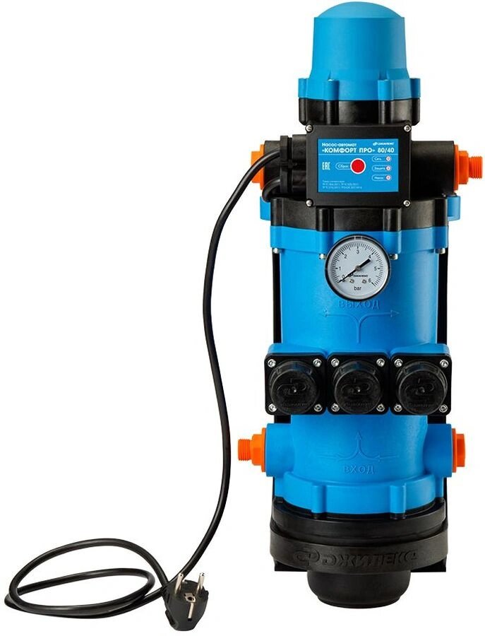 Описание Насос поверхностный Джилекс Комфорт Про 80/40 [4004] Центробежный поверхностный насос-автомат Джилекс Комфорт Про 80/40 предназначен для повышения давления чистой холодной воды в различных системах водоснабжения. Область применения Поверхностный насос-автомат 80/40 рекомендуется для бесперебойного водоснабжения коттеджей, дач, ферм и других потребителей. Используется для подачи чистой воды из: Преимущества поверхностного насоса-автомата «КОМФОРТ ПРО» 80/40 Высокий КПД, бесшумная работа и стабильный напор. Позволяет повысить давление в магистрали при изменении расхода воды. Изготовлен из высококачественных материалов, разрешенных для контакта с питьевой водой. Оснащен контролем потока (модель 25/16) или блоком автоматики (модели 55/25, 60/30 и 80/40), управляющими насосом и защищающими его от работы по «сухому ходу». Прост в монтаже и эксплуатации, отличается надежностью и долговечностью.