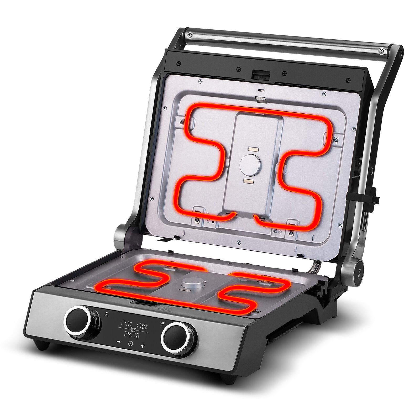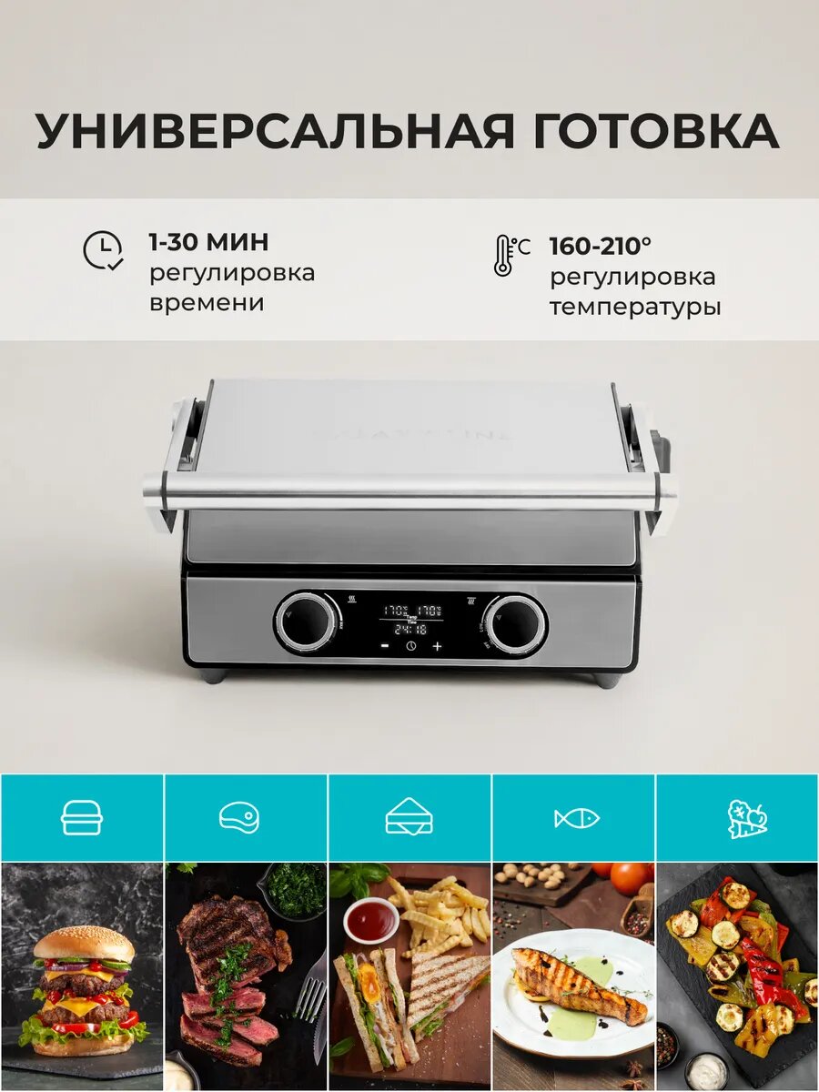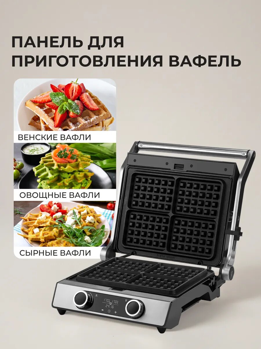 Описание Гриль GALAXY LINE GL 2989 Электрический гриль Galaxy Line GL2989 - это многофункциональный помощник на вашей кухне, который предназначен для приготовления разнообразных блюд, от сочных стейков и овощей до горячих бутербродов и венских вафель. Мощность 2200 Вт обеспечивает быстрый нагрев и равномерное приготовление продуктов, а регулировка температуры от 160 до 210 °C позволяет точно настроить параметры для каждого блюда. Сменные антипригарные панели гриля и вафель легко очищаются после использования и предотвращают пригорание продуктов. Раскрытие гриля на 180° и регулируемая крышка позволяют адаптировать устройство под любой продукт и толщину. Таймер до 30 минут позволяет контролировать время приготовления, а LED-дисплей делает управление грилем удобным и интуитивно понятным. Размер рабочей поверхности составляет 230х300 мм, а длина шнура питания - 0,8 м. Galaxy Line GL2989 - это гриль, который подстраивается под ваше меню и обеспечивает быстрое и качественное приготовление разнообразных блюд.