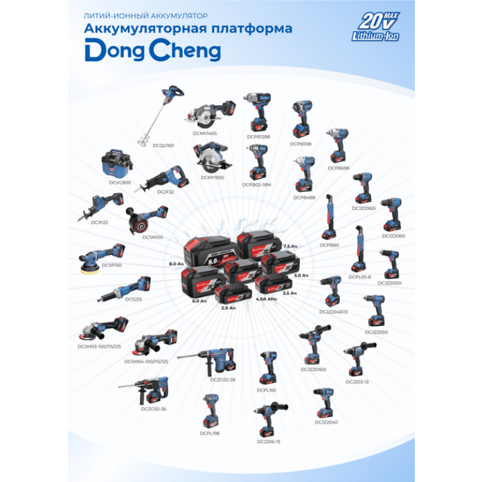 Описание Аккумулятор DongCheng FFBL2080 Литий-ионный аккумулятор FFBL2080 (емкость 8 Ач) совместим со всеми аккумуляторными инструментами и зарядными устройствами 20В бренда DongCheng. Совместимость со всеми инструментами линейки 20В Один аккумулятор подходит для дрели, угловой шлифмашины, перфоратора и других инструментов 20В бренда DongCheng. Совместимость со всеми зарядными устройствами линейки 20В Время полной зарядки с помощью зарядного устройства FFCL20-02 – 200 мин., FFCL20-04 и FFCL2040-2 – 125 мин., FFCL2080-02 – 80 мин. Индикатор заряда батареи Точное отображение оставшегося заряда помогает контролировать уровня заряда для непрерывной работы. Встроенная защита от перегрева и перезаряда Встроенная электронная защита отключает двигатель при перегреве аккумулятора. При достижении уровня практически полной разрядки инструмент выключается. Эти функции продлевают срок службы инструмента.
