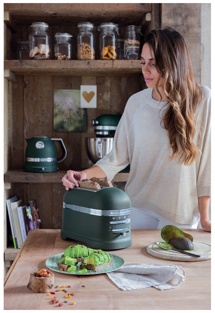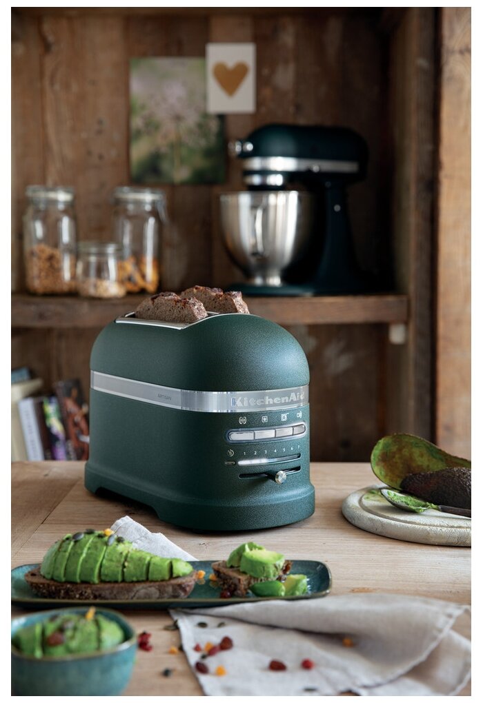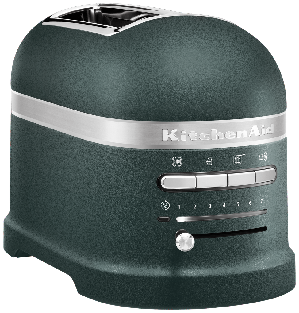 Описание Тостер KitchenAid 5KMT2204EPP Тостер KitchenAid 5KMT2204EPP представляет собой сочетание современных технологий, позволяющих быстро поджарить хлеб на завтрак, и стильного дизайна. Его корпус пальмового цвета сделан из прочного металла. В нем предусмотрено два широких слота для ломтиков, которые после загрузки центрируются автоматически. Электронная система управления позволяет выбрать одну из семи степеней прожарки: от легкого подрумянивания до максимального хруста. Специальные режимы пригодятся, чтобы разморозить хлеб, подогреть сэндвичи, булочки и бейглы. Благодаря подсветке вы найдете нужную кнопку, даже если на кухне темно. Для крошек в тостере KitchenAid 5KMT2204EPP предусмотрен поддон. Он съемный, поэтому в любой момент вы можете достать его, очистить и установить на место. Прорезиненные ножки обеспечивают безупречную устойчивость. Когда вы не пользуетесь устройством, сетевой шнур можно спрятать в отсек на корпусе.