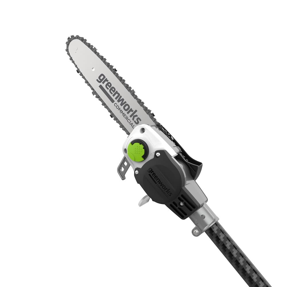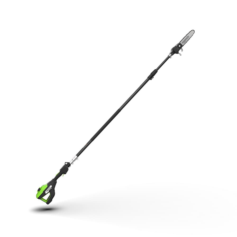 Описание Высоторез GreenWorks GD82PS25 [1402407] Высоторез-сучкорез аккумуляторный GREENWORKS 82V GD82PS25 - профессиональный инструмент для подрезки ветвей и сучьев на высоте до 6 метров. Основной особенностью этой модели является 4-х секционная металлическая штанга, благодаря которой максимальная длина устройства составляет 396 см. Инструмент оснащается цепной пилой с шиной 25 см. Основной особенностью высотореза Greenworks GD82PS25 82V является 4-х секционная металлическая штанга, благодаря которой максимальная длина устройства составляет 390 см. Инструмент оснащен цепной пилой с шиной 25 см и современным бесщеточным двигателем DigiPro с высоким крутящим моментом. Скорость цепи при работе достигает 11,8 м/с. Цепь и шина автоматически смазываются, масляный бачок имеет прозрачный корпус для контроля уровня оставшегося масла. Важные преимущества аккумуляторного высотореза – автономность работы и экономия на бензине. Длительное время работы – до 110 срезов от батареи 5 Ач, а также усиленная конструкция и простота эксплуатации делают инструмент отличным помощником для бытовых и профессиональных садовых работ. Для защиты от порезов предусмотрен предохранитель, предотвращающий случайные включения устройства, а для надежной работы двигатель имеет защиту от перегрузок. Инструмент оснащен передовым бесщеточным двигателем DigiPro. Такой двигатель меньше подвержен износу, имеет более продолжительный срок службы и не нуждается в сложном обслуживании, при этом экологичен и отличается пониженным уровнем шума и вибрации. Модель работает от аккумуляторов 82V, совместимых с другими устройствами линейки Greenworks 82V Commercial. Это высококлассная техника, которая отлично подойдет как для коммерческого использования, так и для работ на частных участках.