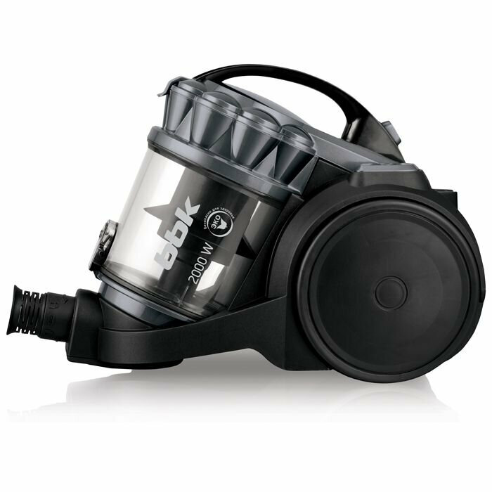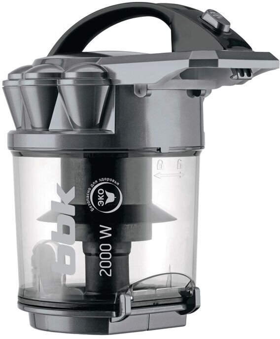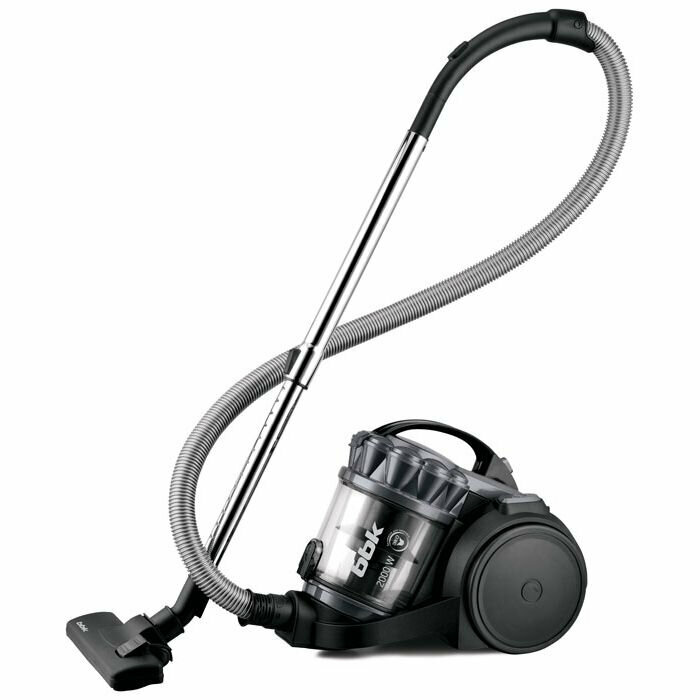 Пылесос BBK BV1505 представлен в сером корпусе с большими колесами, 2-литровым контейнером для пыли и телескопической трубой.
