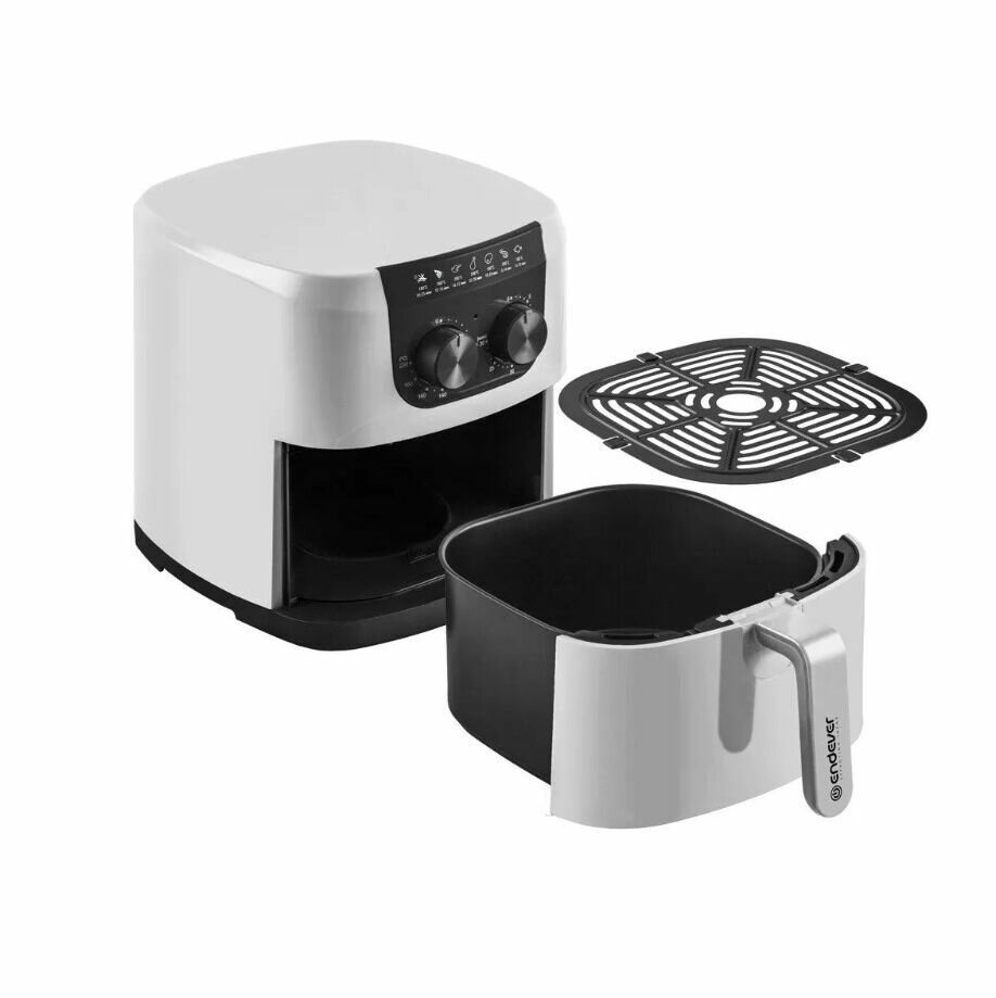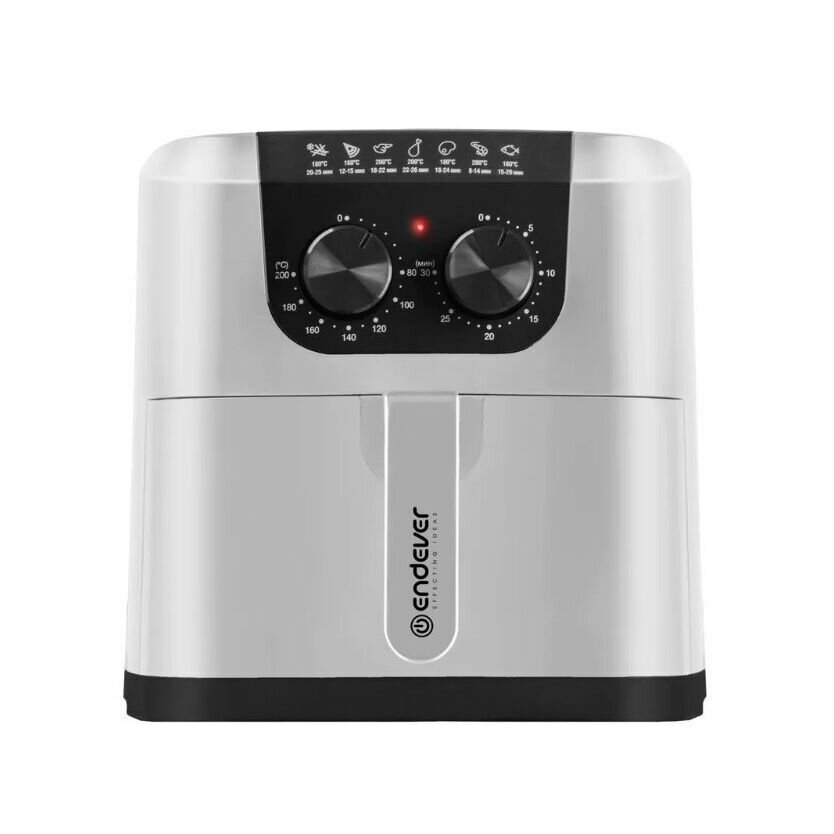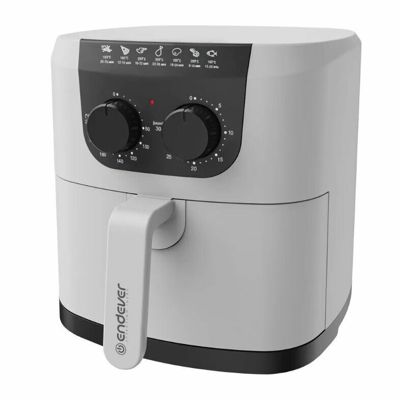 Описание Аэрогриль ENDEVER Skyline AF-126 Аэрогриль Endever Skyline AF-126 замечателен не только стильным дизайном. Он может использоваться как аэрогиль, аэрофритюрница и духовка. Благодаря обжариванию продуктов циркулирующим горячим воздухом и равномерной конвекции, вы получите такие блюда как картофель фри, наггетсы, запечённые овощи, бифштекс и многое другое, хрустящими и вкусными, а самое главное для этого не нужно использовать большое количество масла. С помощью механического управления аэрогриля, вы сможете самостоятельно регулировать температуру и время приготовления. Диапазон температуры от 80 до 200 градусов. А таймер на 30 минут позволит сэкономить время, не требуя присутствия на кухне во время приготовления. Аэрогриль Endever Skyline AF-126 имеет мощность 1800 Вт и оснащен контейнером, объемом 4,5 литра, что позволит приготовить Вам достаточное количество продуктов за один раз. Антипригарное покрытие защитит продукты от прилипания к поверхности. Модель также обладает защитой от перегрева, автоматическим отключением и индикатором работы. Дополнительной особенностью аэрогриля, является то, что его можно использовать для подогрева блюд. В комплект аэрогриля входит книга рецепта, где Вы сможете найти большое разнообразие блюд для Вас и Ваших близких.