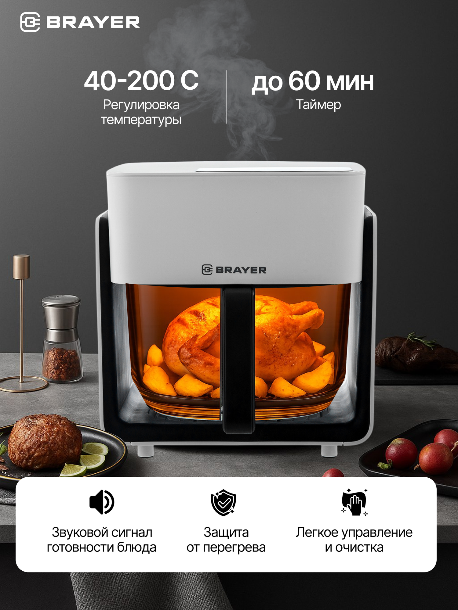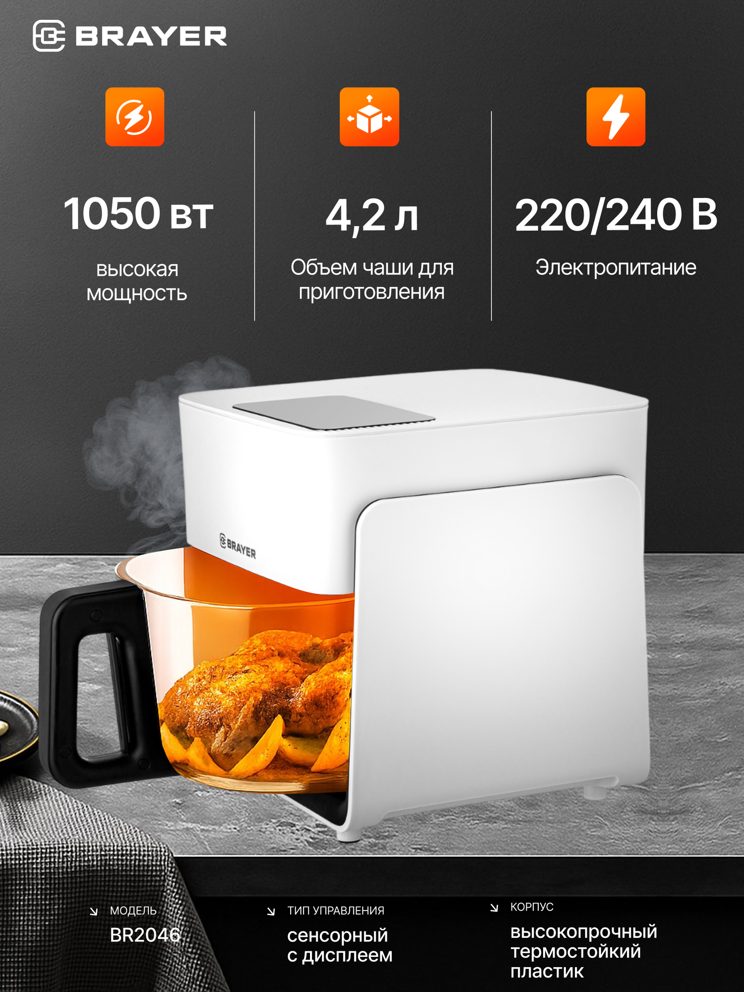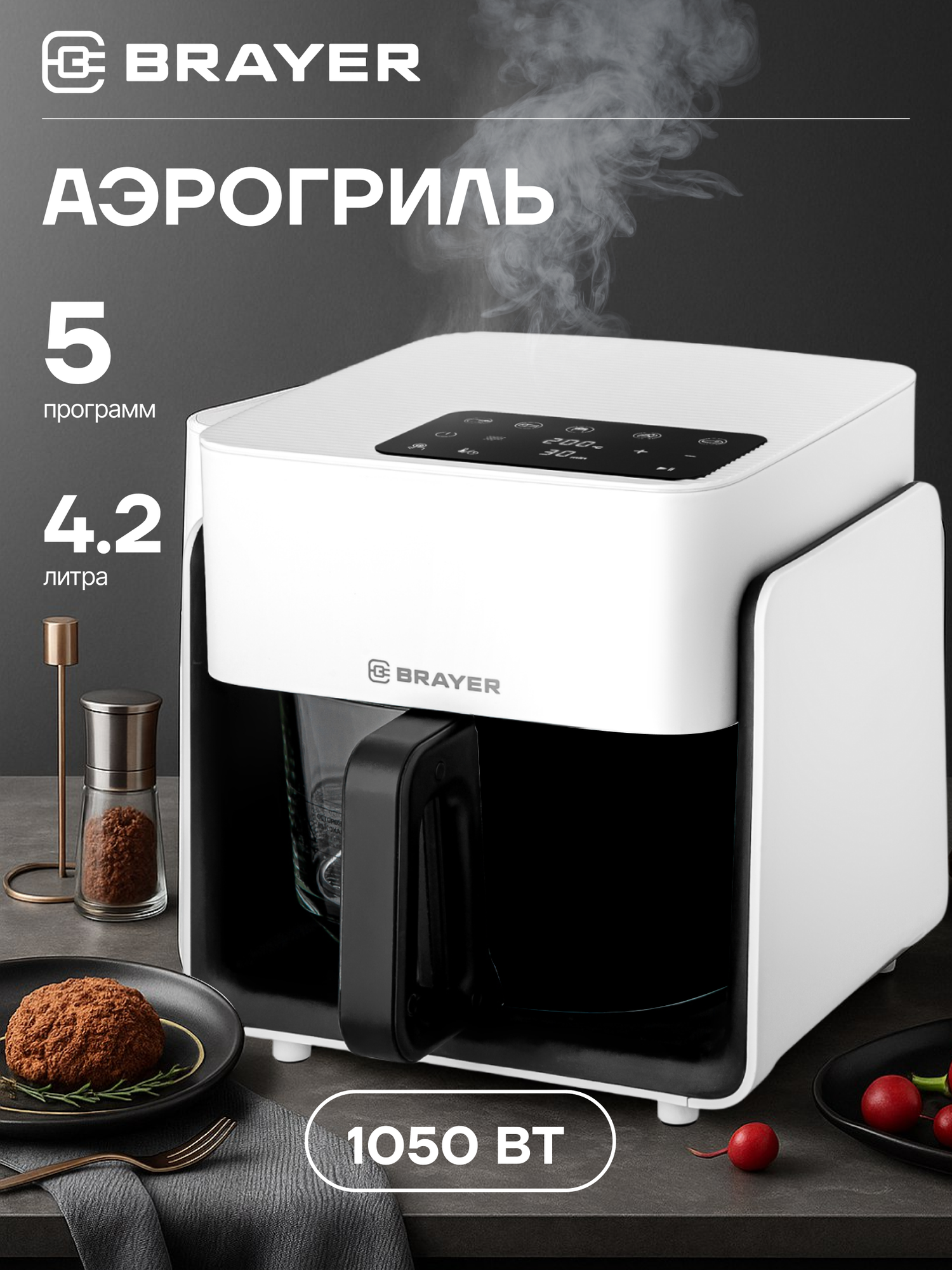 Описание Аэрогриль Brayer BR-2046 Аэрогриль BRAYER BR2046 – компактный помощник для здоровой кухни Идеальное решение для быстрого и полезного приготовления BRAYER BR2046 – это современный аэрогриль с стеклянной чашей 4,2 литра, который позволяет готовить любимые блюда с минимальным использованием масла. Благодаря мощности 1050 Вт и 5 автоматическим программам вы получите идеально приготовленные блюда без лишних хлопот. Главные особенности: 5 предустановленных программ – курица, рыба, картофель фри, овощи и мясо Стеклянная чаша – возможность контролировать процесс приготовления Точная регулировка температуры от 40°C до 200°C Сенсорное управление + LCD-дисплей – интуитивно понятный интерфейс
