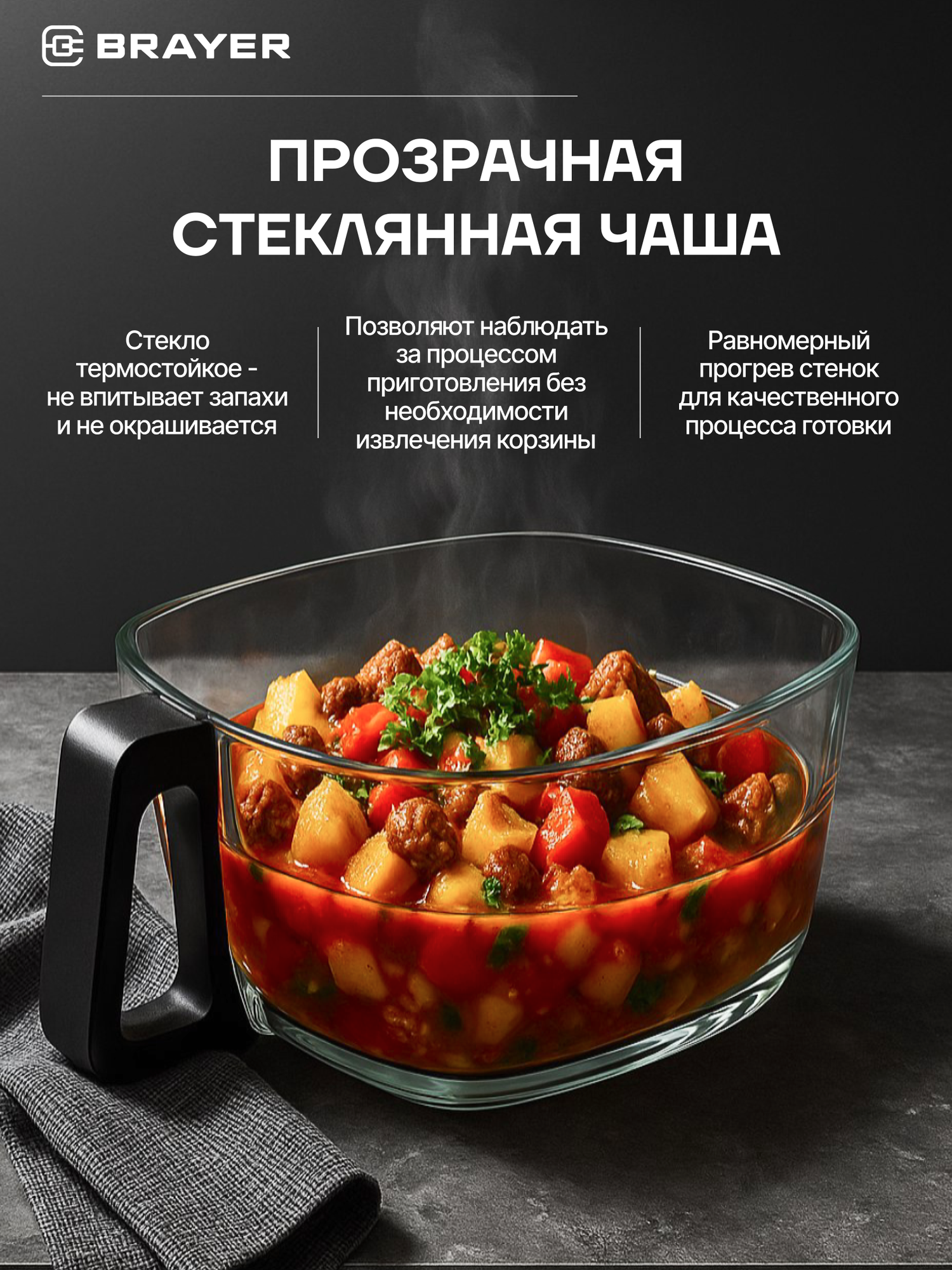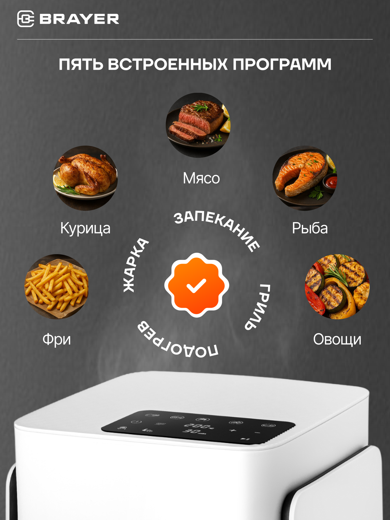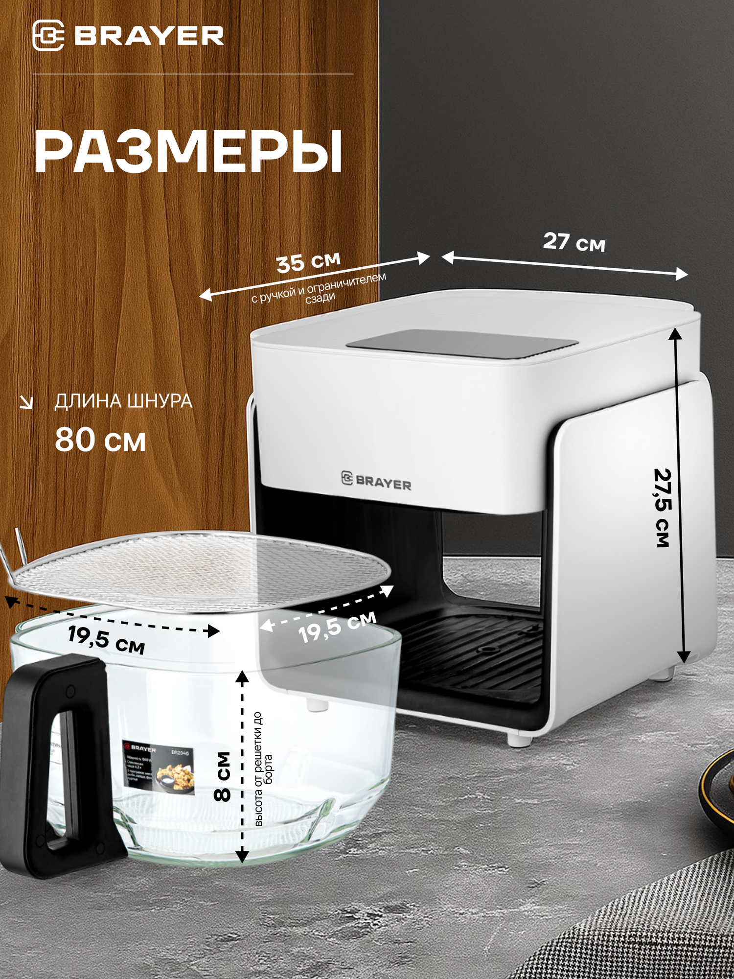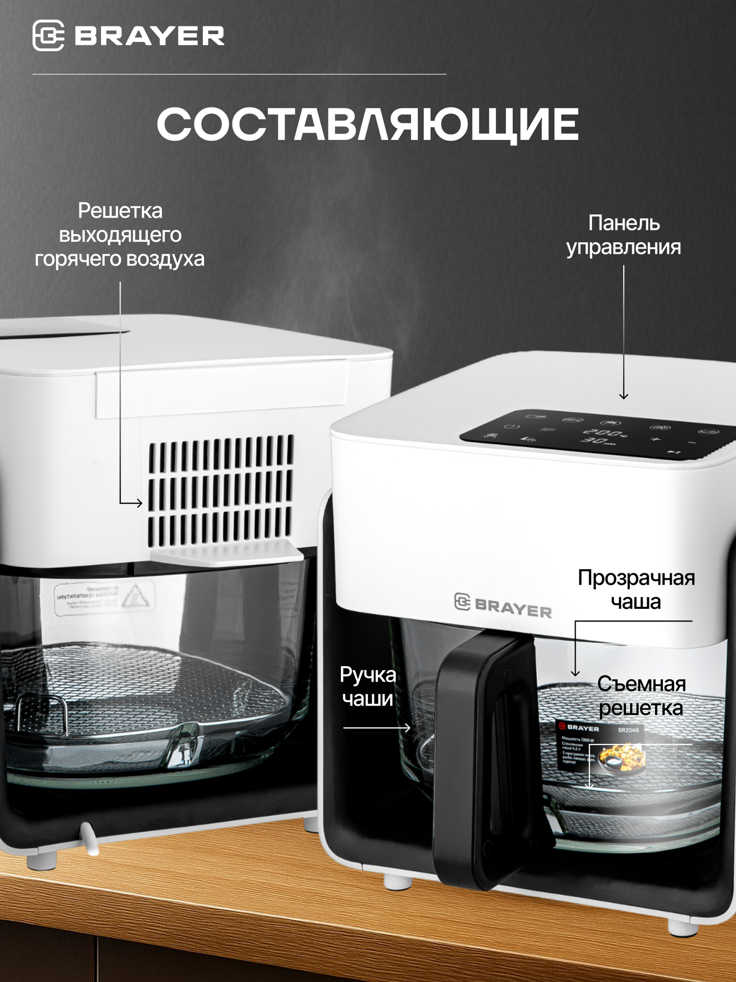 Описание Аэрогриль Brayer BR-2046 Аэрогриль BRAYER BR2046 – компактный помощник для здоровой кухни Идеальное решение для быстрого и полезного приготовления BRAYER BR2046 – это современный аэрогриль с стеклянной чашей 4,2 литра, который позволяет готовить любимые блюда с минимальным использованием масла. Благодаря мощности 1050 Вт и 5 автоматическим программам вы получите идеально приготовленные блюда без лишних хлопот. Главные особенности: 5 предустановленных программ – курица, рыба, картофель фри, овощи и мясо Стеклянная чаша – возможность контролировать процесс приготовления Точная регулировка температуры от 40°C до 200°C Сенсорное управление + LCD-дисплей – интуитивно понятный интерфейс