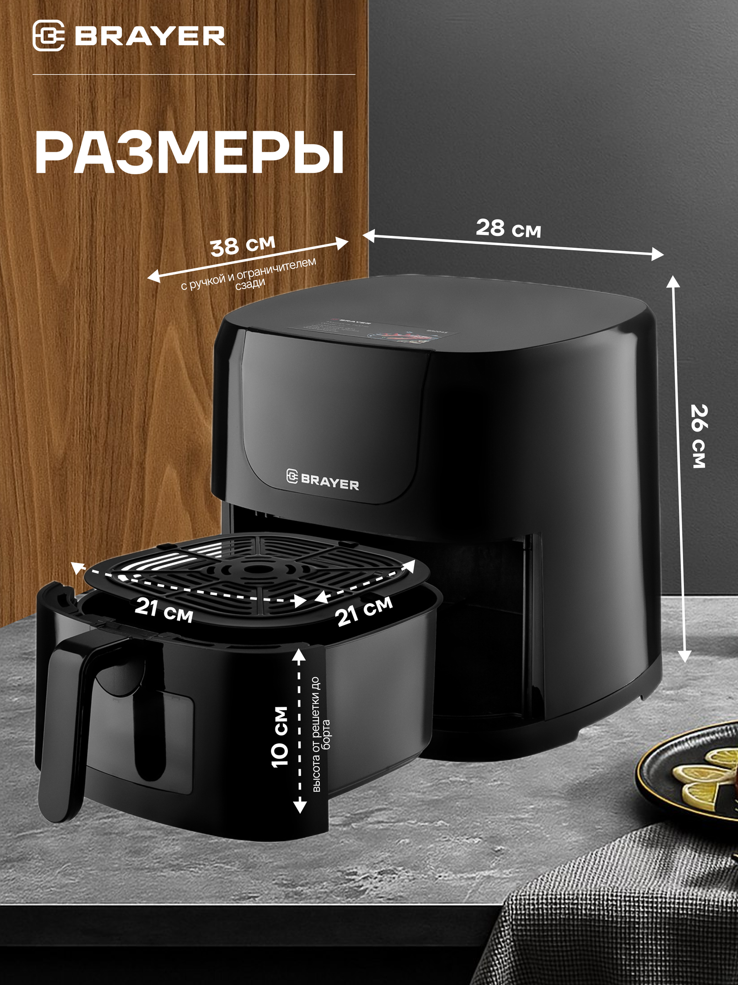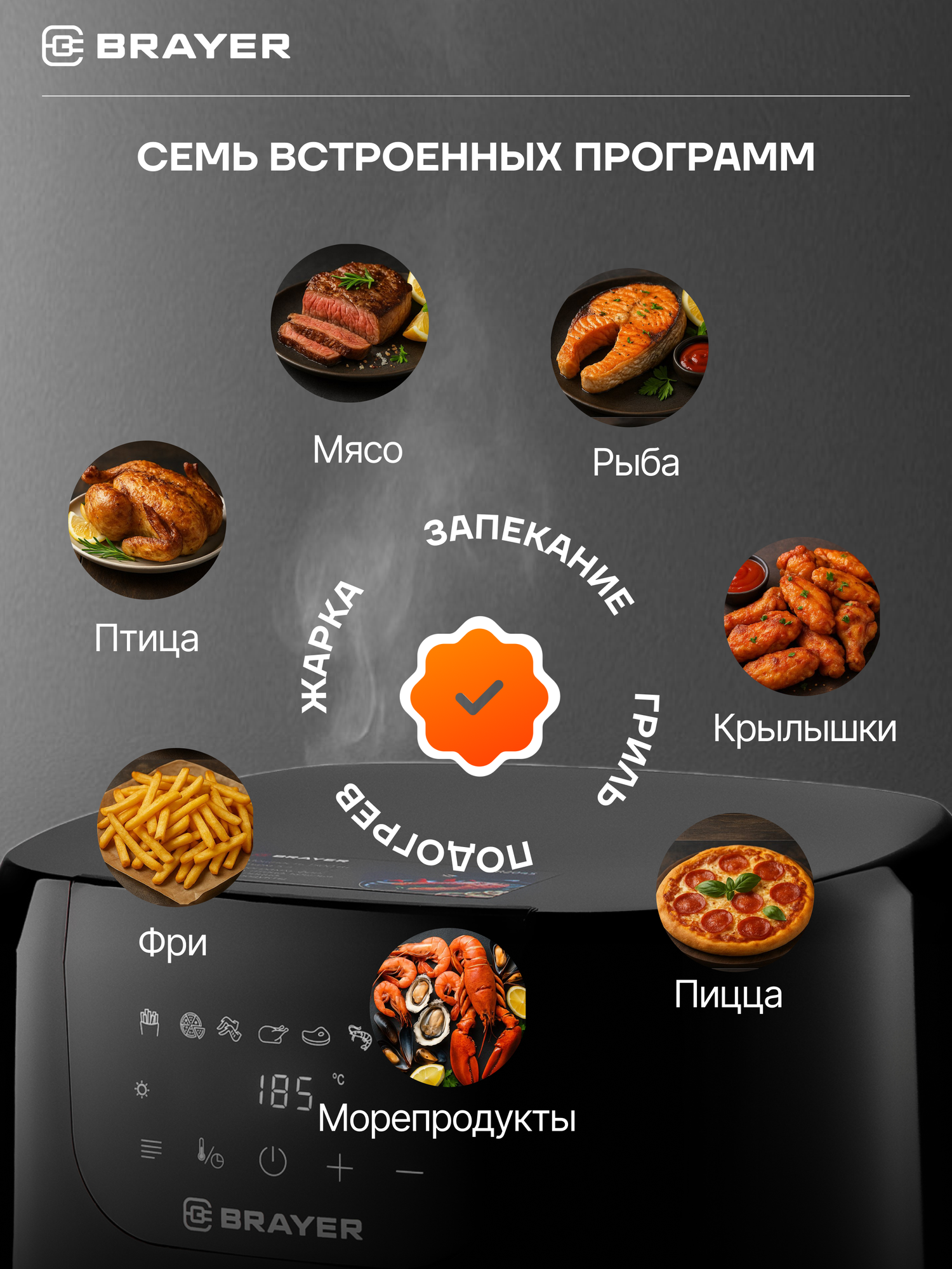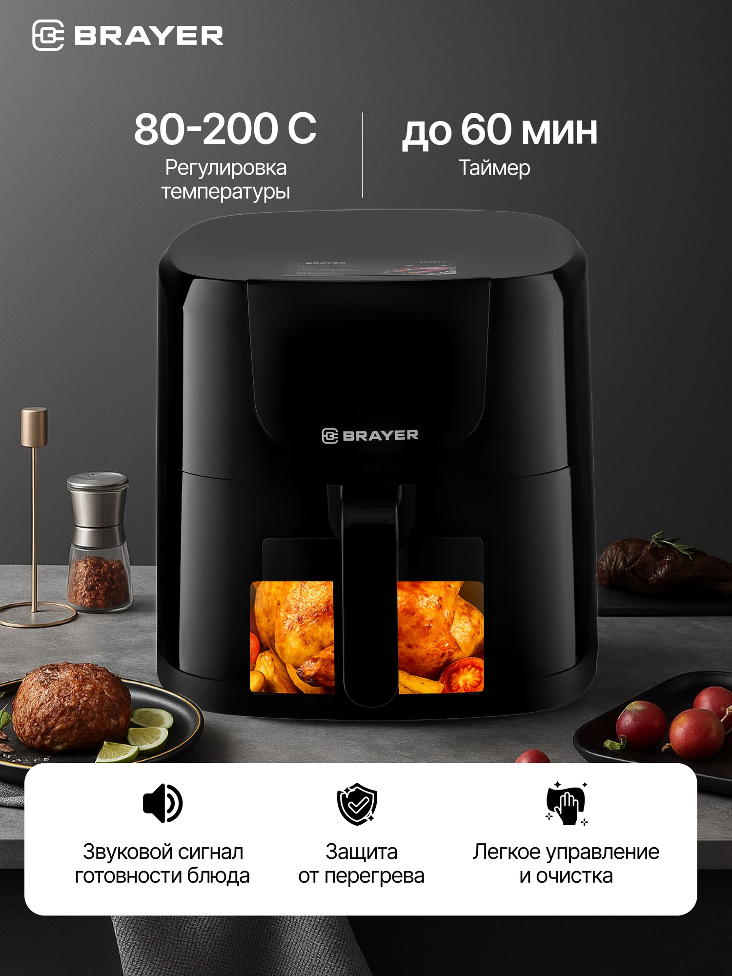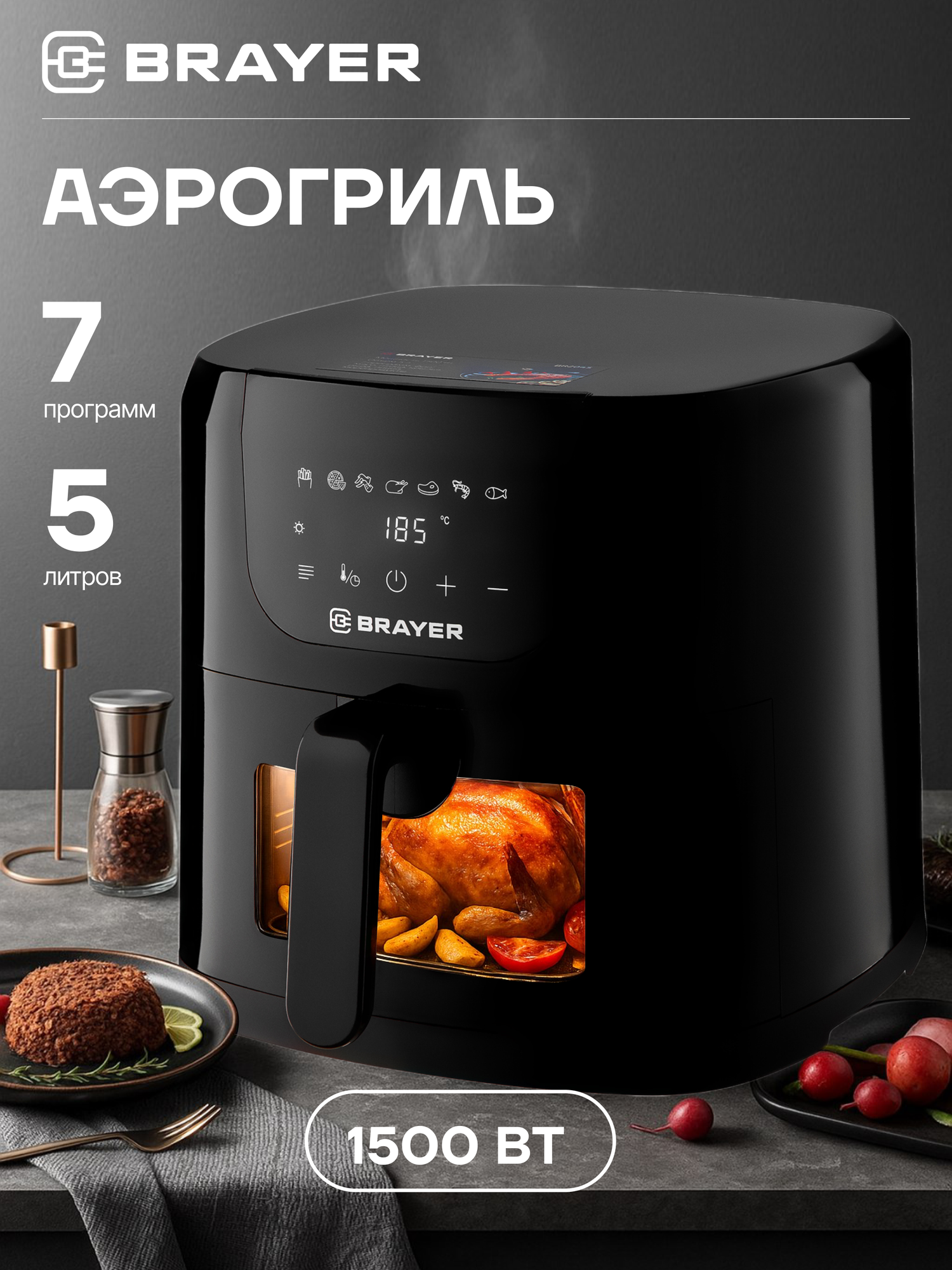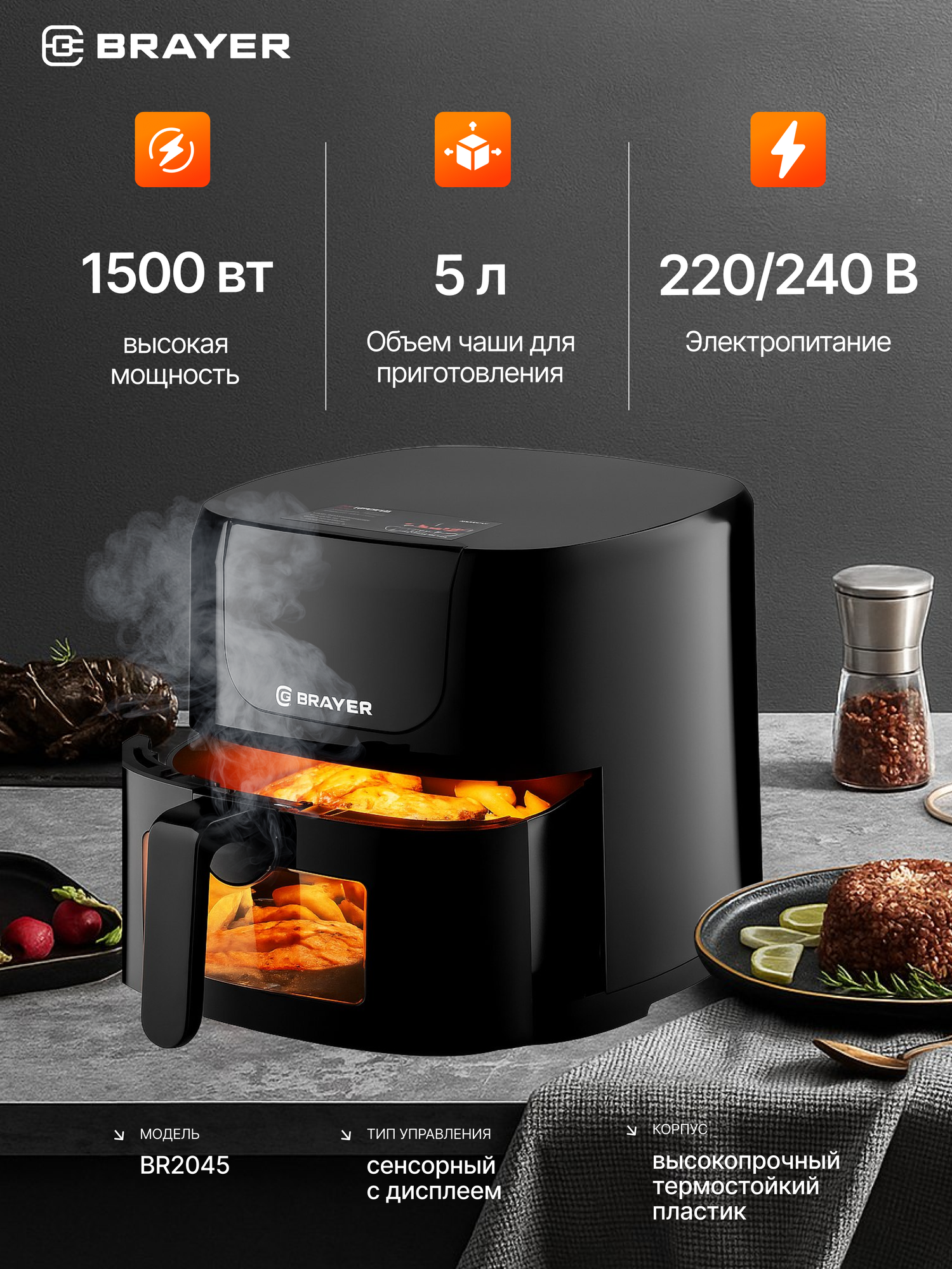 Описание Аэрогриль Brayer BR-2045 Аэрогриль BRAYER BR2045 – умный помощник для здоровой кухни Компактный и мощный аэрогриль с 7 программами приготовления! BRAYER BR2045 – это современный электрический аэрогриль с мощностью 1500 Вт, который станет вашим незаменимым помощником на кухне. С объемом 5 литров и 7 автоматическими программами он идеально подходит для приготовления разнообразных блюд без лишнего жира и масла. Ключевые преимущества: 7 предустановленных программ – от хрустящего картофеля фри до сочной пиццы Функция подогрева – сохраняет блюда горячими до подачи Антипригарная решетка – легкая очистка и идеальное приготовление LCD-дисплей с сенсорным управлением – простота использования