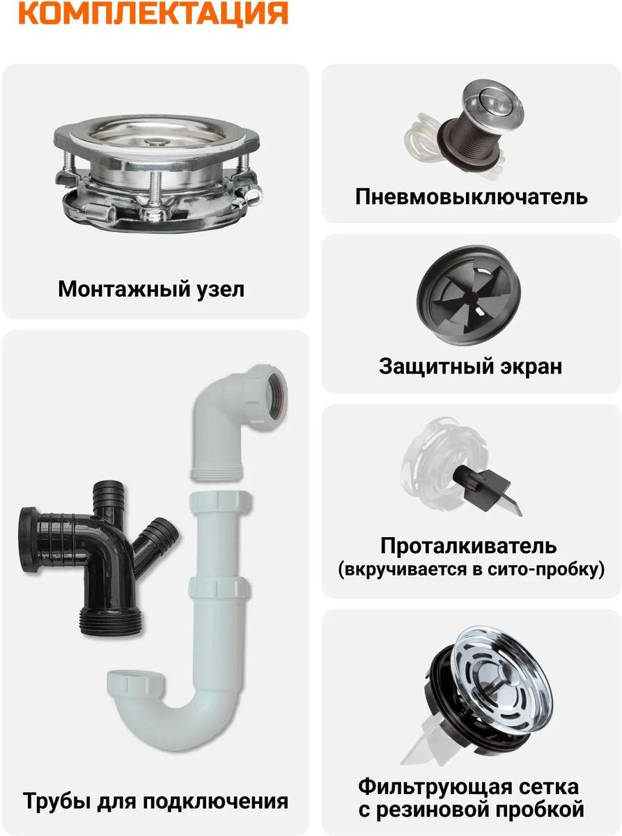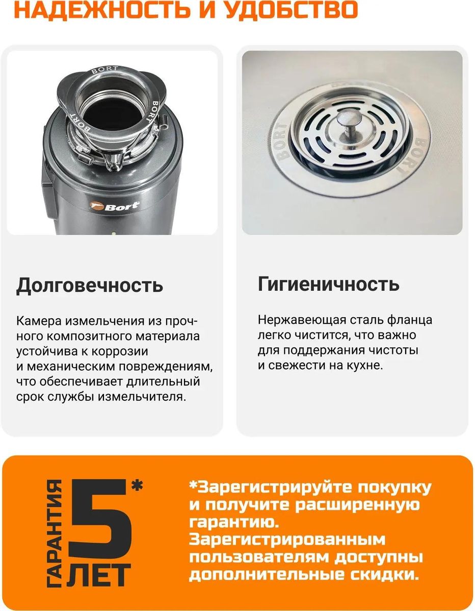 Описание Измельчитель пищевых отходов Bort Titan 8000 Измельчитель BORT TITAN 8000 - это надежный, мощный и эффективный прибор для кухни, который поможет вам заботиться об экологии, снижая объем вывоза мусора. Упрощайте бытовые задачи, делая свою жизнь комфортнее с BORT TITAN 8000! Покупая BORT TITAN 8000, вы выбираете простоту, надежность и эффективность для вашего дома. Измельчитель пищевых отходов - это современный бытовой прибор, который значительно упрощает процесс утилизации органических отходов. С мощностью 800 Вт и производительностью до 6 кг в минуту, этот измельчитель становится надежным помощником в каждой кухне. Преимущества: Современный дизайн: светодиодная полоса включается во время работы измельчителя. Трехступенчатая система измельчения: обеспечивает качественное и быстрое их переработку, независимо от типа отходов. Надежные материалы: измельчающие элементы изготовлены из нержавеющей стали, что гарантирует долговечность и эффективность работы. Шумоизоляция: полная шумоизоляция снижает уровень шума до 65 дБ, позволяя вам сохранять спокойствие во время работы. Защита от перегрузок и заклинивания: специальная система безопасности обеспечит долговечность устройства и защиту от поломок. Управление пневмокнопкой: удобное управление позволяет легко контролировать процесс измельчения. Подключение к посудомоечной машине: упрощает процесс очистки и обеспечивает дополнительное удобство в использовании. Удобство и экономия времени: измельчитель позволяет быстро и легко избавляться от пищевых отходов, избегая необходимости их сортировки и утилизации. Это экономит время при приготовлении пищи и уборке, так как все отходы можно просто отправить в раковину. Снижение запахов: отходы, оставленные на кухне, могут источать неприятные запахи. Измельчитель помогает сократить количество мусора и снизить риск появления неприятных ароматов, так как отходы утилизируются сразу же. Экология: подключая измельчитель к канализации, вы помогаете уменьшить объем мусора, отправляемого на свалки.