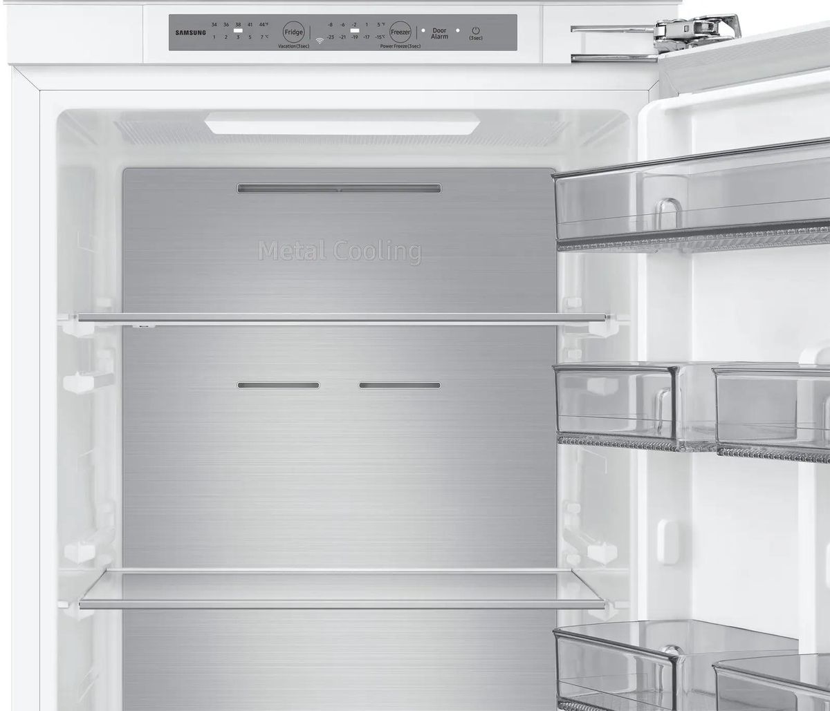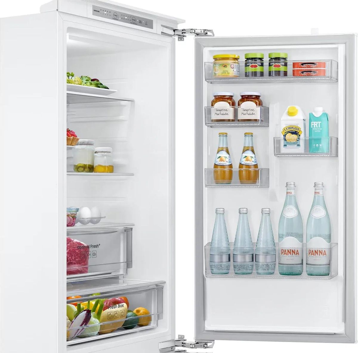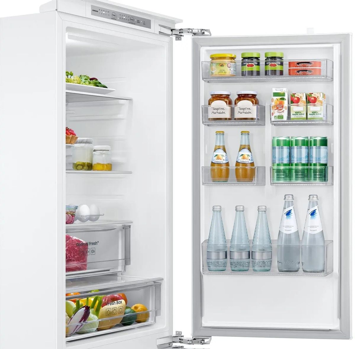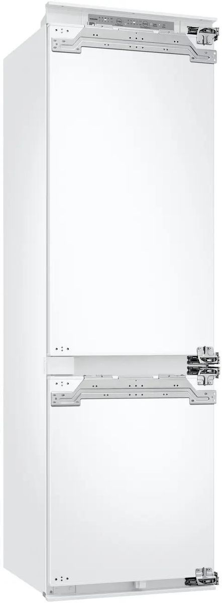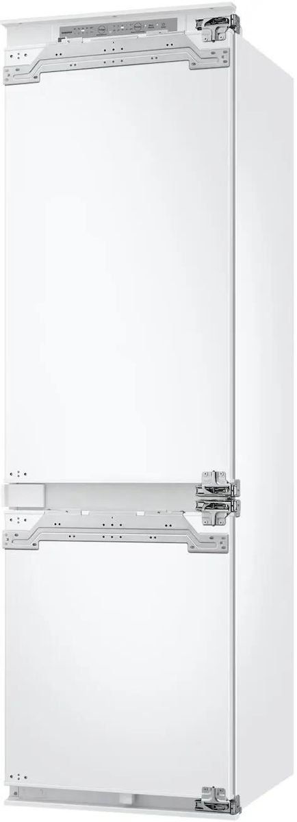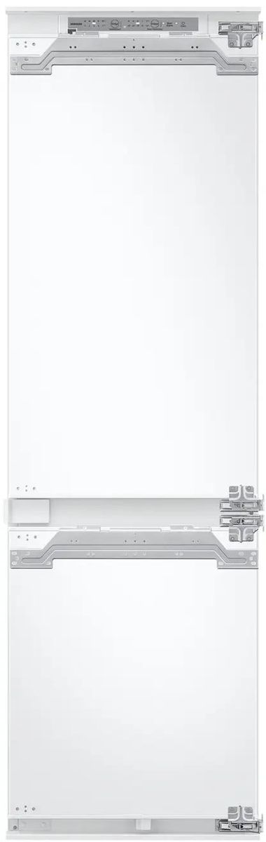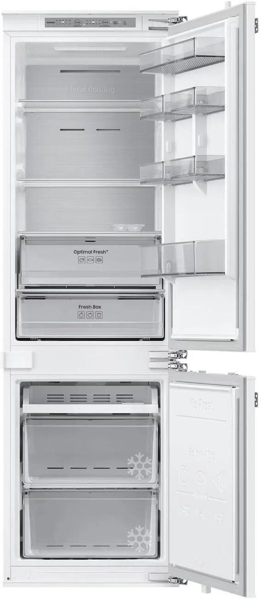 Описание Встраиваемый холодильник Samsung BRB80F26DEF0EO Холодильник Samsung BRB80F26DEF0EO — просторное и функциональное устройство для хранения продуктов. С двумя камерами и двумя контурами охлаждения он обеспечивает идеальные условия для свежести продуктов. Некоторые особенности холодильника: Система охлаждения All-Around Cooling равномерно распределяет холодный воздух по всей внутренней части холодильника. Это позволяет еде поддерживать стабильную температуру и дольше оставаться свежей. Отдельный ящик Optimal Fresh+ подходит для хранения мяса и рыбы. Он сохраняет их при более низкой температуре, чем в остальной части холодильника (температура ниже на 1 градус), чтобы они были свежими и сохраняли свой собственный вкус. В холодильном отделении предусмотрено пять стеклянных полок, что позволяет гибко организовать пространство для хранения различных продуктов. Два вместительных ящика слева предназначены для овощей и фруктов, а отделение Extra Fresh способствует длительному сохранению их свежести. В нижней части располагается морозильное отделение с тремя прозрачными пластиковыми ящиками, каждый из которых подписан как FreshZone и отмечен символами снежинки, что подчёркивает их предназначение для хранения замороженных продуктов. Дизайн холодильника выполнен в классическом белом цвете с глянцевой поверхностью дверцы, что придаёт устройству современный и универсальный внешний вид. Металлические ручки обеспечивают надёжное и комфортное открытие дверей. На верхней грани холодильного отделения расположена сенсорная панель управления с кнопками, отвечающими за различные функции устройства. Это позволяет легко настраивать температуру и режимы работы, делая эксплуатацию интуитивно понятной и удобной для пользователя.