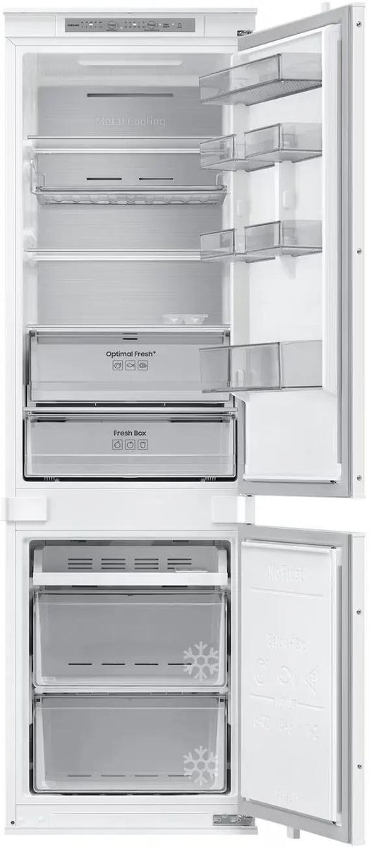 Описание Встраиваемый холодильник Samsung BRB80F26CES0EO No Frost Технология No Frost предотвращает образование наледи на стенках холодильника и обеспечивает поддержание постоянной температуры в каждом уголке камеры. Кроме того, эта система ускоряет охлаждение рабочих камер, благодаря чему уменьшаются затраты электроэнергии на охлаждение. Технология SpaceMax™ Храните больше продуктов с помощью технологии SpaceMax™, которая позволяет добиться большего полезного внутреннего объема, благодаря тонким стенкам с теплоизоляцией, при этом не снижая энергоэффективность холодильника Технология CoolSelect+ Используйте пространство как вам захочется с помощью CoolSelect Plus. Одним касанием можно настроить температуру для разного типа продуктов, Холодильник (2℃), Зона свежести (-1℃), Мягкая заморозка (-5℃) или Заморозка (-15~-23℃) в зависимости от потребности. Зона свежести Зона свежести (Fresh Zone) представляет собой выдвижной ящик, в котором создаются две температурные зоны. Левая сторона может быть холоднее, тем самым создаются лучшие условия для мяса и рыбы. Правая сторона великолепно подходит для хранения овощей и фруктов. Metal Cooling Металическая панель Metal Cooling на задней стенке холодильника дает дополнительный источник холода и делает внутреннее пространство еще более стильным. Благодаря действию панели даже при частом открывании дверцы холод в камере удерживается дольше, а оптимальная температура восстанавливается быстрее Настраиваемые дверные полки Храните больше продуктов в дверных карманах, не тратя пространство внутри полок. Широкие и глубокие дверные карманы позволят безопасно хранить больше бутылок, картонных пакетов и других объектов в постоянном доступе без необходимости брать их с полки. Цифровой инвертер Инверторный компрессор автоматически регулирует скорость работы в зависимости от выбора одного из семи уровней мощности охлаждения. В результате холодильник потребляет меньше электроэнергии, работает тихо и служит долго*. * 10 лет гарантии распространяется только на цифровой инвертер. Полка EasySlide в морозильнике Выдвижная полка в морозильной камере облегчит поиск и доступ к замороженным продуктам. Таким образом вы сможете легко и быстро найти продукты, находящиеся у задней стенки или в углах рабочей камеры. Никаких “мертвых зон”. Энергоэффективность Инверторный компрессор автоматически регулирует скорость работы в зависимости от потребности охлаждения. В результате холодильник потребляет меньше электроэнергии, работает тихо (35 дБ) и служит долго. Еще больше места для бутылок Улучшенное использование пространства холодильника с функциональной винной полкой. Продуманный дизайн с широкой выемкой позволяет хранить даже бутылки из-под шампанского, а плоская форма полок может быть использована для хранения других продуктов, например, коробок для яиц. Быстрое охлаждение и заморозка Воспользуйтесь опцией быстрого охлаждения, которая помогает быстрее охладить любые продукты. Быстрая заморозка за счет интенсивного потока холодного воздуха позволяет быстрее производить лед и осуществлять глубокую заморозку.