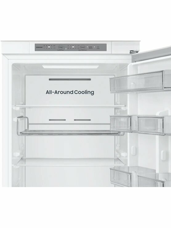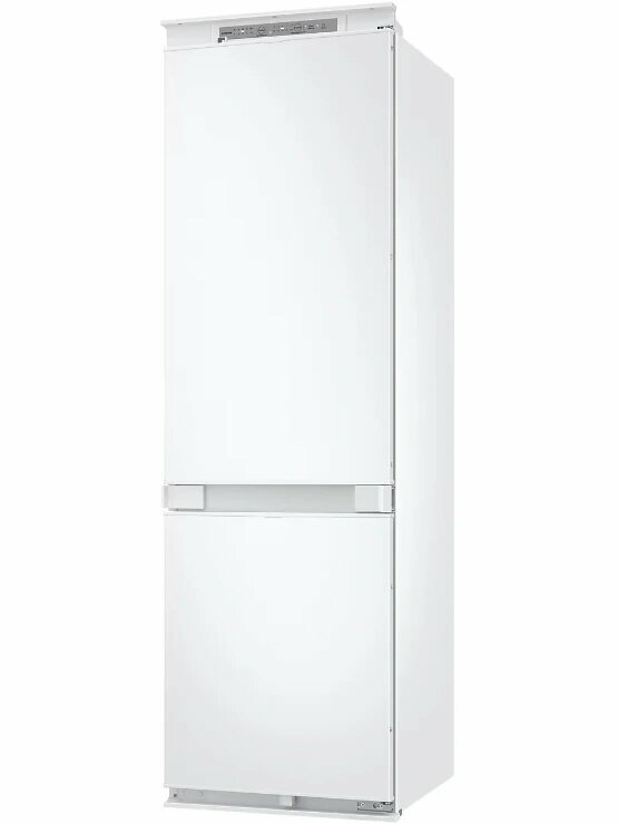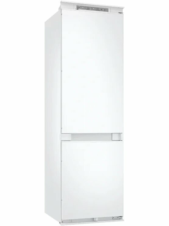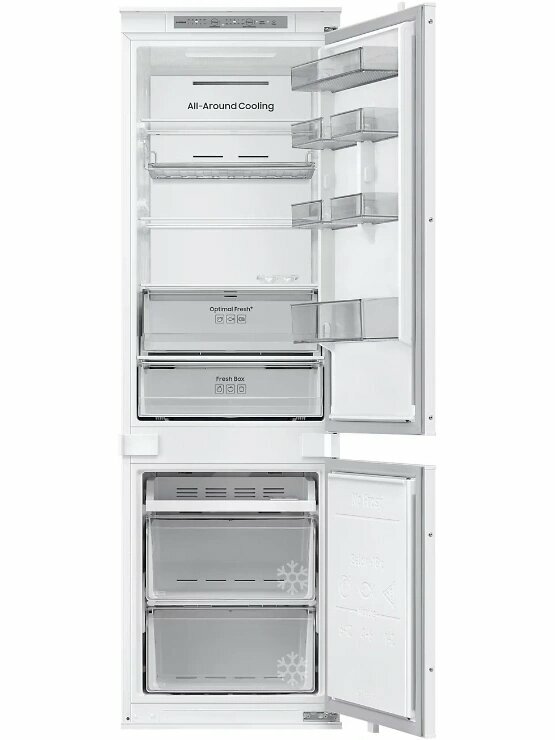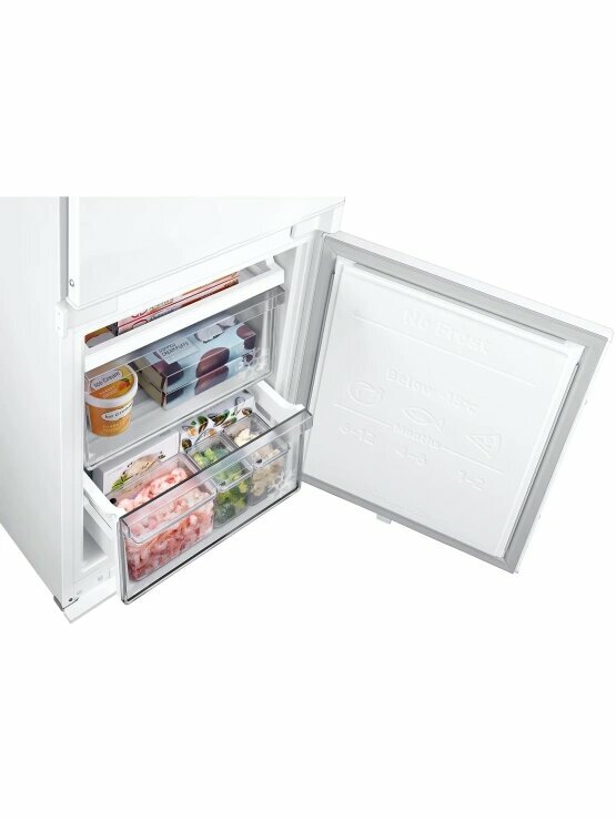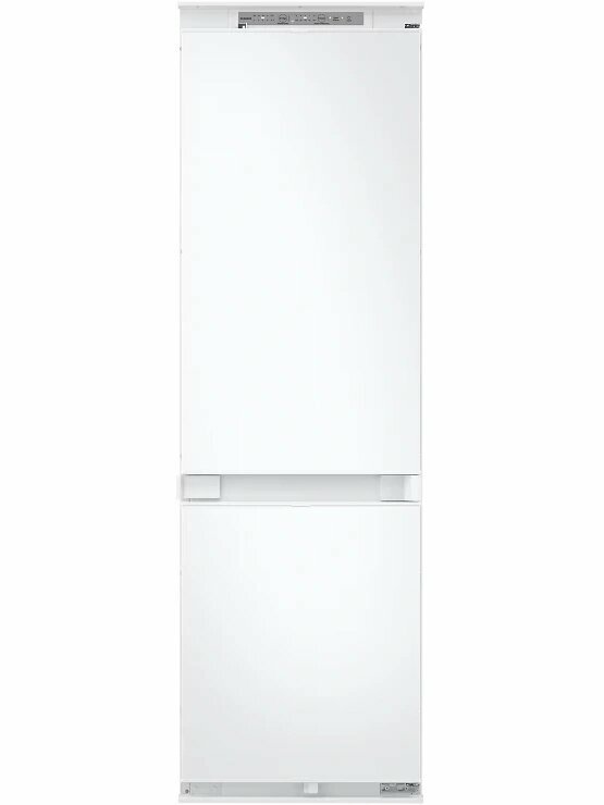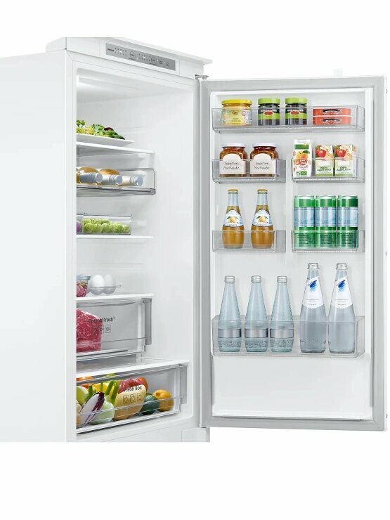 Описание Встраиваемый холодильник Samsung BRB70F26CES0EO Встраиваемый холодильник Samsung BRB70F26CES0EO сочетает двухкамерную конструкцию с технологией No Frost, которая снижает образование наледи. Объём 267 литров подходит для семьи среднего размера. Пространство и хранение продуктов Общий объём холодильника — 267 л: 193 л занимает холодильная камера, 74 л — морозильная. В холодильной камере расположены три стеклянные полки, семь полок на дверце и два ящика, включая зону свежести для овощей и фруктов. Морозильная камера оснащена одной полкой и двумя ящиками, что упрощает сортировку замороженных продуктов. Такой набор создаёт условия для хранения разнообразных продуктов и поддержания порядка. Управление и функции Управление происходит с помощью сенсорной панели внутри с индикацией температуры. Функции суперзаморозки и суперохлаждения ускоряют охлаждение и заморозку. Технология No Frost в обеих камерах устраняет необходимость ручного размораживания и снижает образование льда. Антибактериальное покрытие уменьшает размножение бактерий, улучшая гигиену хранения. Интеграция и эксплуатация Модель полновстраиваемая с направлением открывания двери вправо, что даёт возможность встроить её в кухонный гарнитур без нарушения стиля. Перевешиваемые двери и регулируемые по высоте ножки упрощают установку и подгонку под нишу. Внутренняя LED-подсветка создаёт освещение камер, облегчая поиск продуктов. Уровень шума 35 дБ снижает звуковое воздействие в жилых помещениях. Энергоэффективность и технические характеристики Холодильник относится к европейскому классу энергопотребления E с расходом 231 кВт·ч в год. Хладагент R600a обеспечивает охлаждение с минимальным воздействием на окружающую среду. Мощность замораживания достигает 6 кг в сутки, а при отключении питания продукты сохраняют состояние до 6 часов. Один компрессор поддерживает заданные параметры температуры.