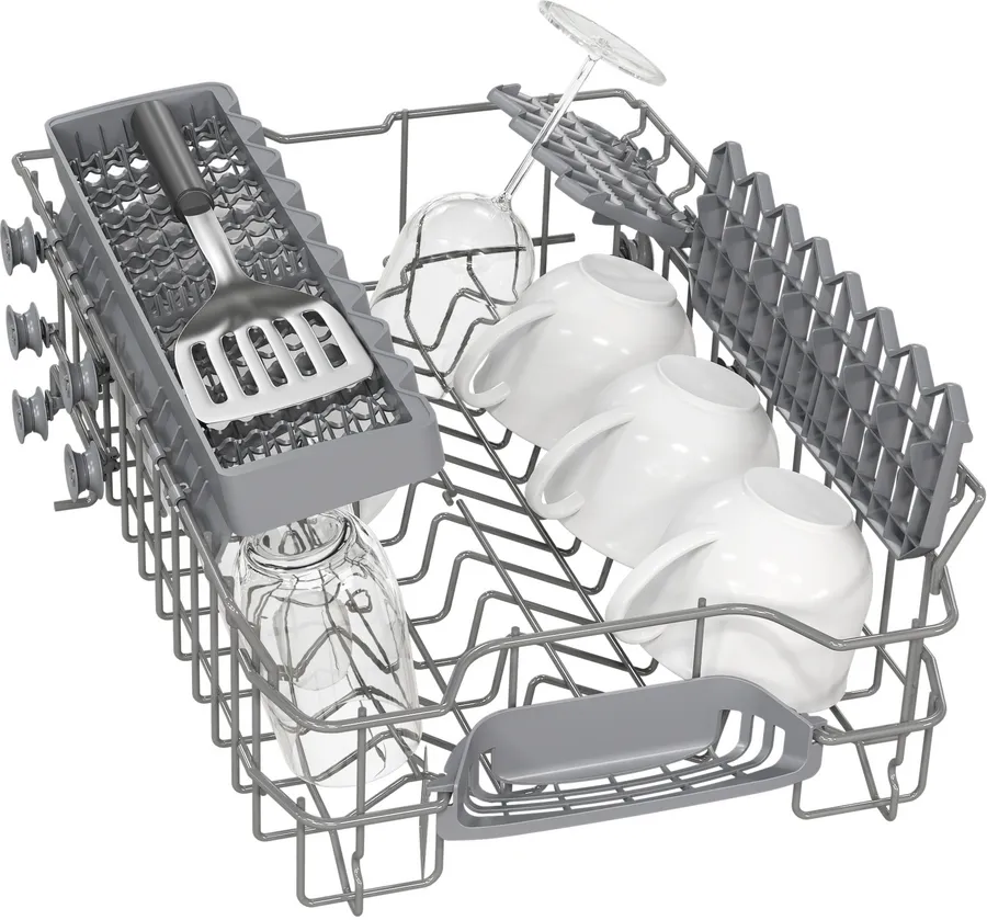 Описание Встраиваемая посудомоечная машина Bosch SPV 2IKX01Q Встраиваемая посудомоечная машина Bosch SPV2IKX01Q создана для компактных кухонь и аккуратно интегрируется в мебельный ряд, занимая минимальную площадь без ущерба практичности. Черная панель управления стильно контрастирует с фронтальной поверхностью, а закрытая панель сохраняет лаконичный внешний вид при закрытой дверце и упрощает меблировку. Двухкорзинная компоновка с верхним отсеком, оборудованным двумя полочками для чашек, и нижней корзиной с ячейками и складными направляющими для тарелок обеспечивает гибкость при расстановке посуды, а корзина для столовых приборов упрощает загрузку приборов и ускоряет подготовку к мойке. Интеллектуальная электроника и инверторный двигатель iQdrive делают работу тихой и энергоэффективной: уровень шума всего 48 дБ при расходе воды 9,5 л на цикл и среднем энергопотреблении 0,787 кВт·ч за программу. Благодаря системе ActiveWater вода распределяется по пять уровней, что увеличивает покрытие и снижает потери, а класс мытья и сушки — A — подтверждают высокую эффективность обработки. Серия 2 сочетает базовую функциональность с продуманной автоматикой, позволяющей получить стабильный результат при разных типах загрязнений. Пользователь получает девять стандартных программ и четыре температурных режима с возможностью быстрой обработки на 45 °C и 65 °C; доступны экономичная и интенсивная опции, режим половинной загрузки и «Моя программа» для сохранения индивидуальных настроек. Дополнительные режимы HygienePlus и IntensiveZone усиливают дезинфекцию и мощность на нижней полке соответственно, а функция Machine Care поддерживает внутреннюю гигиену и продлевает срок службы агрегата. Самоочистка фильтра облегчает уход, уменьшает необходимость частого ручного вмешательства и сохраняет стабильность расхода воды. Панель с дисплеем и кнопками удобна и понятна: индикаторы наличия ополаскивателя, соли и времени до окончания программы помогают контролировать процесс, таймер отсрочки запуска от 1 до 24 часов предоставляет гибкость расписания, а сигнал окончания оповещает о готовности посуды. Поддержка Home Connect открывает дополнительные сценарии управления: удалённый запуск через приложение на смартфоне, мониторинг хода и получение уведомлений делают эксплуатацию более удобной и позволяют запускать циклы при благоприятных тарифах на электроэнергию. Монтаж не требует сложных решений: машина встраивается в нишу высотой 81,5–87,5 см, шириной 45 см и глубиной 55 см, что отвечает стандартным требованиям для узких моделей; задние ножки регулируются по высоте спереди, а комплект шлангов и сетевой кабель достаточной длины облегчают подключение. Максимальная температура воды на входе 60 °C, полная система AquaStop обеспечивает защиту от протечек, а электропараметры и предохранители соответствуют диапазону 220–240 В, 50–60 Гц и 10 А соответственно. Лёгкая установка и продуманные габариты делают прибор удобным решением для семей и квартир с ограниченным пространством. Технические характеристики — компактные, но функциональные: мощность до 2400 Вт, вес 26,2 кг, глубина 55 см и ширина 44,8 см, позволяющие разместить аппарат в плотном интерьере без риска выступающих частей; длина подводящего шланга 1,65 м, отводящего 2,05 м и кабеля 1,75 м обеспечивают запас для подключения к коммуникациям. Набор стандарт