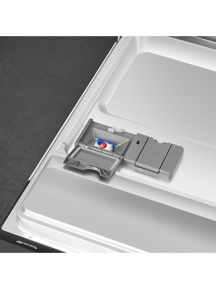 Описание Встраиваемая посудомоечная машина Smeg STL262D Встраиваемая посудомоечная машина Smeg STL262D — это превосходное сочетание функциональности и эстетики. Ее черный цвет и соответствующая панель управления добавляют изысканности и стиля в любую кухню. Произведенная в Польше, эта модель является частью основной линейки данного бренда, заслужившей доверие потребителей по всему миру. Способная загрузить до 13 комплектов посуды, техника обеспечивает эффективность и удобство использования. Она оснащена восьмью стандартными программами, включая замачивание, интенсивную и быструю мойку, а также режимы для стекла и экономичного использования. Это обеспечивает гибкость в выборе оптимального режима для каждого типа посуды и степени загрязнения. Система управления кнопками и LED-дисплей делают посудомойку простой и интуитивно понятной в использовании. Дисплей отображает время до окончания цикла и позволяет программировать отсрочку включения от 1 до 24 часов. Автоматическое споласкивание при отсрочке старта гарантирует, что посуда будет чистой и свежей, когда вы ее заберете. Внутренняя камера из нержавеющей стали и система мойки со стандартным верхним разбрызгивателем обеспечивают надежность и долговечность. Скрытый нагревательный элемент, электронная регулировка смягчения воды и система WaterSave для экономии воды делают эту модель энергоэффективной и экологически дружелюбной. Ключевые преимущества: Многофункциональность: 8 программ мойки для различных типов посуды Энергоэффективность: класс энергопотребления A+++/D и система WaterSave Удобство использования: интуитивное управление кнопками и LED-дисплей